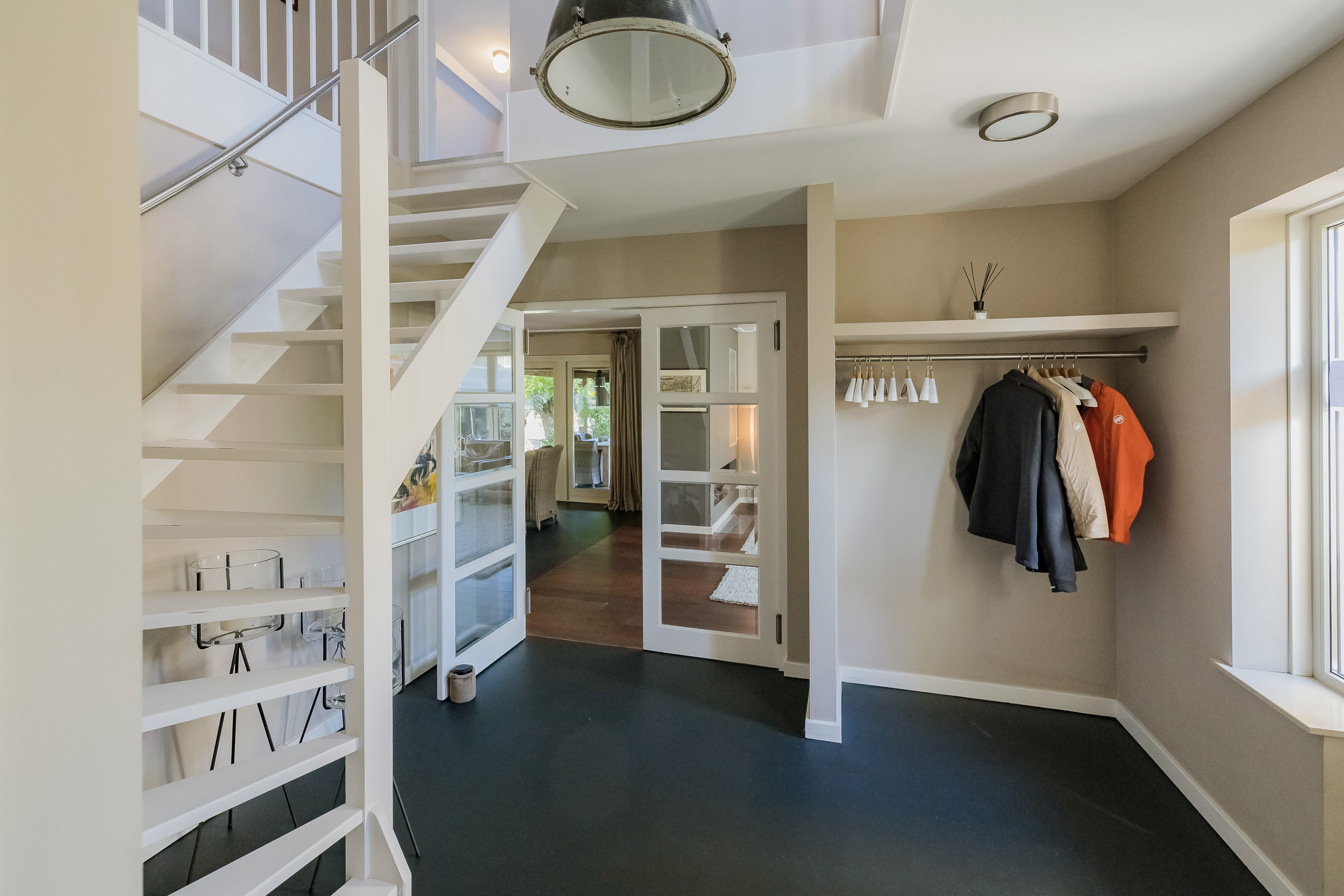Je komt binnen in een mooie hal met vide, die meteen een gevoel van ruimte geeft. Hier vind je de garderobe, het toilet, de trap en toegang tot de woonkamer.