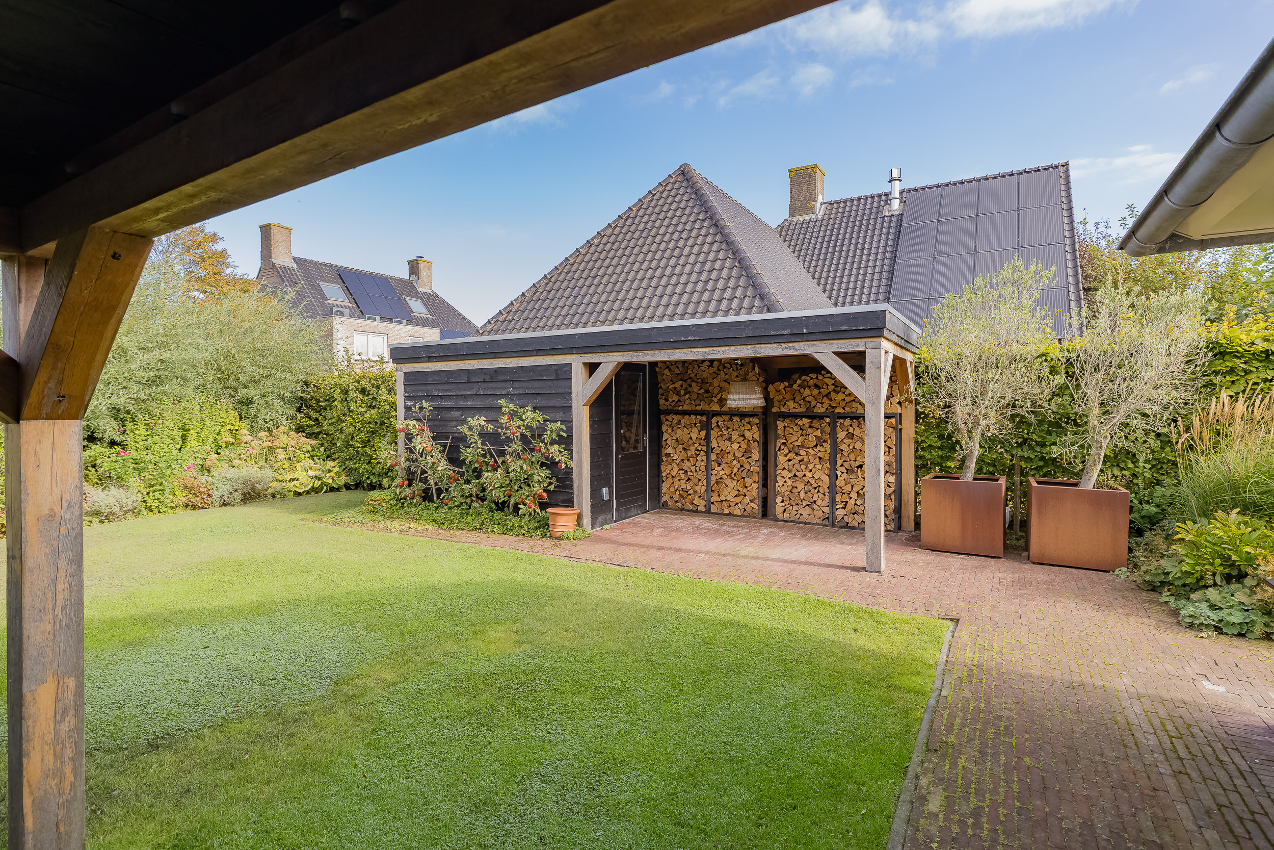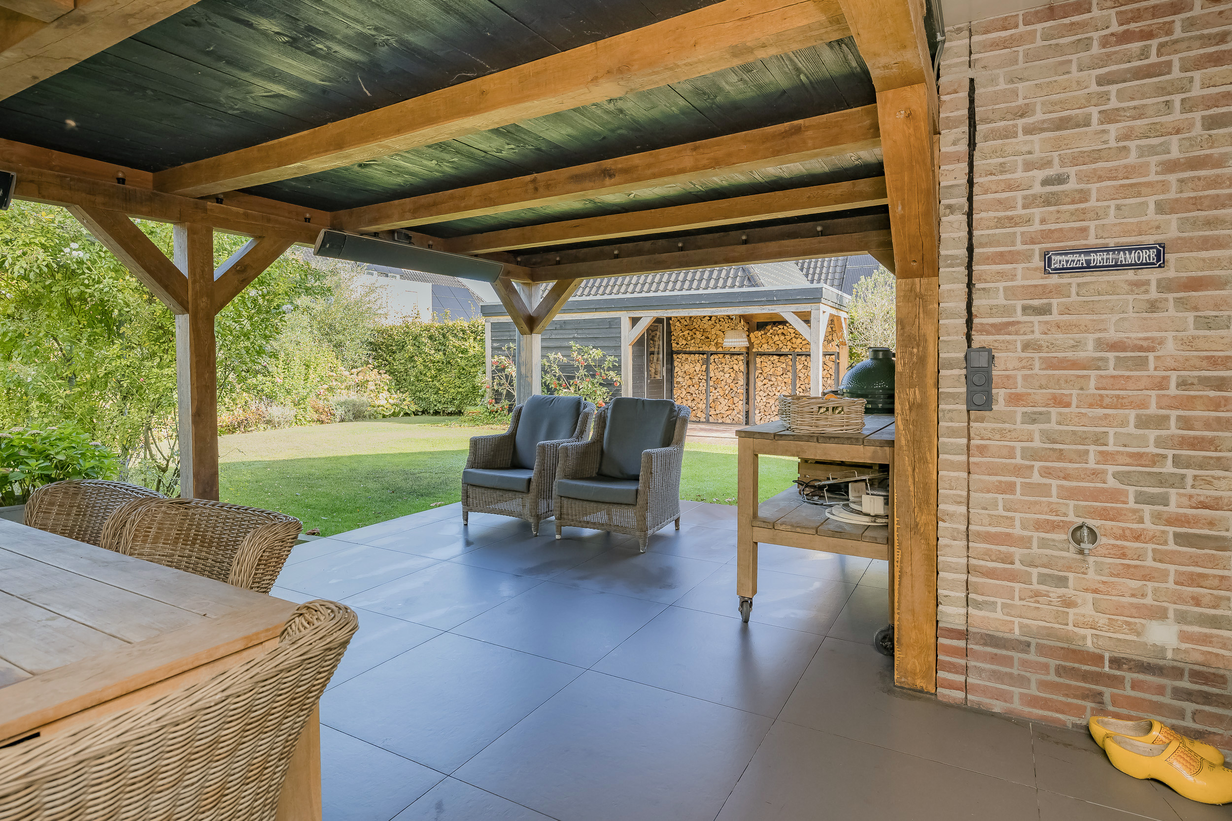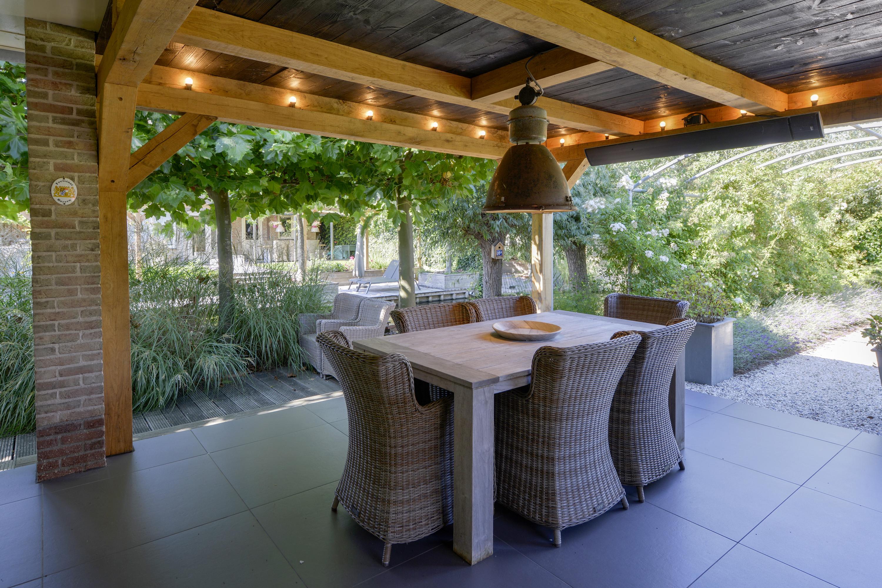 Rondom de villa ligt een fraai aangelegde tuin met volop privacy, een grote rozenboog, een tuinhuis met overkapping én een prachtige eikenhouten veranda. Hier geniet je het hele jaar door van het buitenleven; een fraaie uitbreiding van de woonkamer.