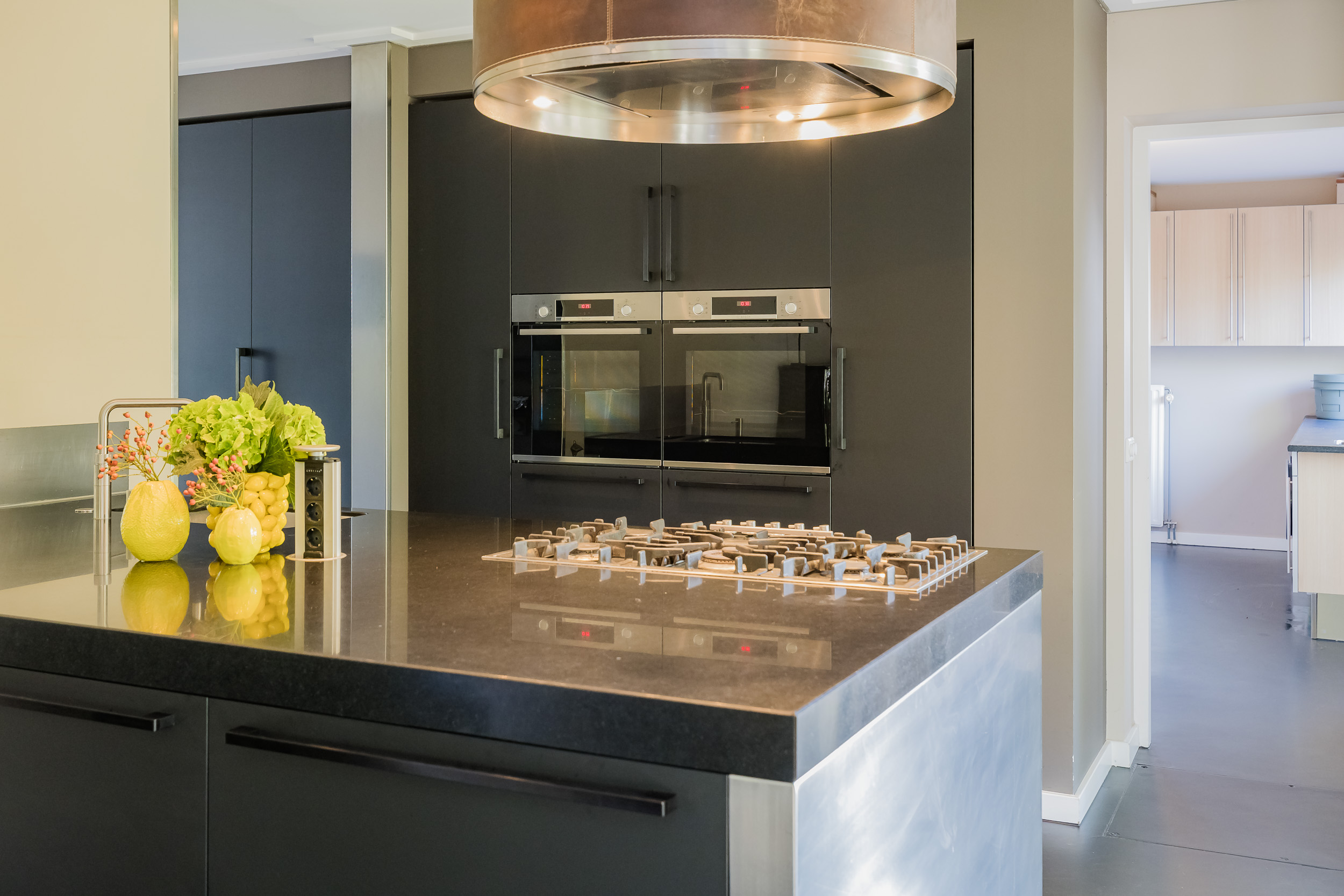 De moderne open keuken met kook/spoeleiland is compleet ingericht met hoogwaardige Miele- en Bosch-apparatuur, waaronder twee ovens, een grote vrieskast en een grote koelkast. Extra fijn: de keuken is vergroot door een kamer erbij te trekken, die is voorzien van een extra RVS werkblad met spoelbak.
