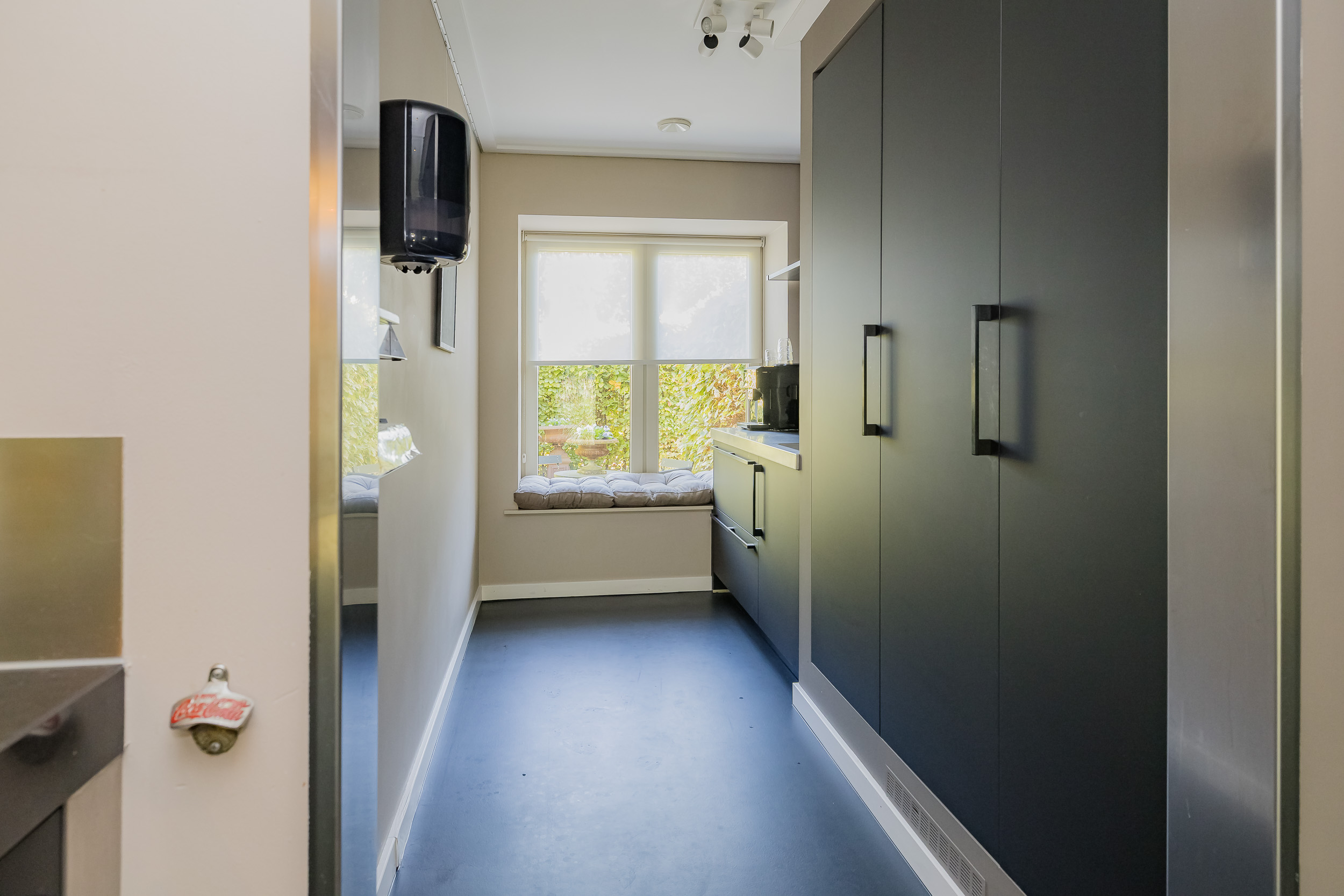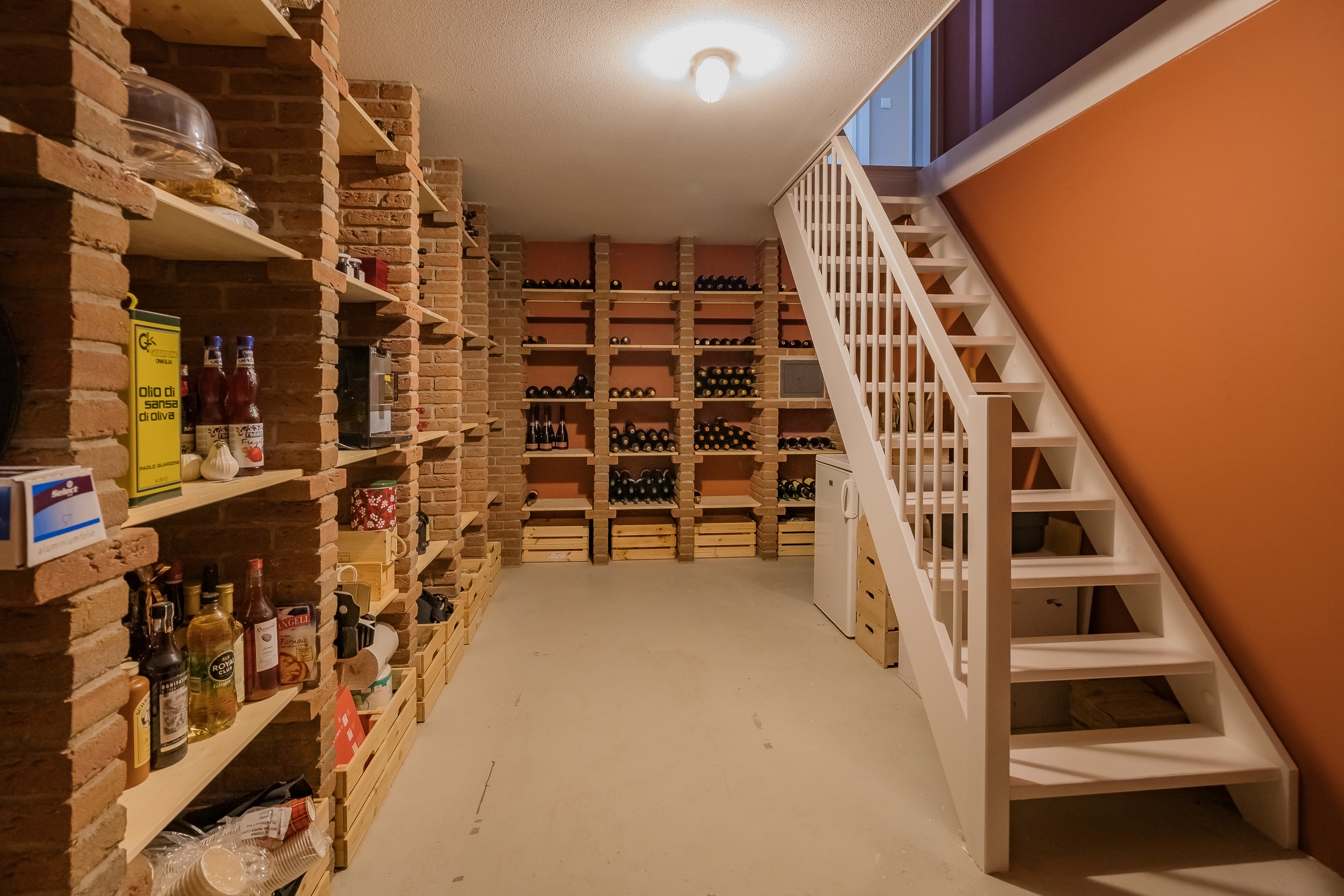 Naast de keuken ligt de praktische bijkeuken die is voorzien van een keukenblok met spoelbak en hier zijn ook de aansluitingen voor de wasmachine en droger. Van hieruit is er toegang tot de garage en het vlonderterras met aanlegplaats. Via een vaste trap bereik je de ruime, droge kelder (2,29 m hoog!), ideaal als extra opslagruimte of wijnkelder.