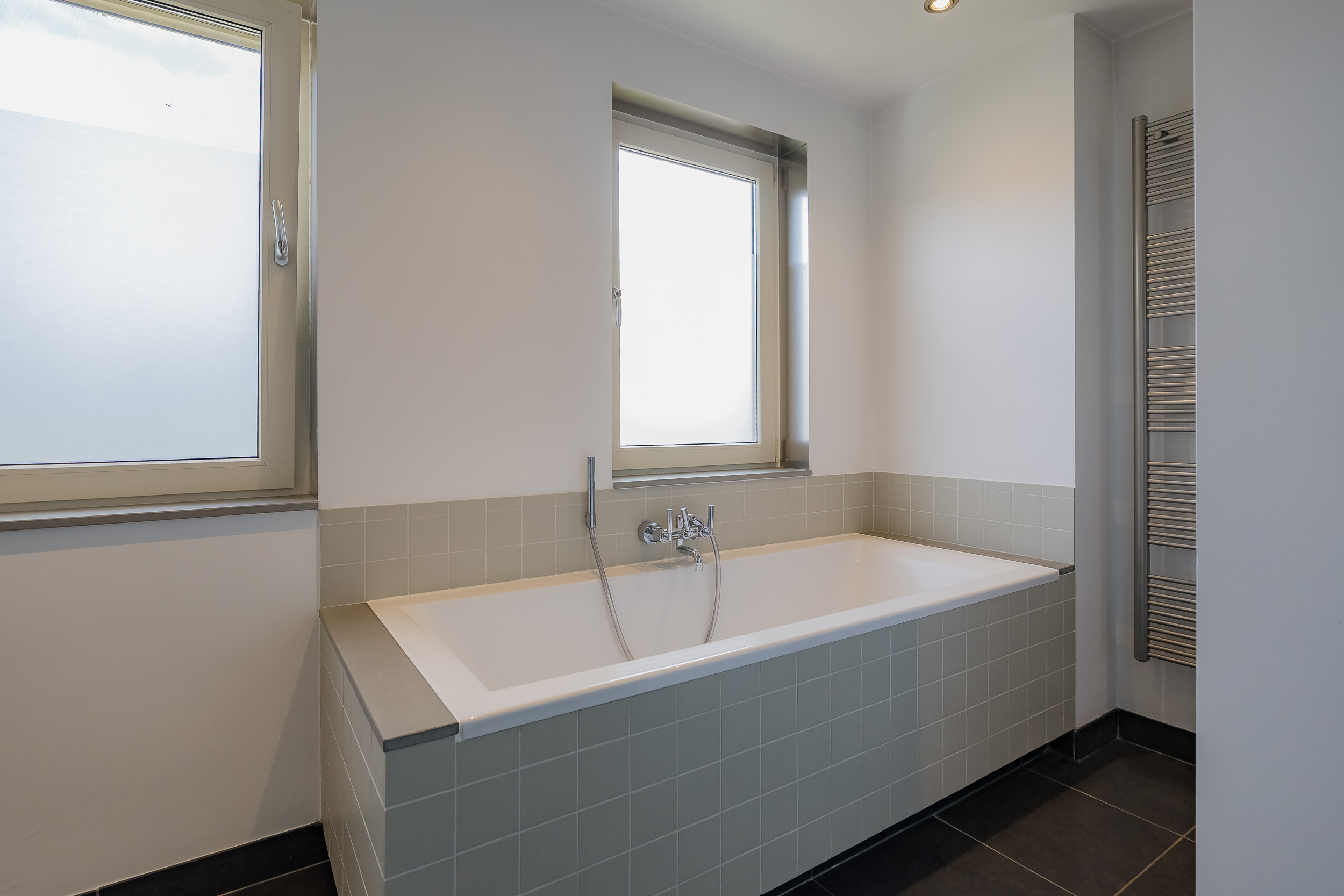 De badkamer is luxe uitgevoerd met een ligbad, inloopdouche en dubbele wastafel met meubel. Op de overloop is een aparte toiletruimte.