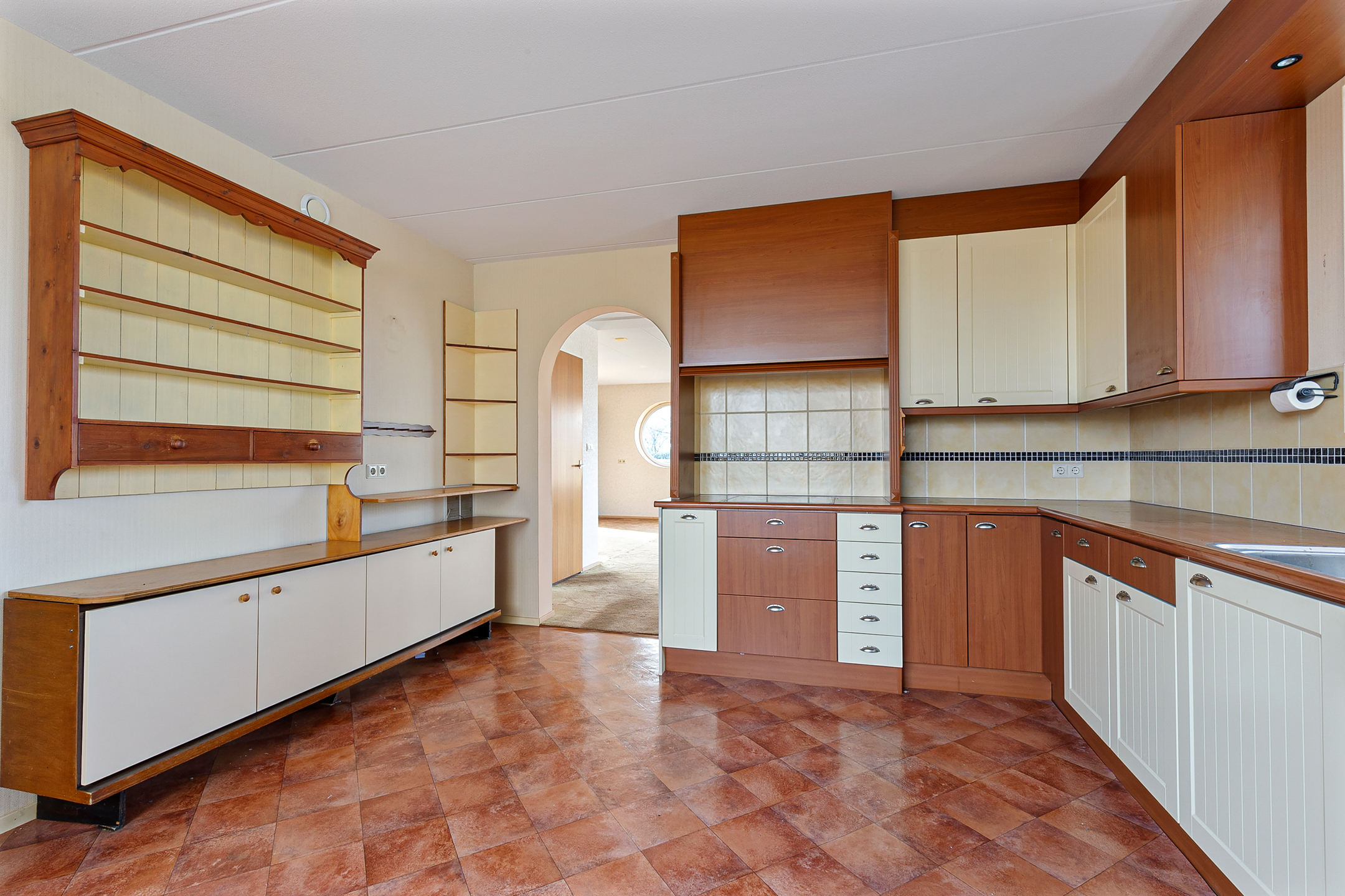 De ruime woonkeuken is voorzien van inbouwapparatuur en een sfeervolle erker met uitzicht over de tuin en weilanden. Verder vindt u op de begane grond een bijkeuken, een royale slaapkamer met tuindeuren, een badkamer met toilet, wastafel en douche, alsmede toegang tot de inpandige garage.