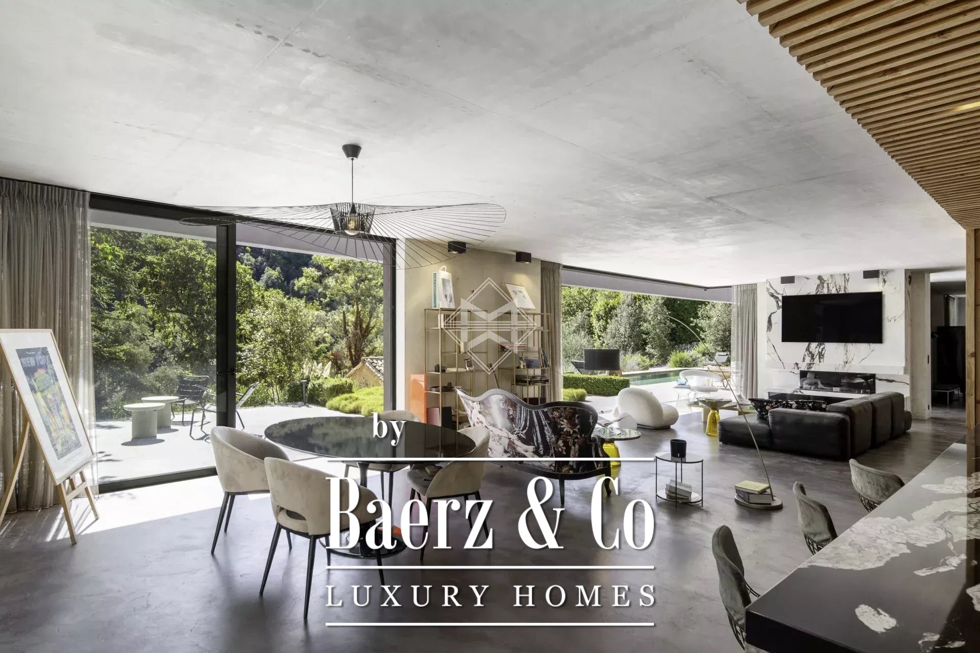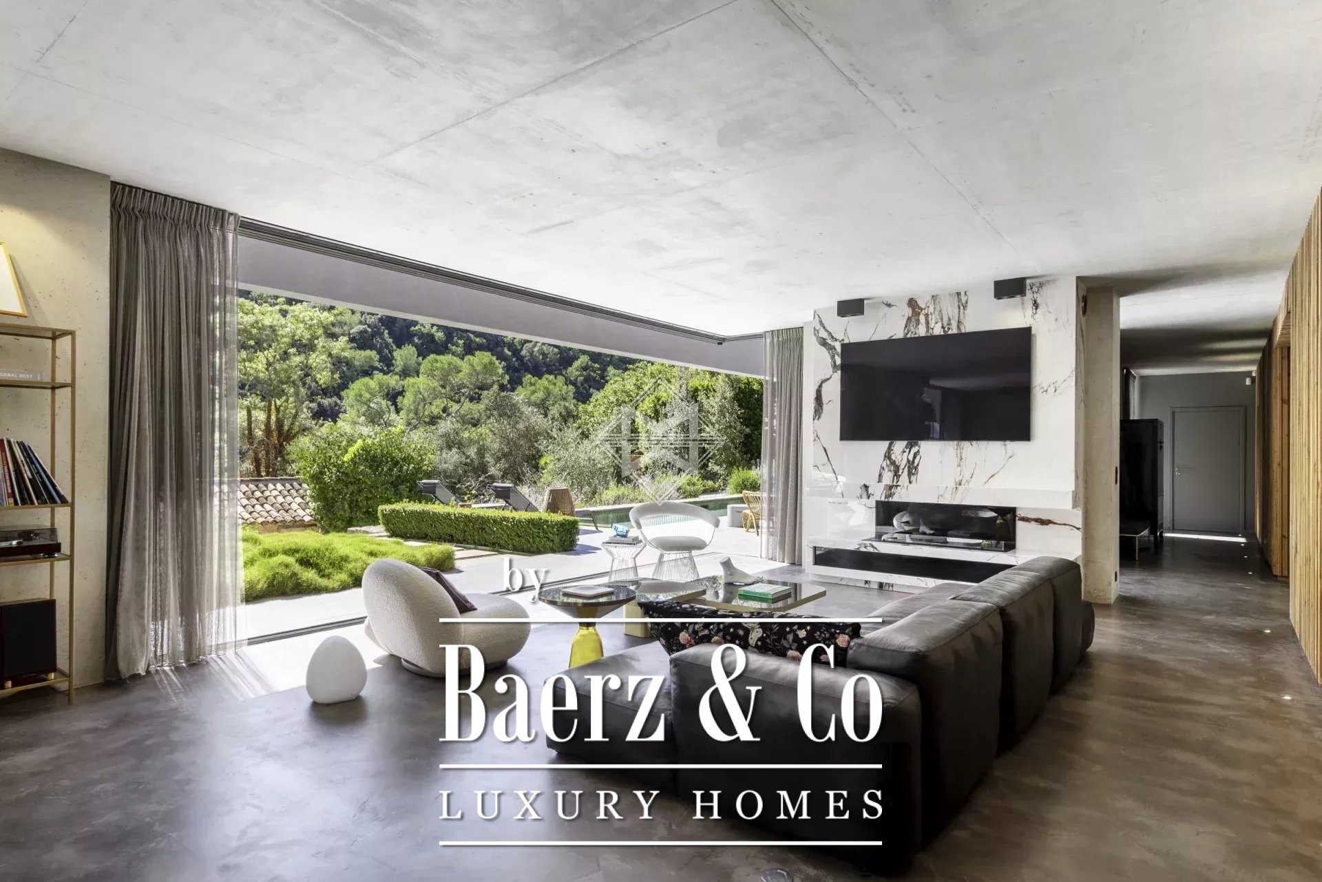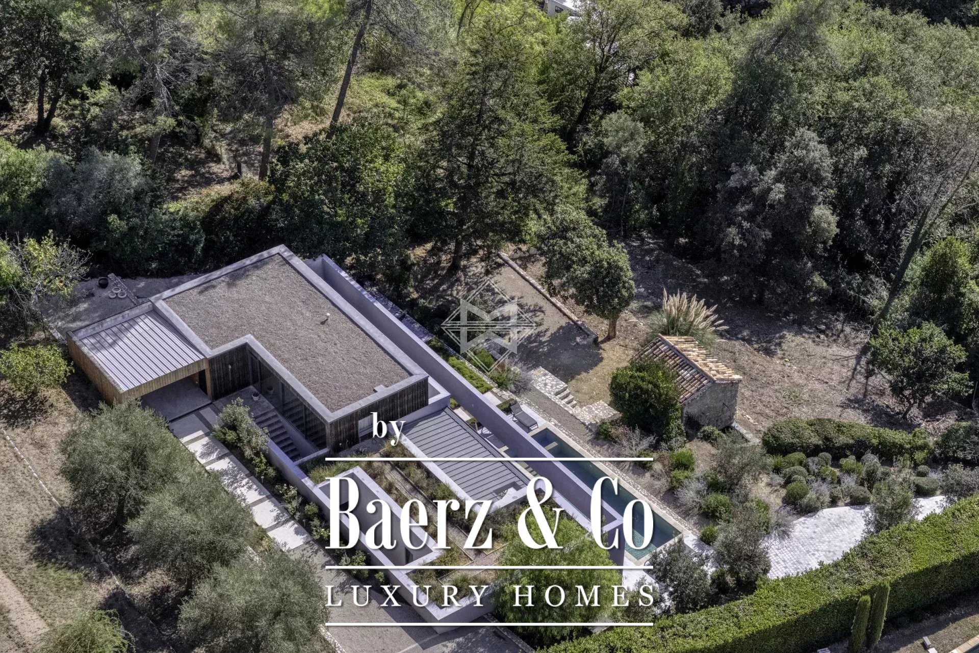 At the foot of the village of Valbonne, nestled in a preserved haven of greenery, this exceptional contemporary architect-designed home masterfully blends modern design, tranquility, and nature. It is surrounded by a stunning setting of lush forest and a meticulously landscaped garden inspired by the "English Garden" style — a true invitation to serenity and privacy.