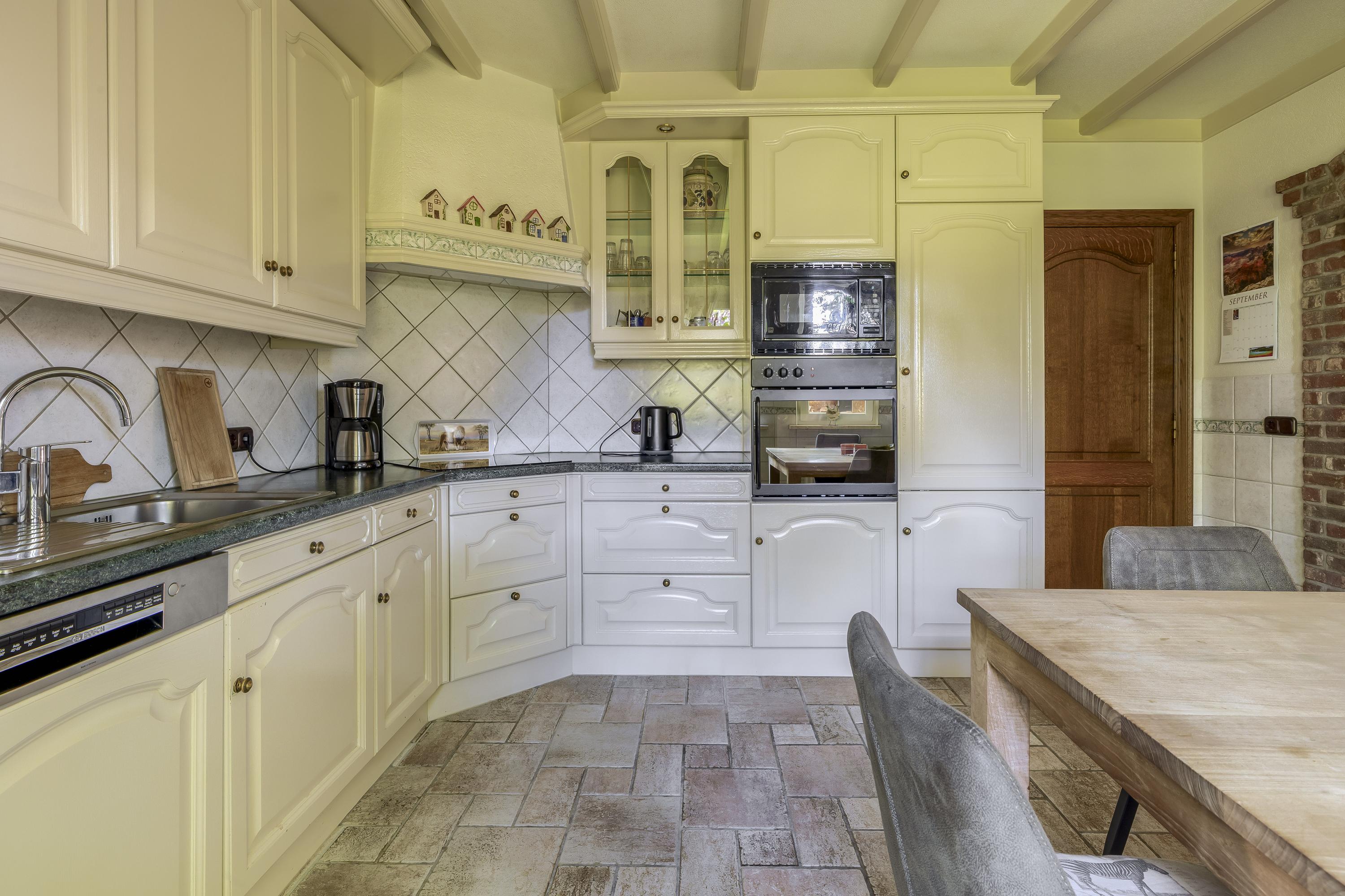 De aanpandige garage is uitgerust met een gootsteen en een vaste kastenwand met schuifdeuren. In deze kast is