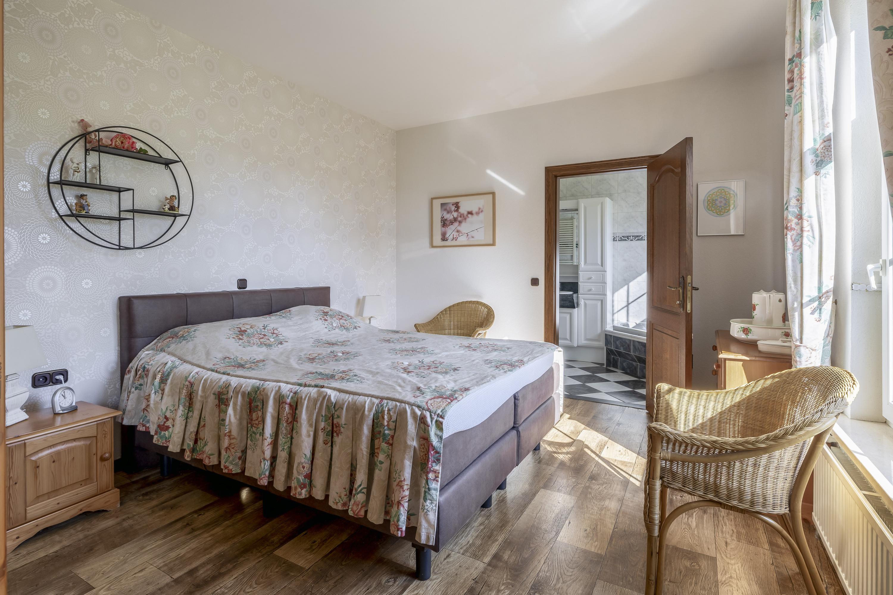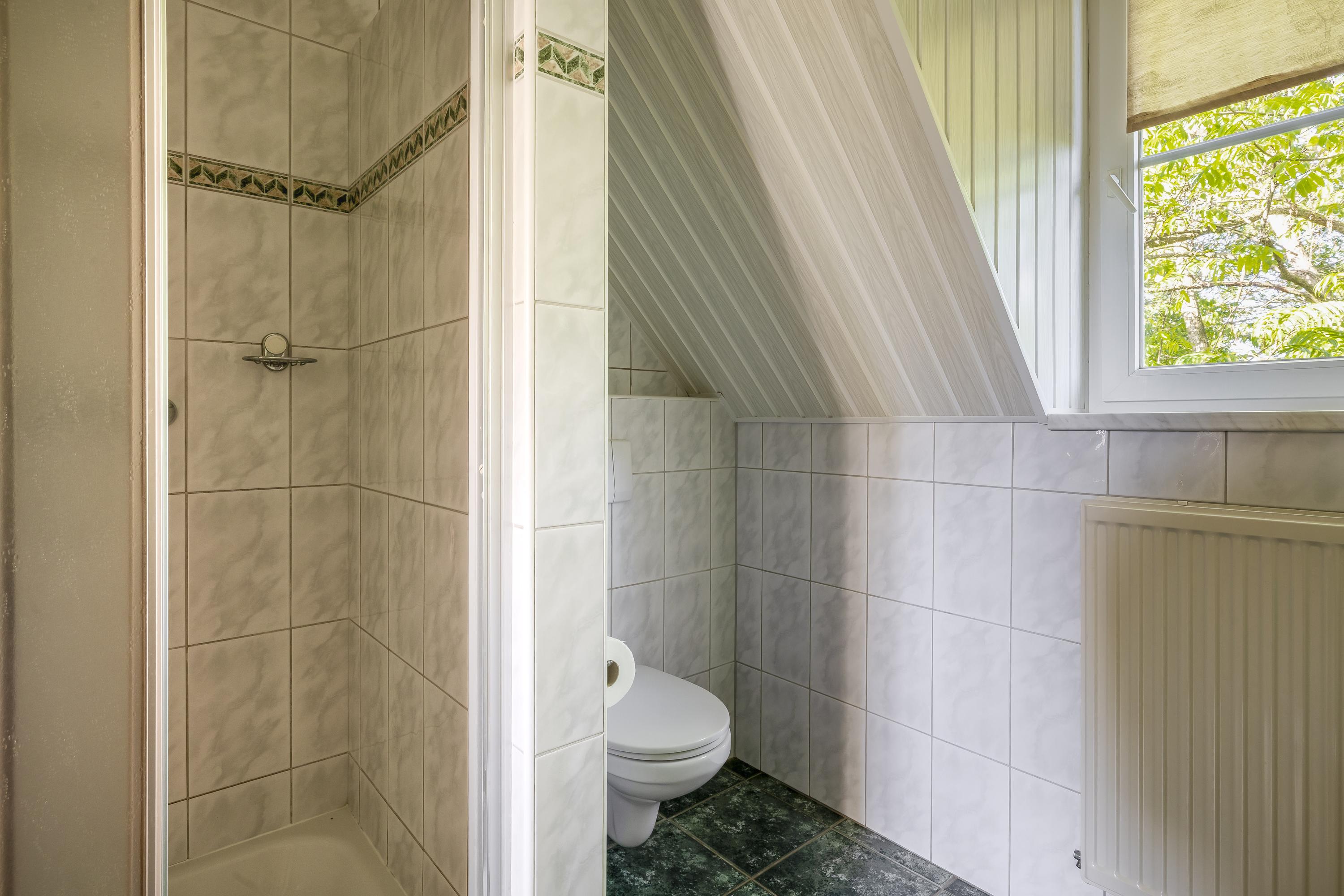 trap biedt toegang tot de 1e verdieping. De royale woonkamer is een heerlijke ruimte. De grote raampartijen en een schuifpui bieden een prachtig vrij uitzicht op de tuin. Het houten balken plafond en de schouw met gaskachel zorgen voor extra sfeer in de ruimte. Ook is er airconditioning aanwezig. De keukeninrichting in de leefkeuken is in een hoekopstelling geplaatst en uitgerust met een vaatwasser, spoelbak, keramische kookplaat, oven, magnetron en een koelkast. Vanuit de keuken bieden raampartijen ook zicht op de tuin. De bijkeuken is deels betegeld en uitgerust met de aansluitingen voor de wasapparatuur. Een loopdeur zorgt voor toegang tot de achtertuin. De badkamer is geheel betegeld en ingericht met een ligbad, een dubbele wastafel met meubel en een designradiator. Aangrenzend aan de badkamer is de slaapkamer gelegen.