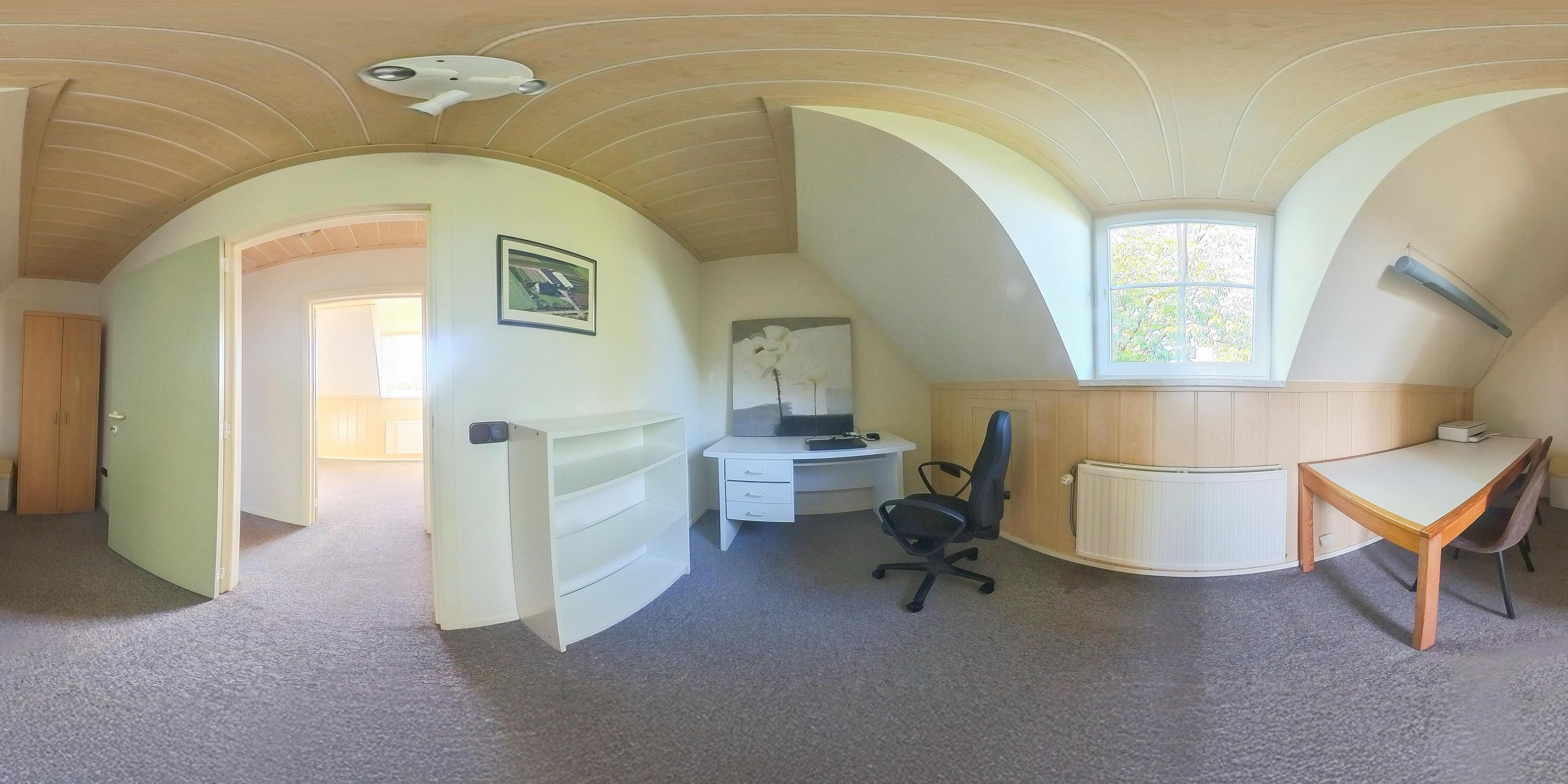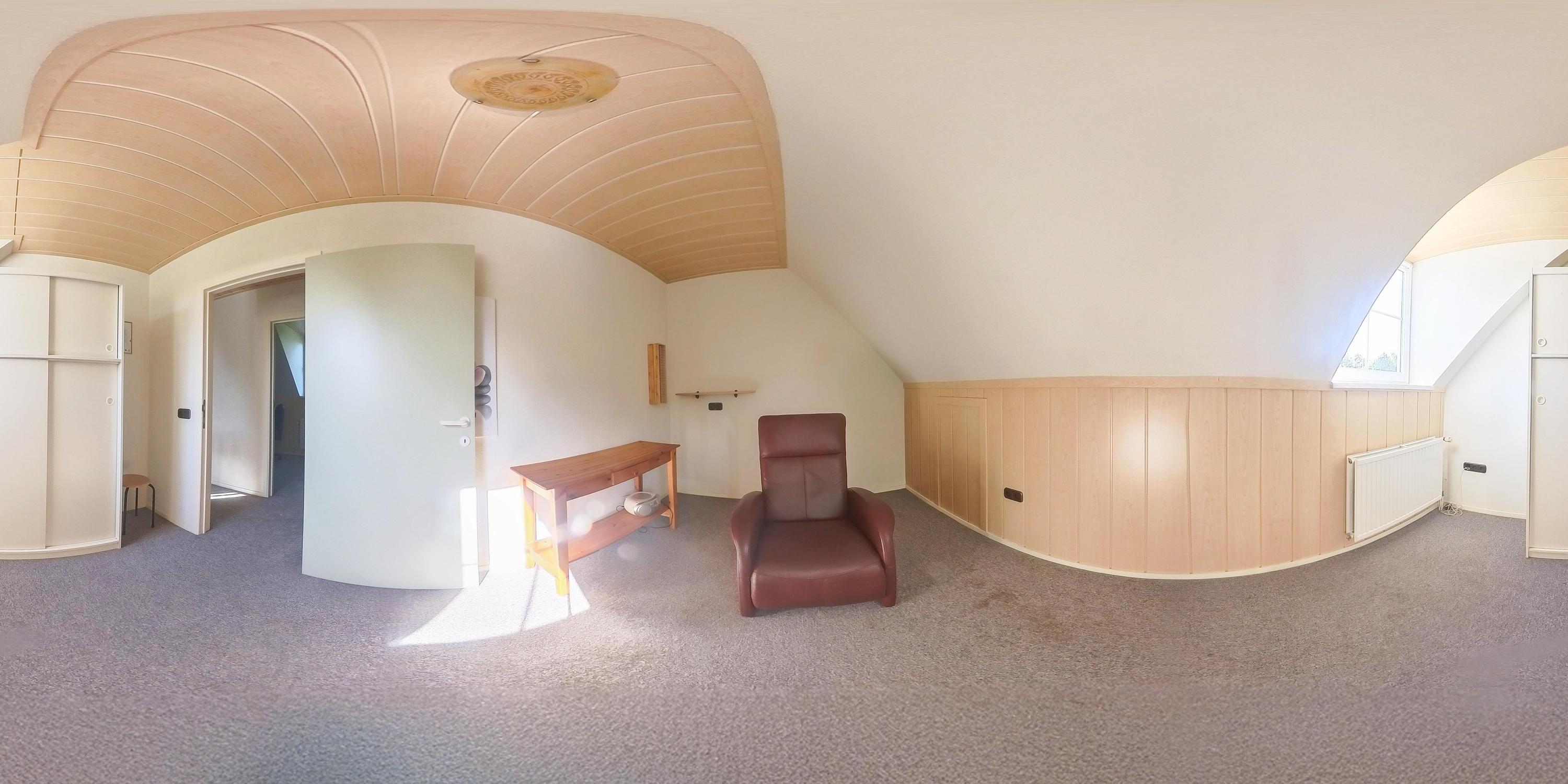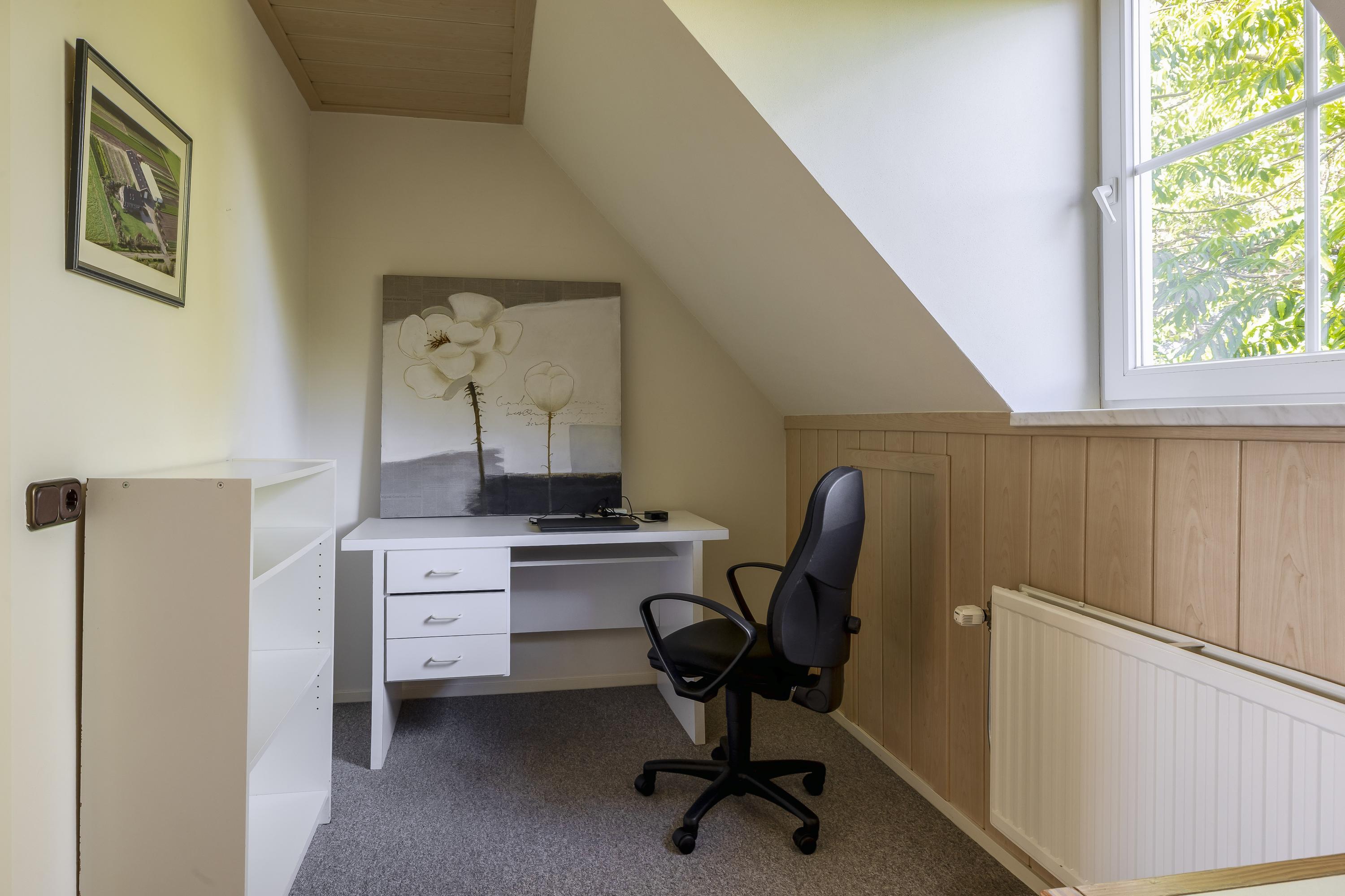 De eerste verdieping biedt ruimte aan drie slaapkamers, een badkamer en een zolderruimte. Alle slaapkamers en de zolderruimte zijn voorzien van vloerbedekking. Raampartijen zorgen voor natuurlijke lichtinval en ventilatie. Onder de dakschuinte is er bergruimte gecreëerd. De zolderruimte is uitgerust met de opstelling voor de CV-ketel (Vaillant) en een stofzuigsysteem. Een luik zorgt voor toegang tot de vliering.