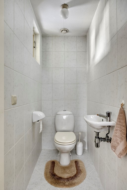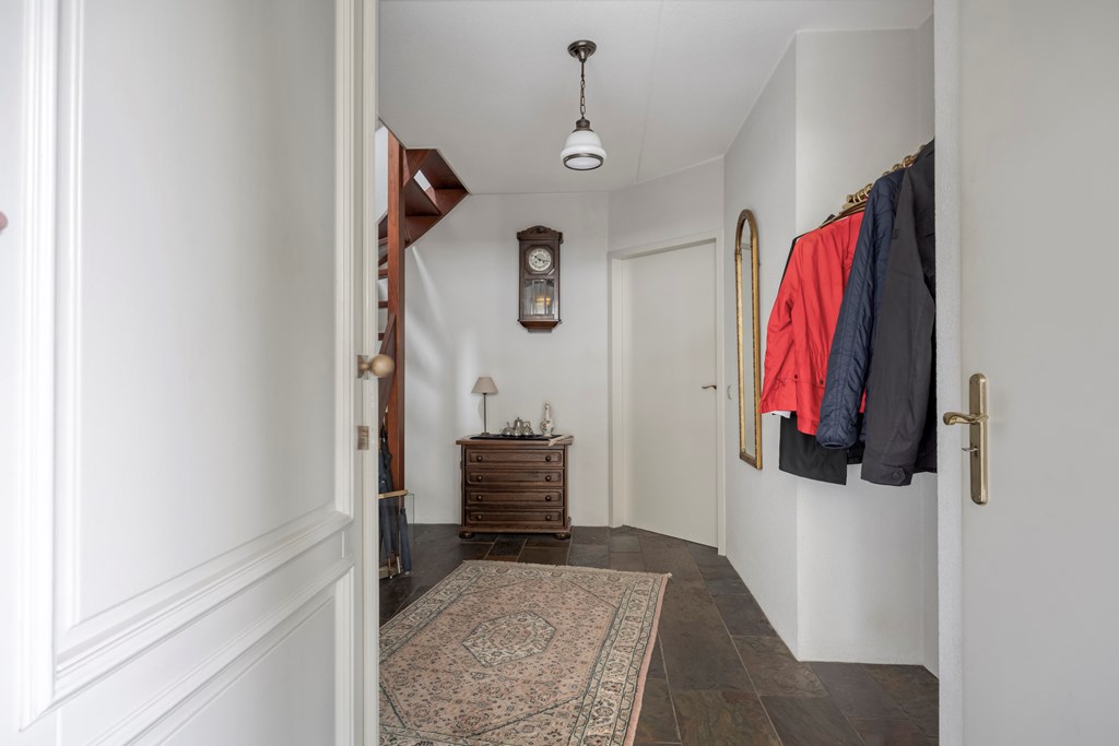 De overdekte entree leidt u naar een royale hal met garderobe, meterkast, trapopgang en een keurig toilet met fonteintje. Vanuit de hal, met natuurstenen vloer, bereikt u de woonkamer en de slaapkamer, welke ook kan fungeren als werkkamer.