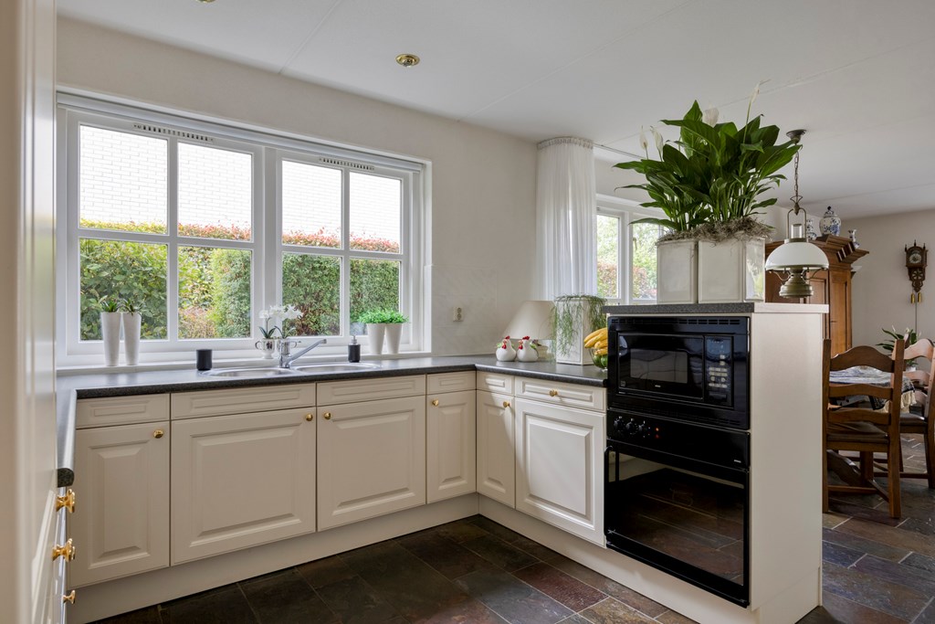 De sfeervolle woonkamer is opvallend licht dankzij de grote erker aan de voorzijde en het brede raam aan de zijkant. De zithoek rondom de open haard vormt een gezellige plek voor lange avonden met familie of vrienden. Richting de achterzijde is ruimte voor een royale eethoek bij de open keuken. De keuken is een U-opstelling met schiereiland, voorzien van crèmekleurige fronten, donker werkblad en complete inbouwapparatuur: een inductiekookplaat, vlakscherm afzuigkap, combimagnetron, oven, koel-/vriescombinatie en een vaatwasser. Aansluitend ligt de praktische bijkeuken met witgoedaansluitingen, opbergruimte en een buitendeur naar het terras. Tot slot bevindt zich op de begane grond een extra kamer – ideaal als thuiskantoor, hobbyruimte, speelkamer of slaapkamer. Via deze kamer bereikt u binnendoor de badkamer – met douche, toilet en wastafel – handig voor wie levensbestendig wil wonen of gasten ontvangt. Daarnaast zijn de deuren op de begane grond breed waardoor ze ook toegankelijk zijn voor een rolstoel.
