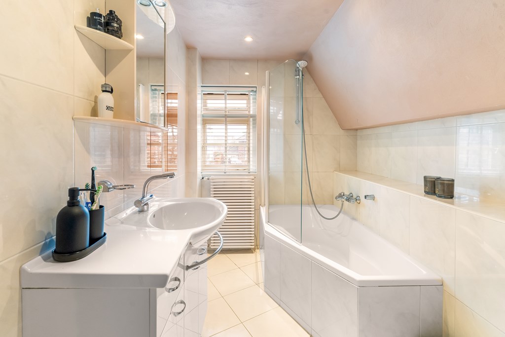 De bordestrap brengt u naar een sfeervolle verdieping met vide en glas-in-lood. Er zijn drie volwaardige slaapkamers van ca. 17 m², 14,5 m² en 7 m². De slaapkamer aan de achterzijde geeft toegang tot het grote zonnige balkon van ca. 15 m². Ook vaste kastruimte ontbreekt niet op de eerste verdieping. De comfortabele badkamer van ca. 5 m² is uitgevoerd in lichte kleurstelling. Deze beschikt over een ligbad met douchefunctie, een hangend toilet en een wastafelmeubel met spiegelkast. Het plafond is voorzien van inbouwspots.