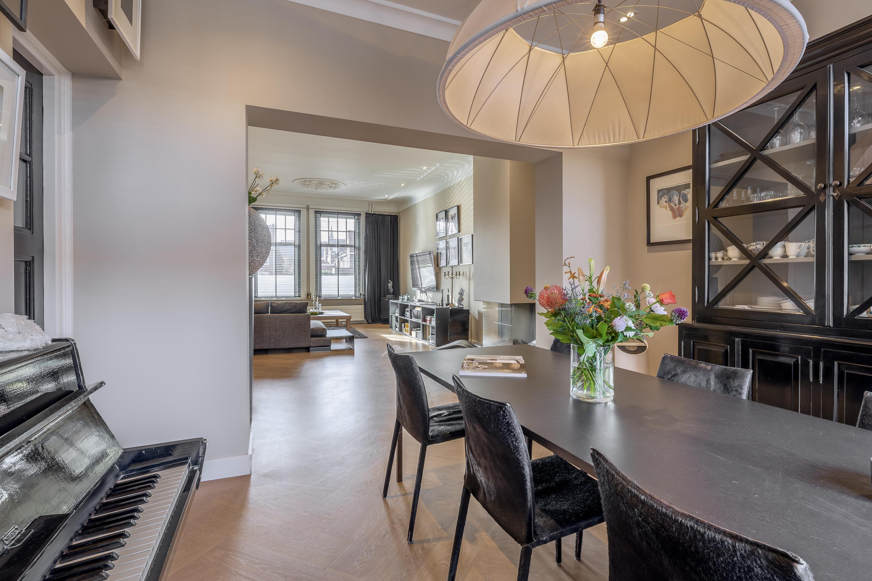 De diepe en brede woonkamer is voorzien van frans eiken extra breed visgraat parket. Het indrukwekkende hoge plafond heeft originele ornamenten en kroonlijsten en is voorzien van ingewerkte dimbare verlichting. Aan de voorzijde is vrij uitzicht op het rosarium. De gashaard zorgt voor extra sfeer en de airco zorgt zowel voor verkoeling als voor verwarming. Door de verhoogde ligging van de ramen t.o.v. het trottoir is er geen inkijk van buiten. Achterin bieden dubbele openslaande deuren directe toegang tot de tuin.