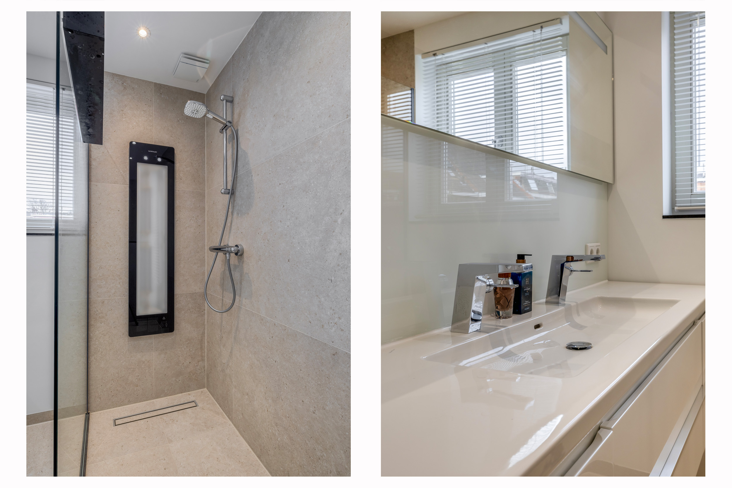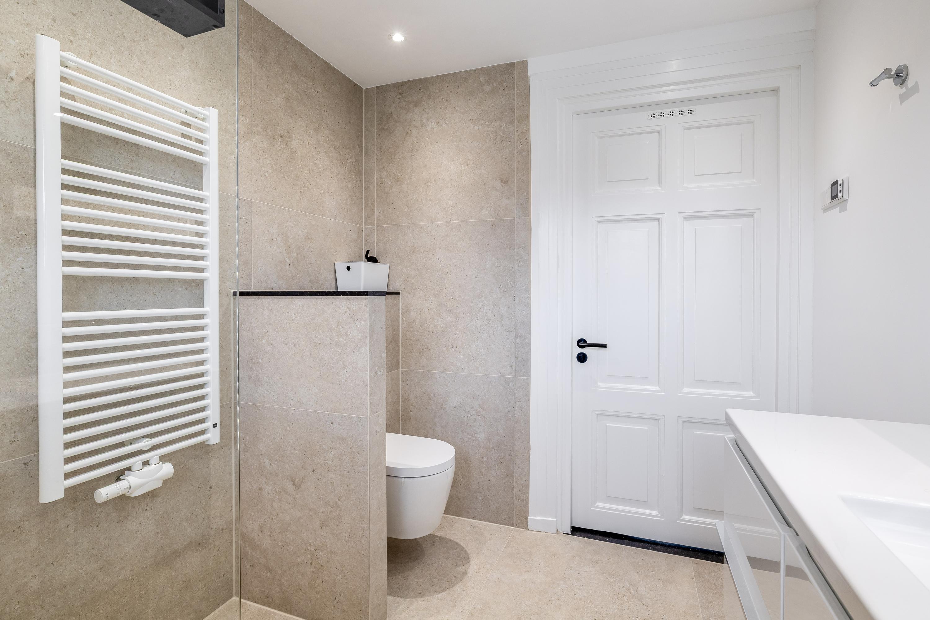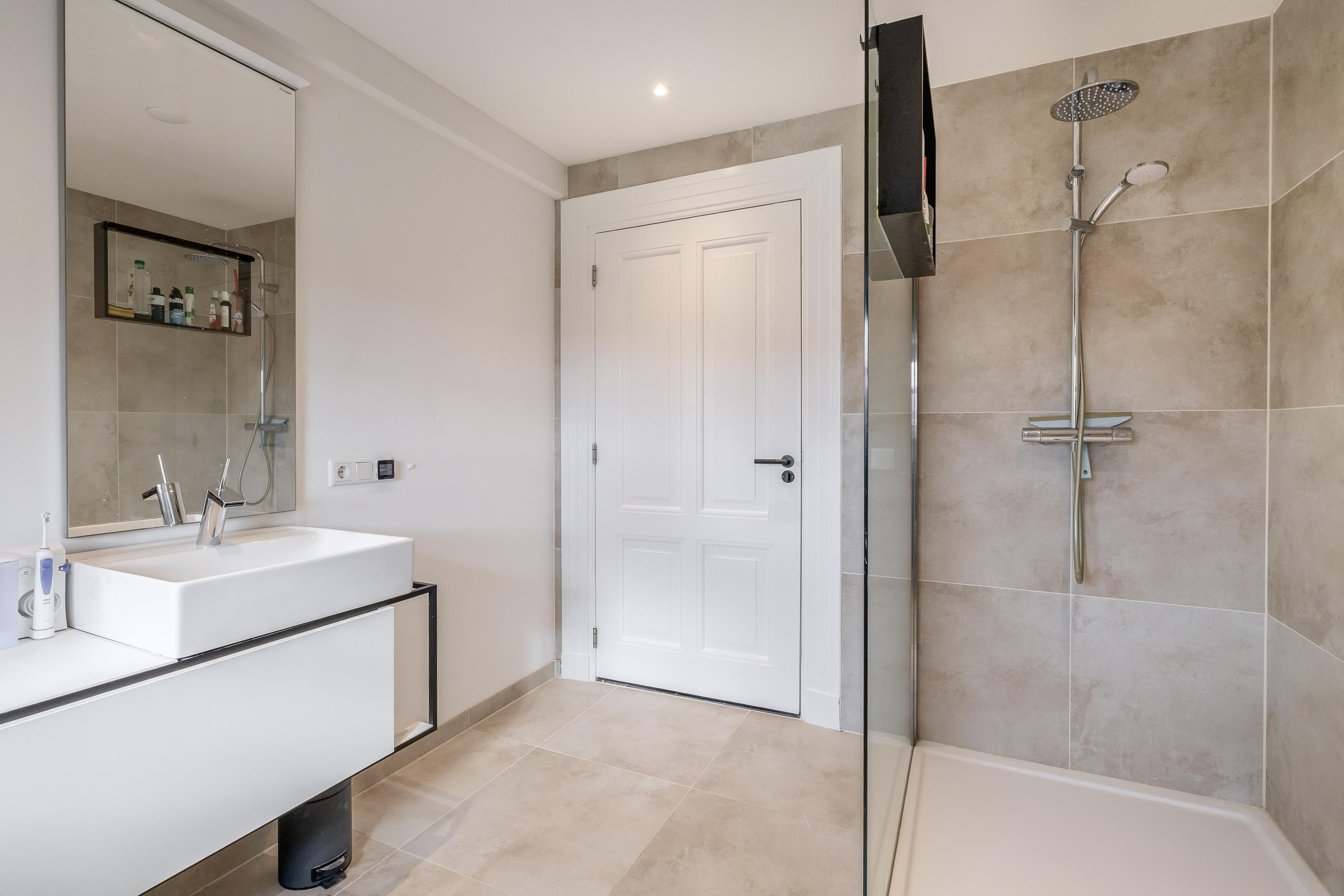 In de grote, hoogwaardig afgewerkte badkamer (2025) zijn een ruime inloopdouche voorzien van sunshower, toilet, dubbel wastafelmeubel, designradiator en mechanische ventilatie aanwezig. Er ligt een tegelvloer met een elektrische vloerverwarming.