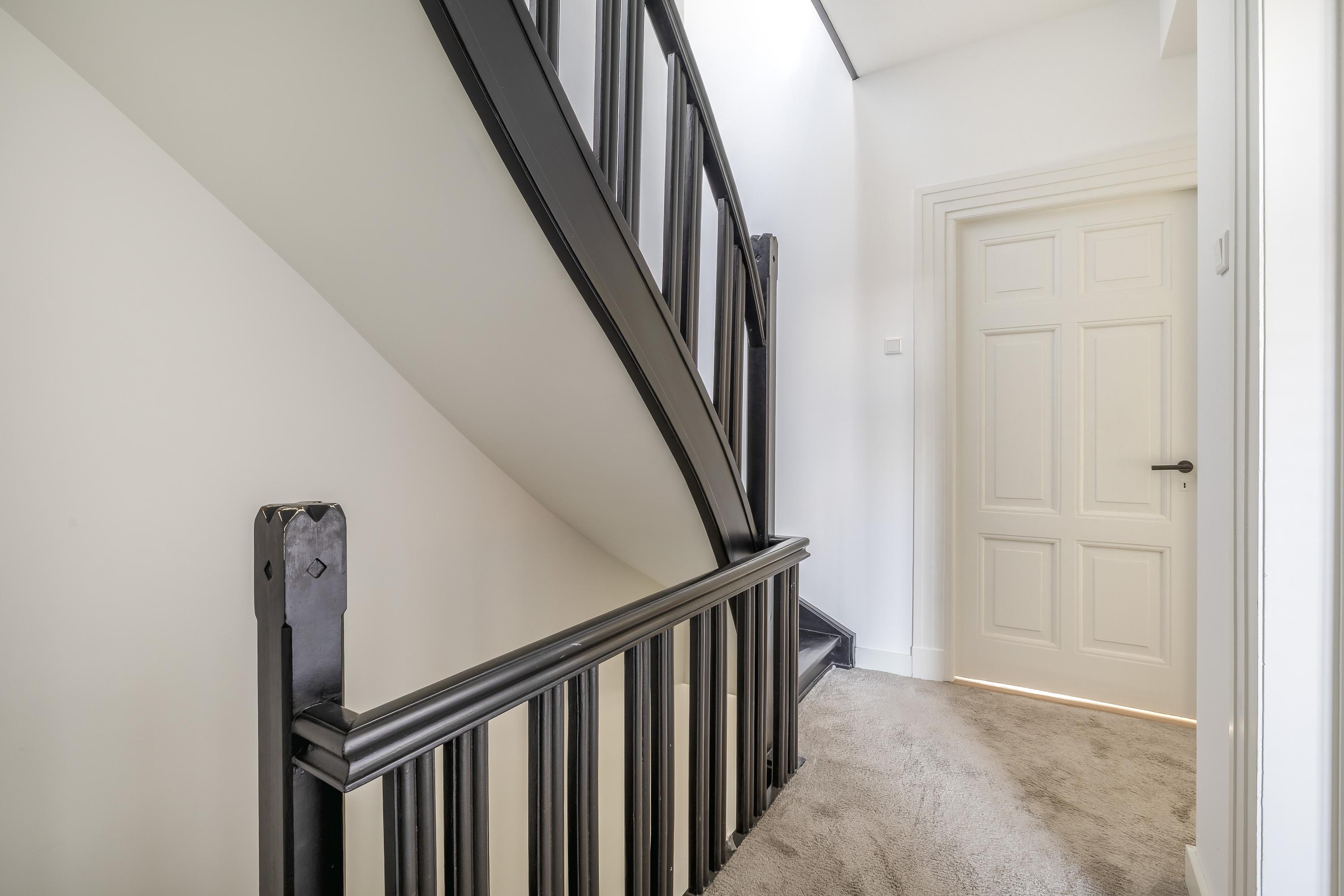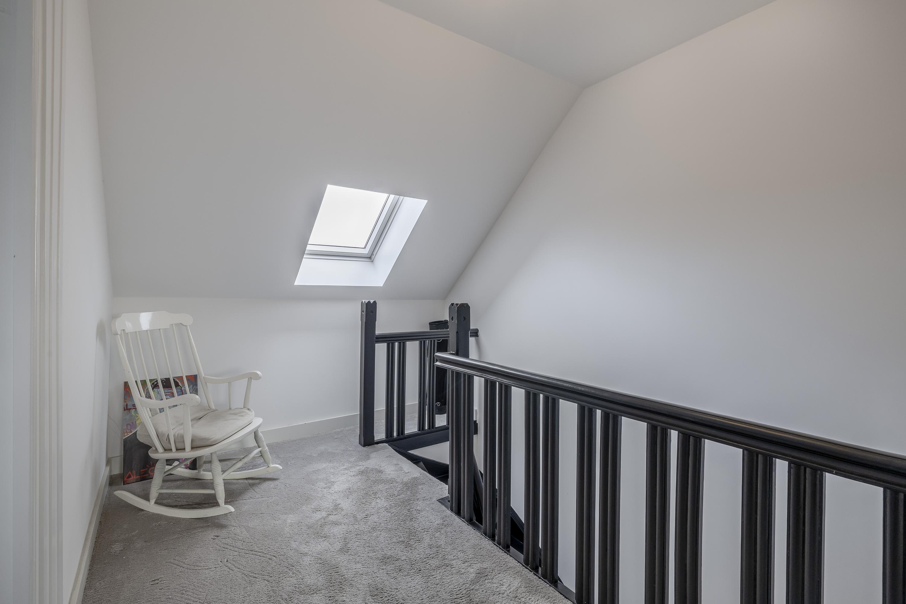 De tweede verdieping is bereikbaar door middel van de vaste trap. Op de overloop ligt vloerbedekking en is een Velux dakraam met screen aanwezig.