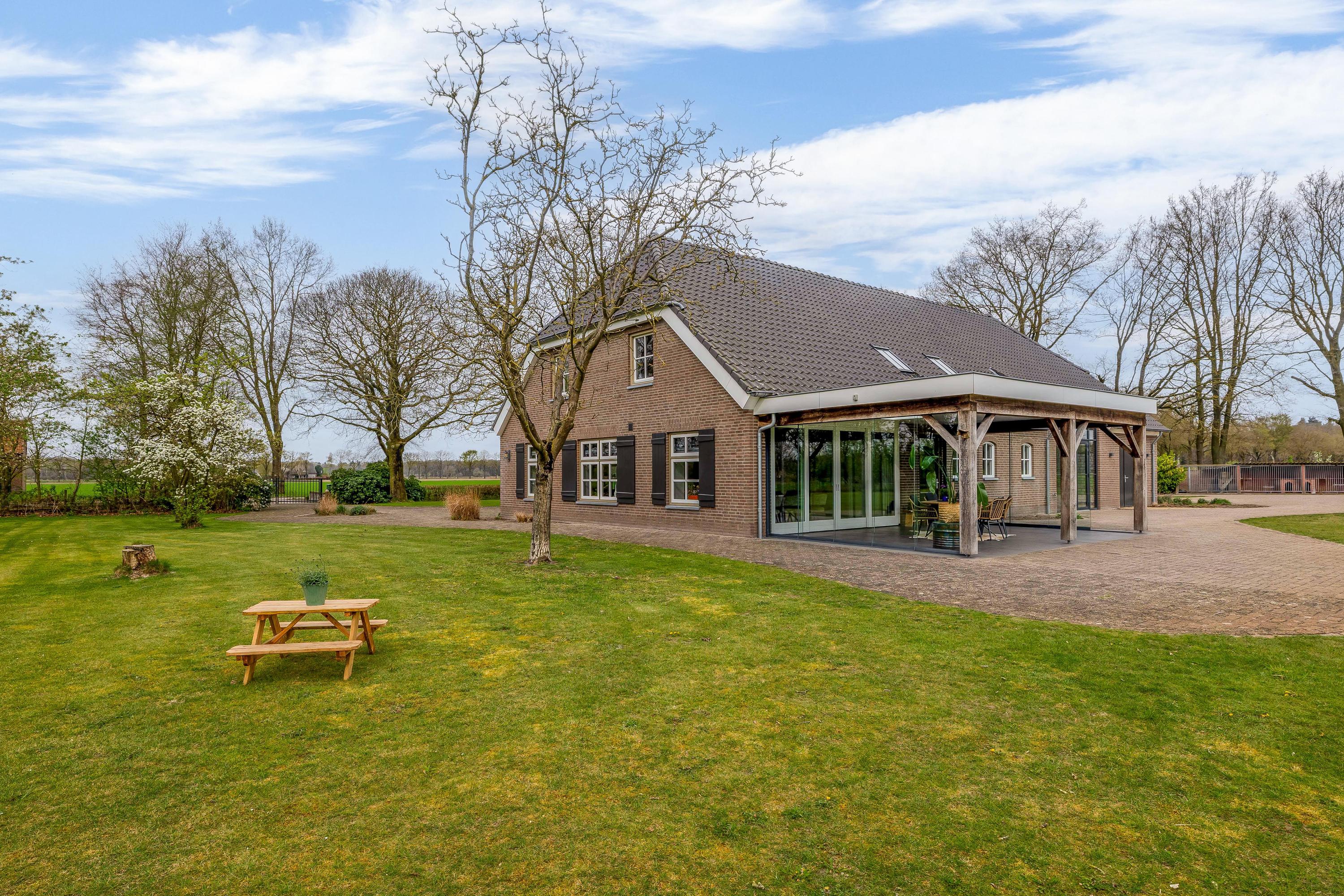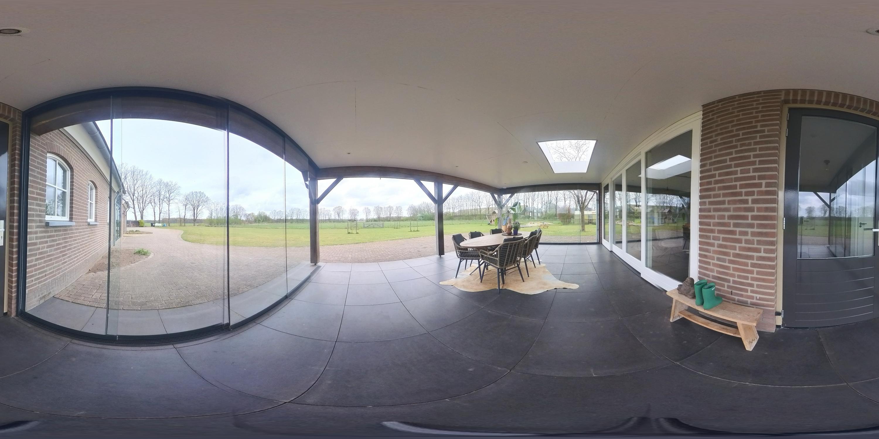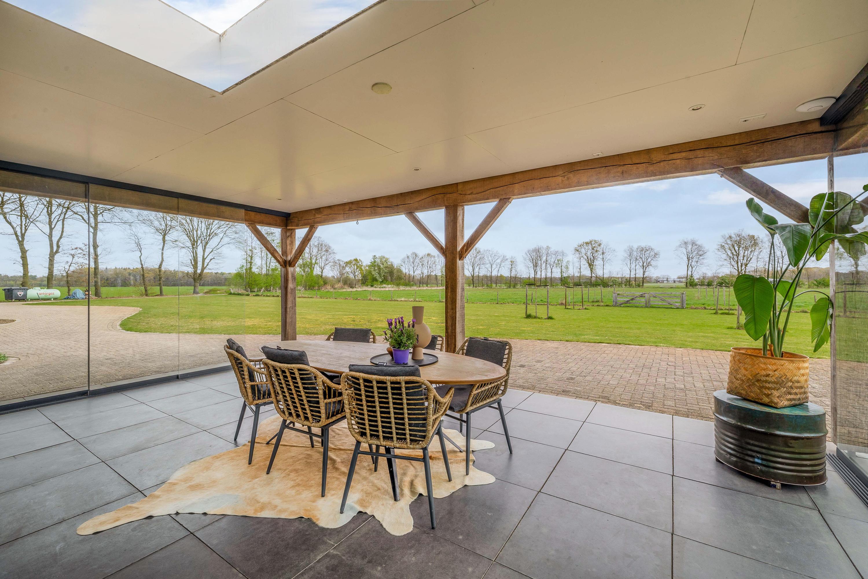 De rondom de woning gelegen tuin vormt een natuurlijk verlengstuk van het buitenleven. Het overdekte terras met lichtkoepel en glazen schuifwanden biedt een beschutte plek met vrij uitzicht over het aangrenzende weiland.
