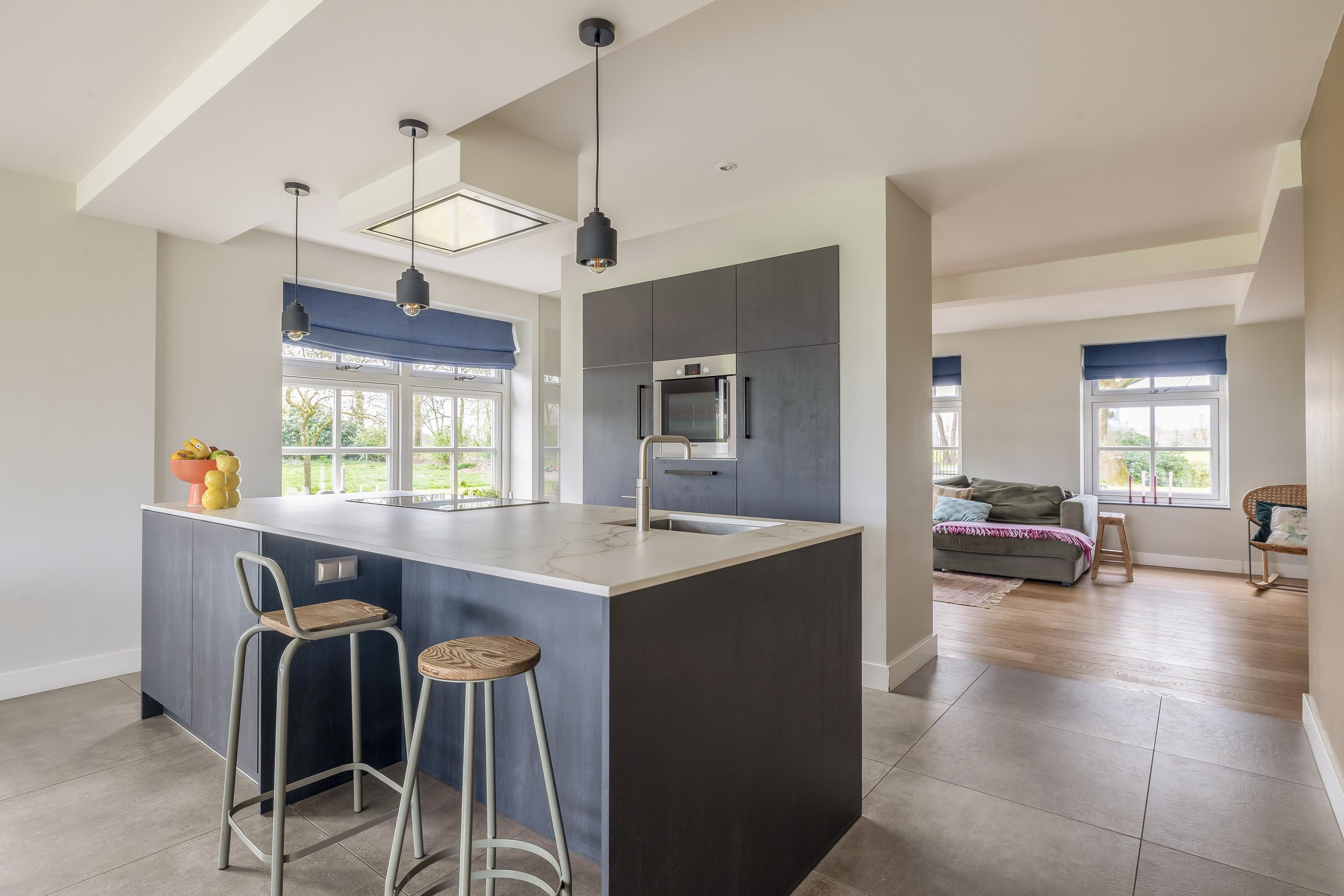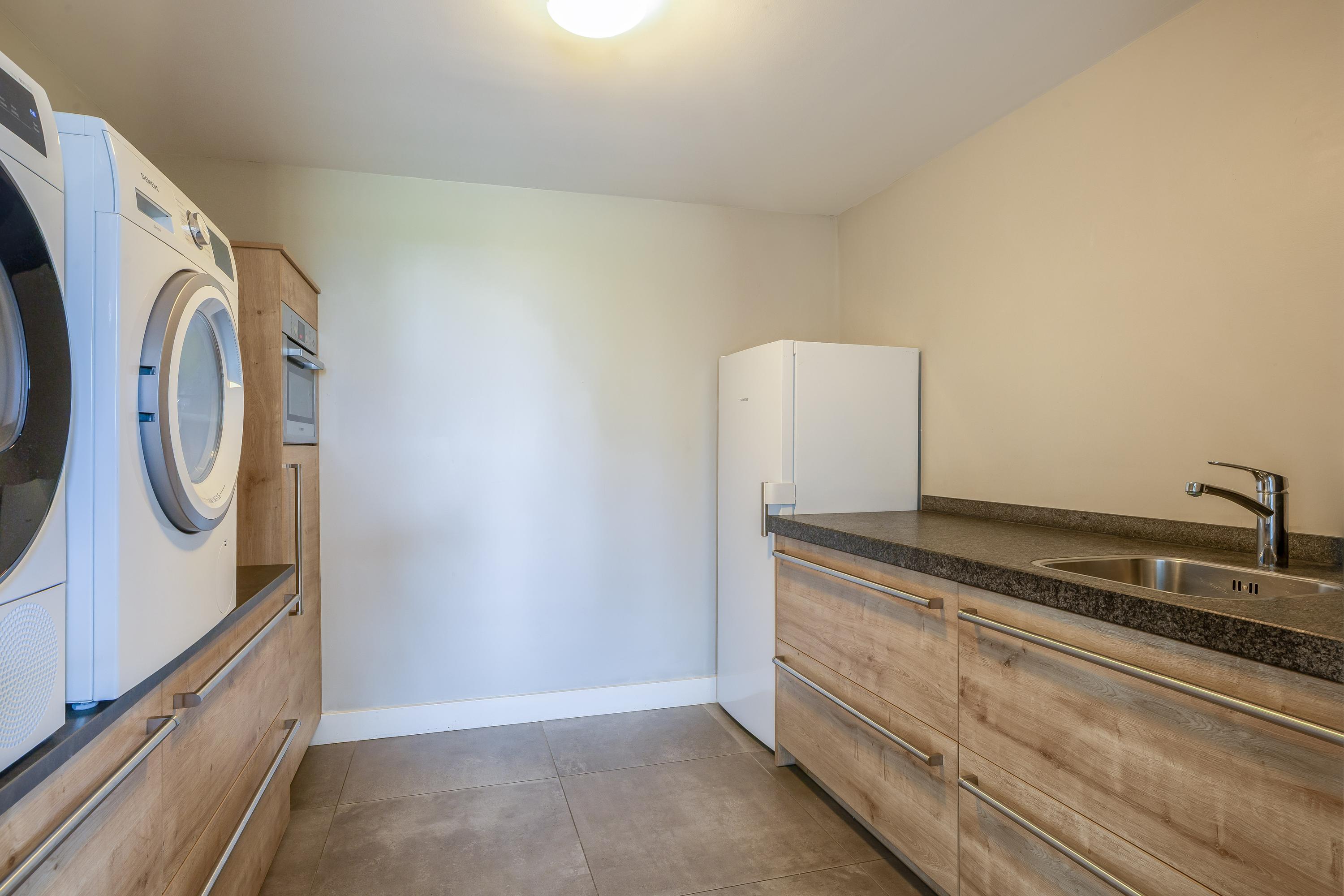 De hal is afgewerkt met een tegelvloer en biedt toegang tot de woonkamer, de slaapkamer en de centrale corridor. In de hal is tevens de vernieuwde meterkast gesitueerd. De slaapkamer is afgewerkt met PVC vloer en geniet volop lichtinval. Er zijn mogelijkheden tot het eenvoudig realiseren van een badkamer-en-suite. De sfeervolle woonkamer met warme houten parketvloer en stucwerk wanden is een heerlijke ruimte met veel lichtinval. De woonkamer staat in directe verbinding met de leefkeuken. De leefkeuken is ingericht met een kookeiland en een wandopstelling en beschikt over alle benodigde apparatuur, waaronder een Quooker, vaatwasser, inductiekookplaat, oven en koelkast. De moderne tegelvloer met vloerverwarming en de schuifpui die toegang biedt tot het overdekte terras, maken deze keuken tot een prettige en praktische leefruimte met uitzicht op het omliggende landschap. Via de corridor zijn de bijkeuken, toiletruimte en berging bereikbaar. De bijkeuken is praktisch ingericht met wasapparatuur op hoogte, bergruimte en extra voorzieningen zoals een koelkast en combi-oven. De toiletruimte is voorzien van een zwevend toilet en fonteintje. De berging beschikt over aansluitingen voor het realiseren van een badkamer, waarmee een levensloopbestendige invulling eenvoudig mogelijk is.