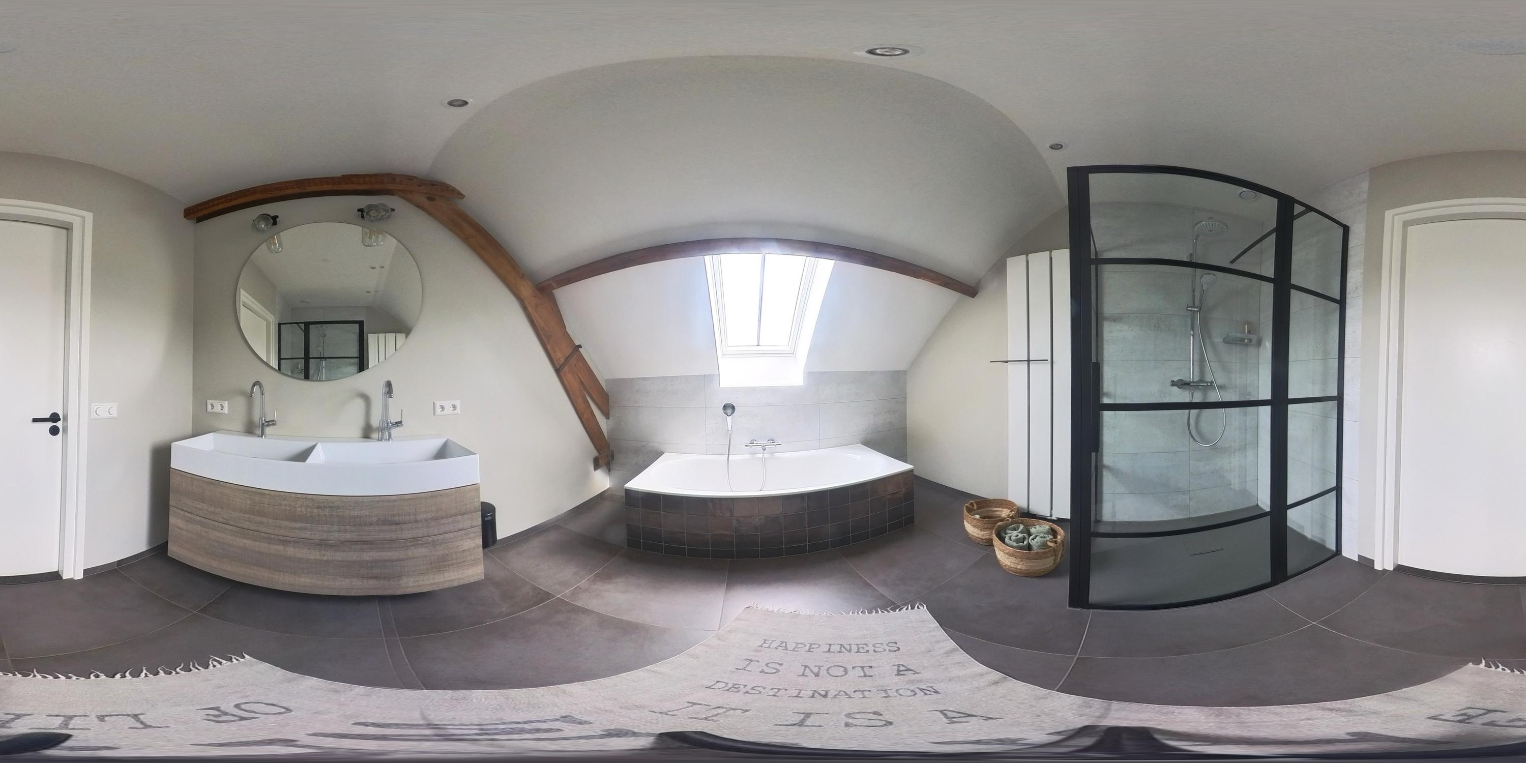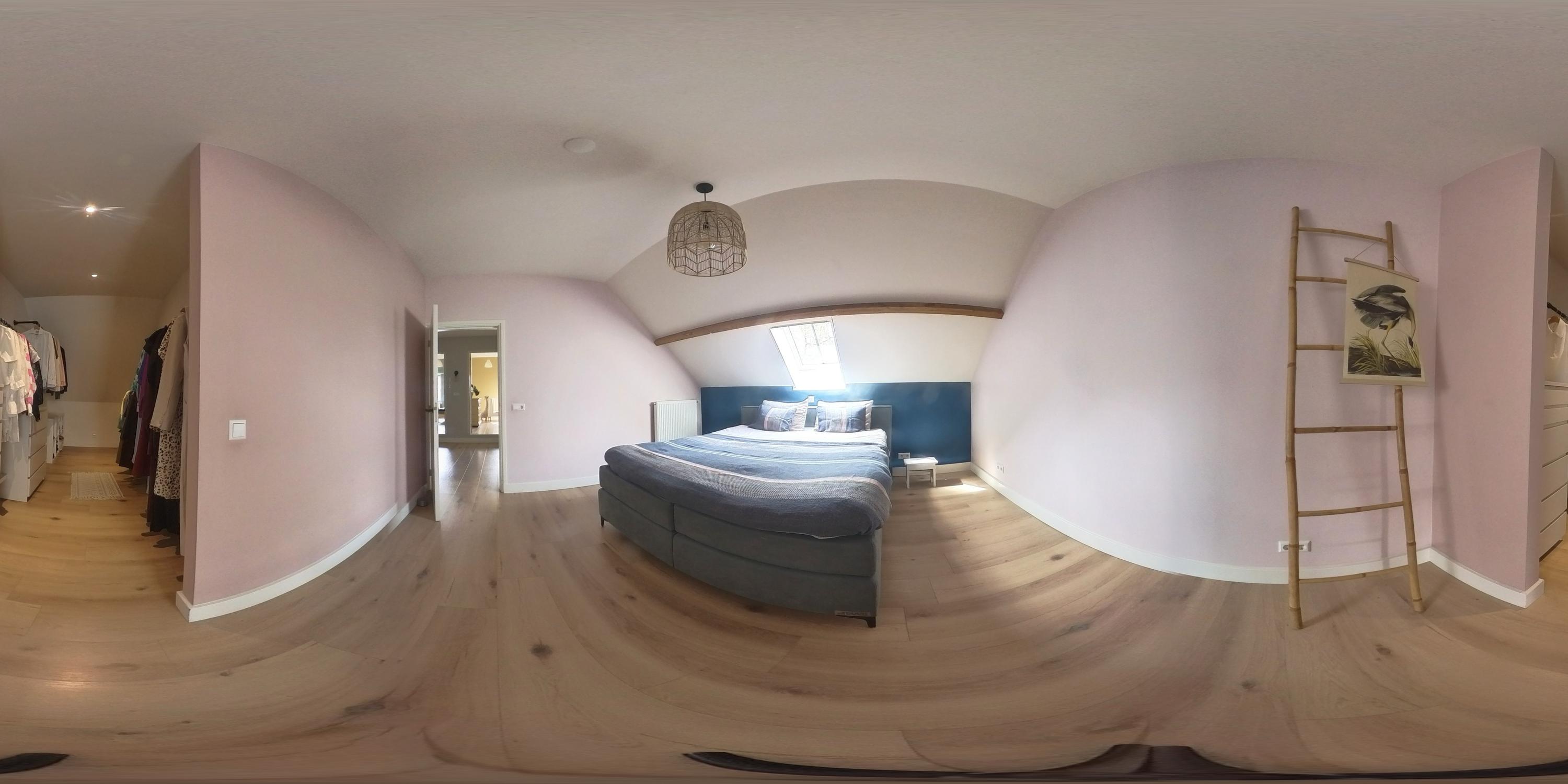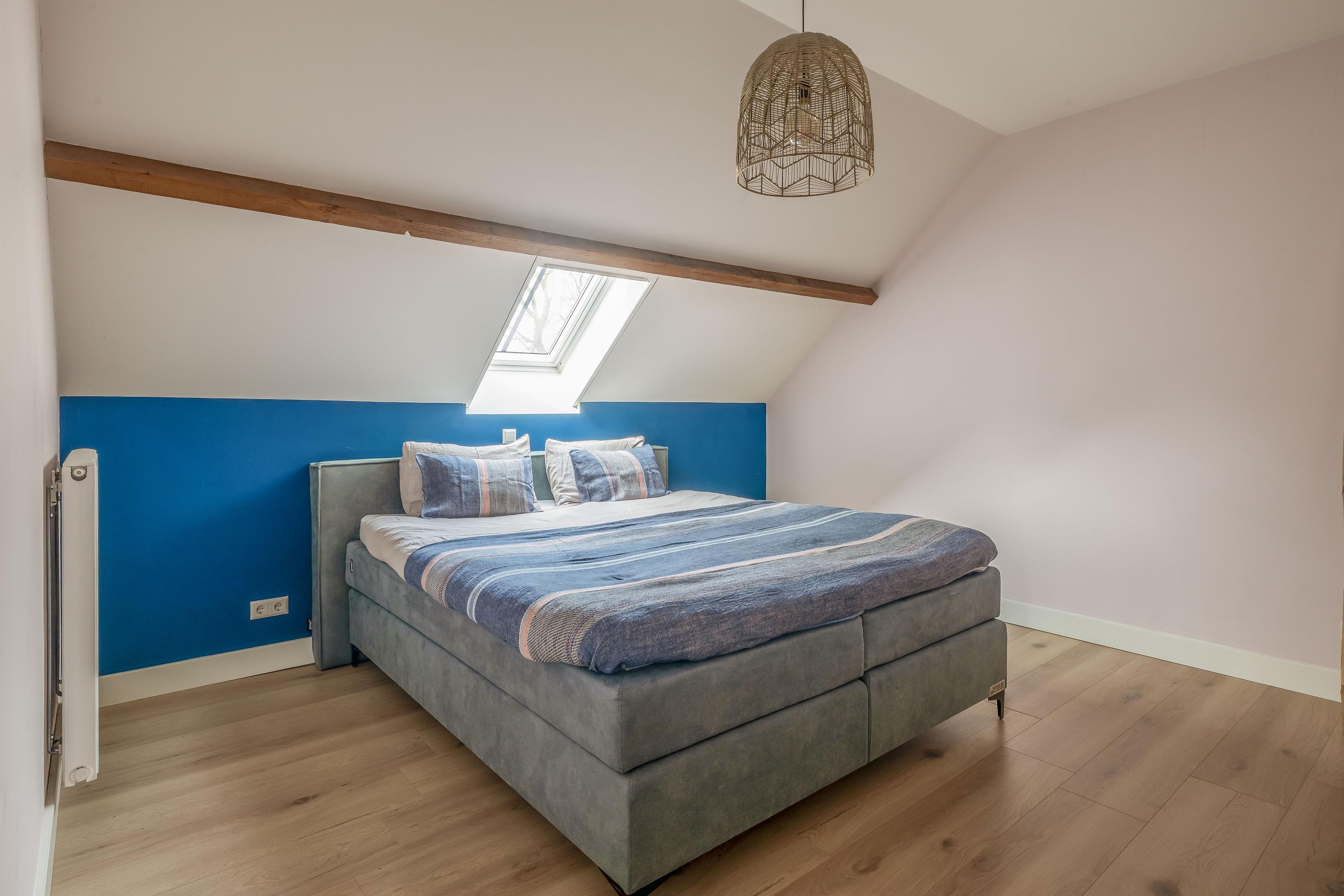 De eerste verdieping wordt gekenmerkt door een royale overloop met vide en biedt toegang tot drie ruime slaapkamers, een badkamer, separate toiletruimte en cv-ruimte. De verdieping is afgewerkt met een laminaatvloer en stucwerk wanden. De hoge plafonds zorgen voor een ruimtelijk effect. Eén van de slaapkamers beschikt over vaste kasten en de master bedroom is voorzien van een inloopkast. De badkamer is uitgerust met een ligbad, douche en dubbele wastafel met meubel. Zichtbare houten spanten dragen bij aan de warme en landelijke sfeer. De separate toiletruimte is voorzien van een zwevend toilet. In de cv-ruimte bevindt zich de cv-combiketel (Nefit, 2018).