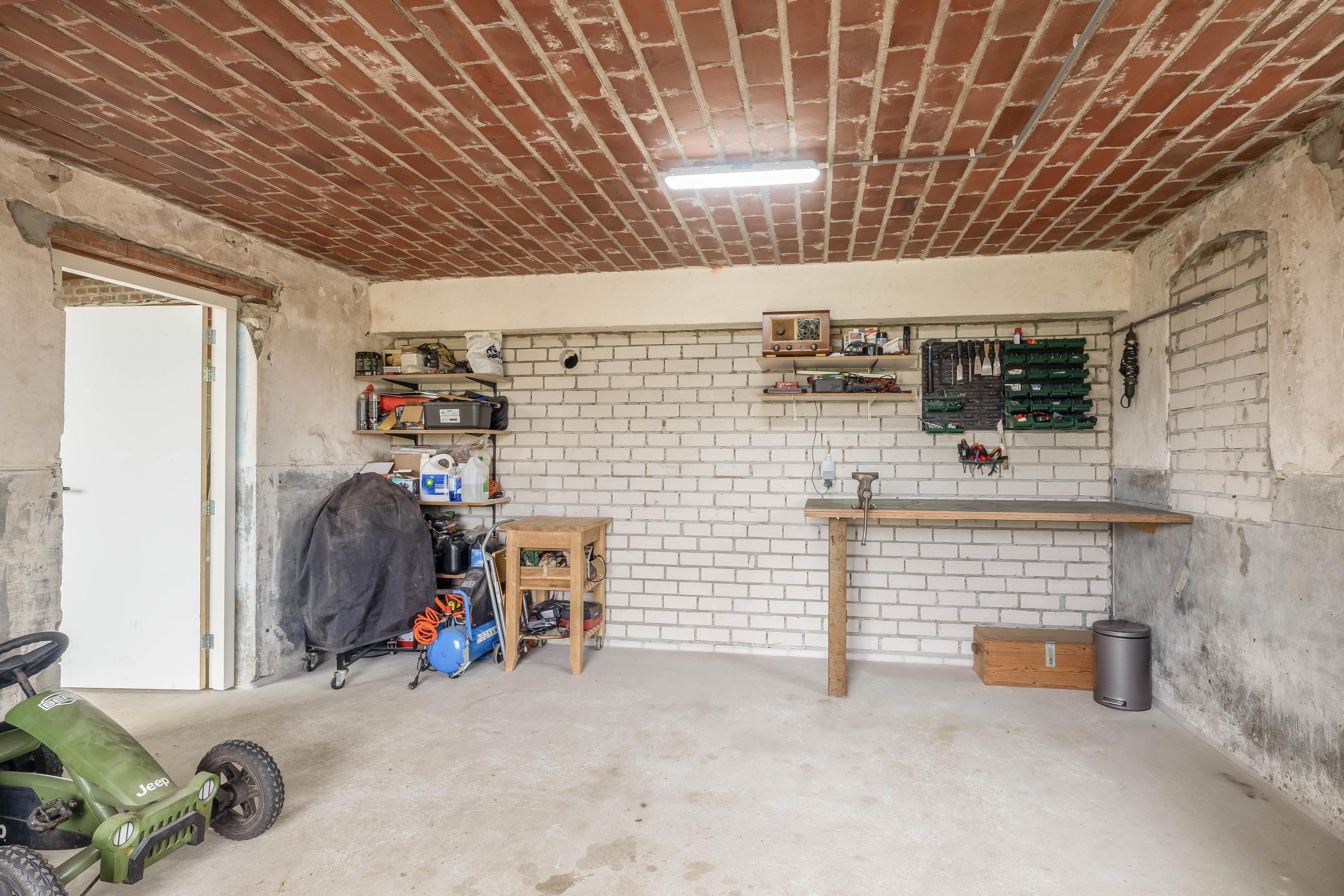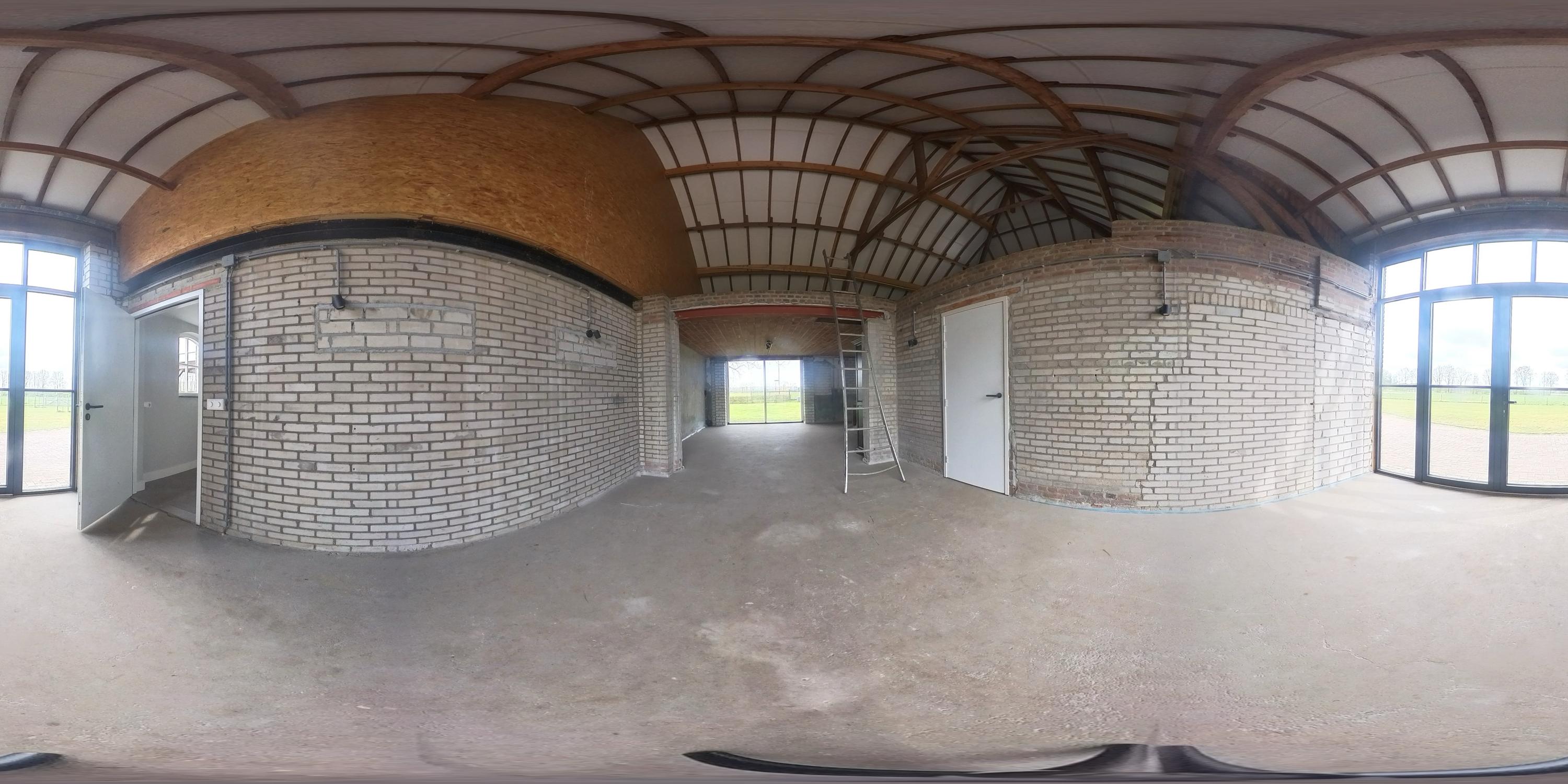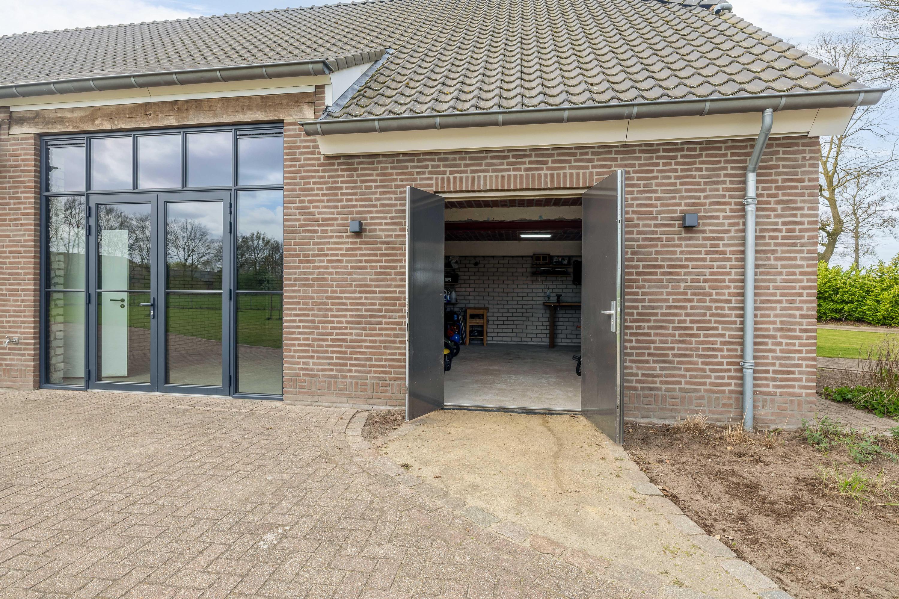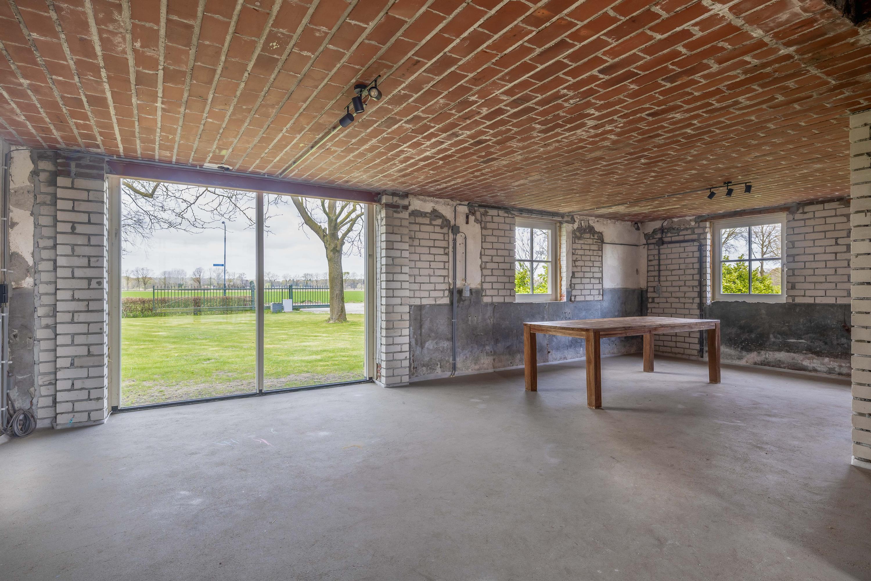Aansluitend bevindt zich het inpandige achterhuis dat, naast de inpandige garage, een aanzienlijk extra gebruiksoppervlak biedt. Deze vormt een solide basis en is bij de ontwikkeling ontworpen met het oog op veelzijdig gebruik. Het achterhuis leent zich daarmee uitstekend voor uiteenlopende invullingen, zoals een zelfstandige woonruimte (mantelzorg), een kantoor- of praktijkruimte met vergaderfaciliteiten of een comfortabel gastenverblijf. De ruimte is voorzien van een vernieuwde betonnen vloer met vloerverwarming, metselwerk wanden en zichtbare houten gebinten die de landelijke sfeer versterken. Een deel beschikt over een entresol en er is volop natuurlijke lichtinval aanwezig. Openslaande deuren in de achtergevel zorgen voor een directe verbinding met de tuin. Daarnaast is er een aparte toiletruimte aanwezig met een zwevend toilet en fonteintje. Vanuit het achterhuis is tevens toegang tot de inpandige garage. Vanaf het erf is de garage bereikbaar via een brede loopdeur.