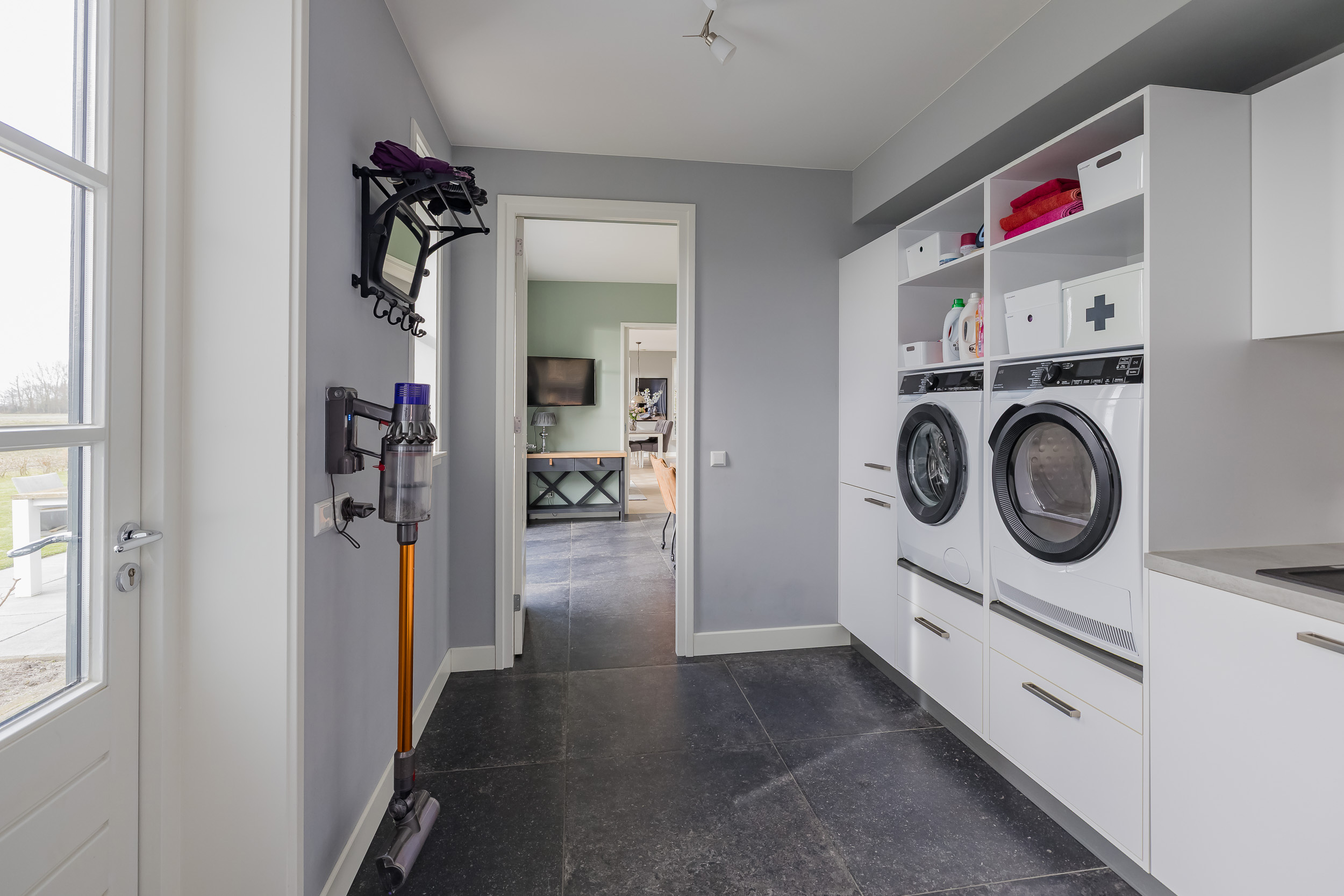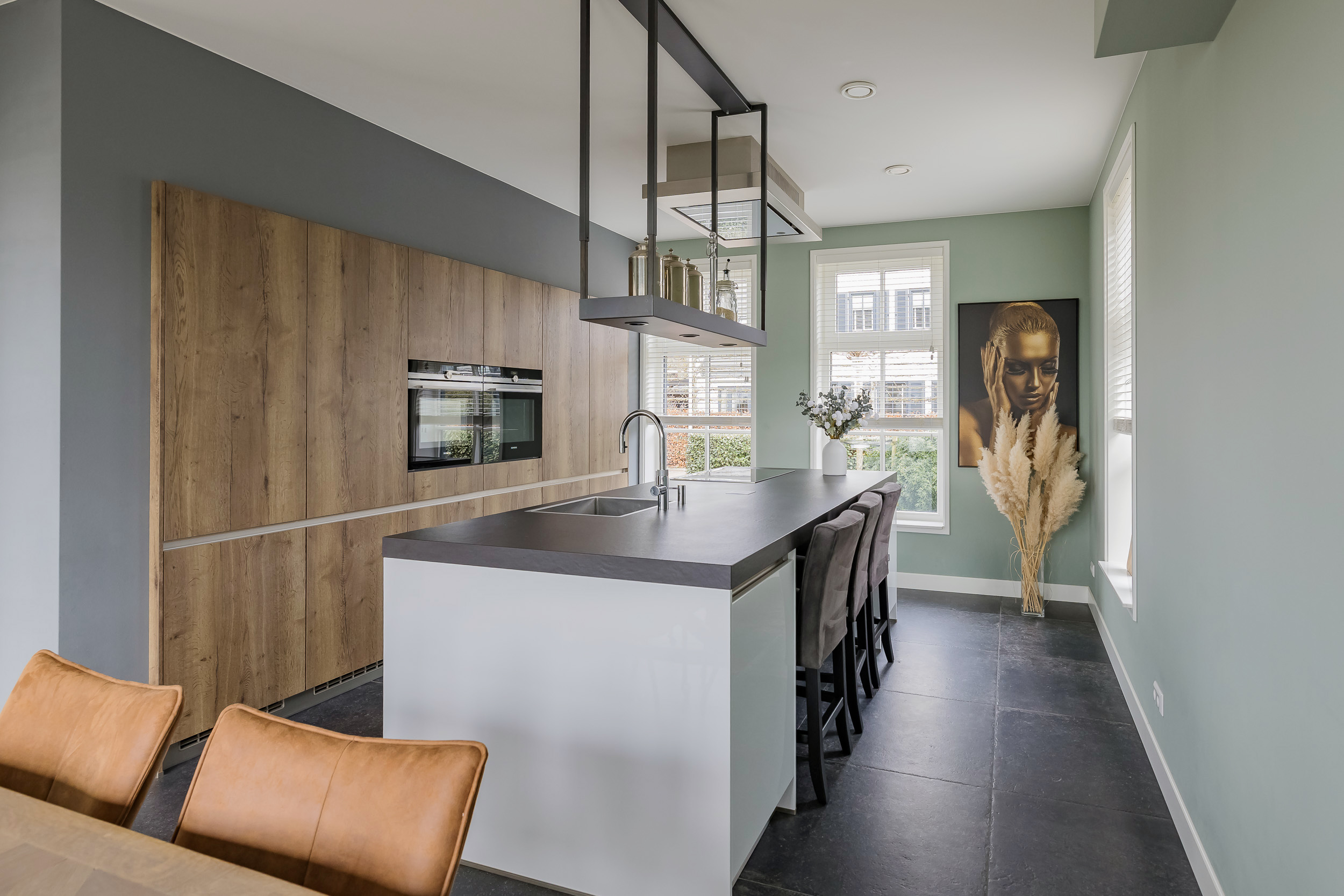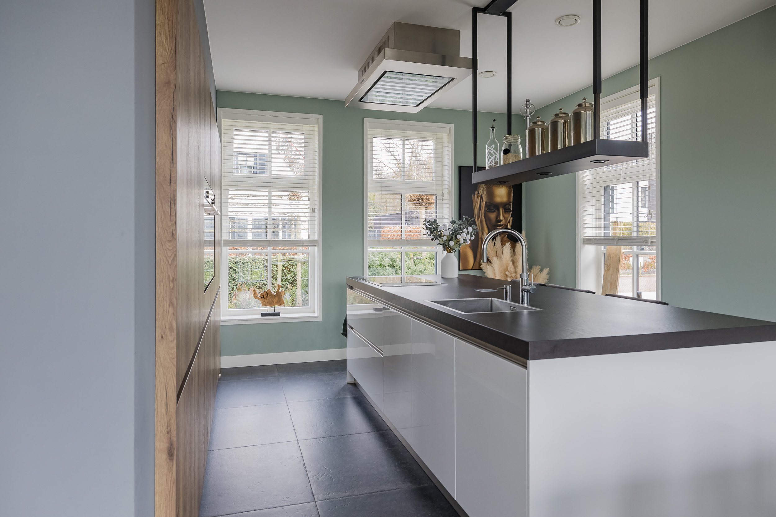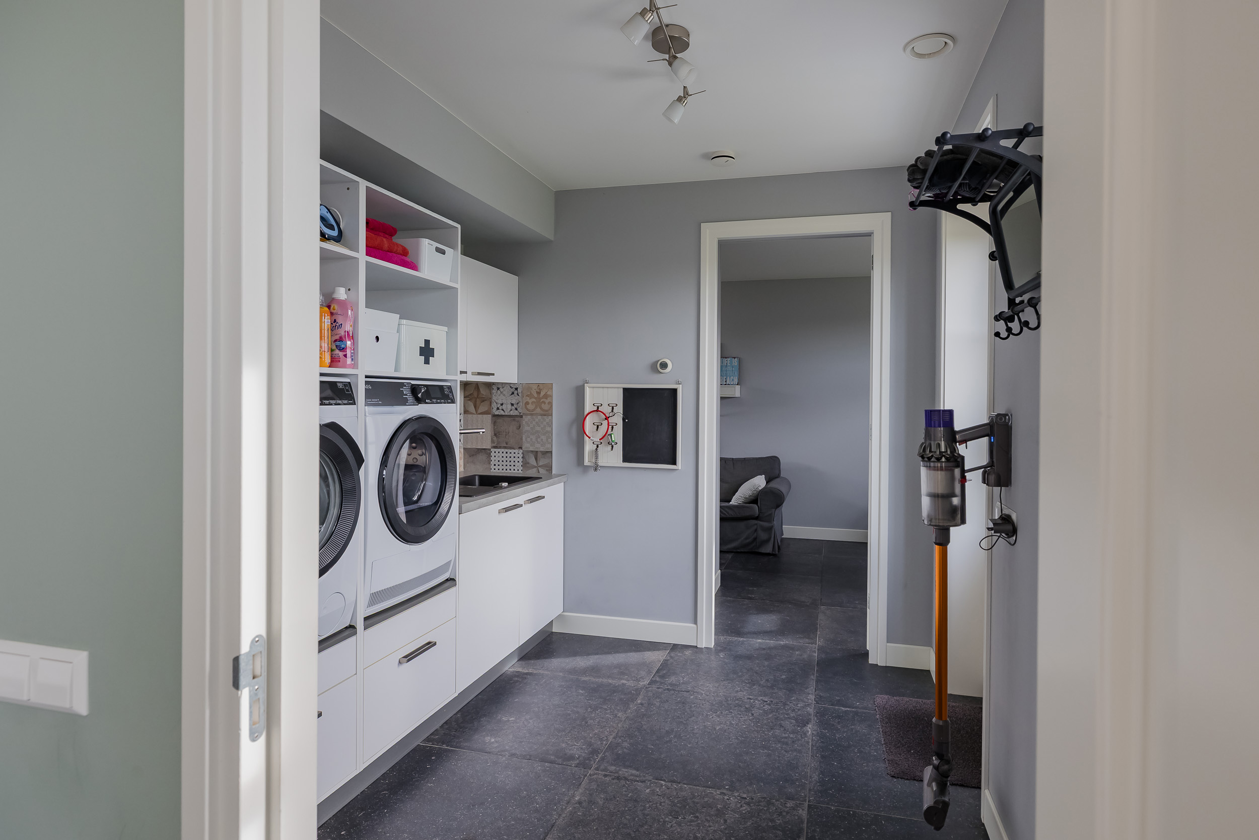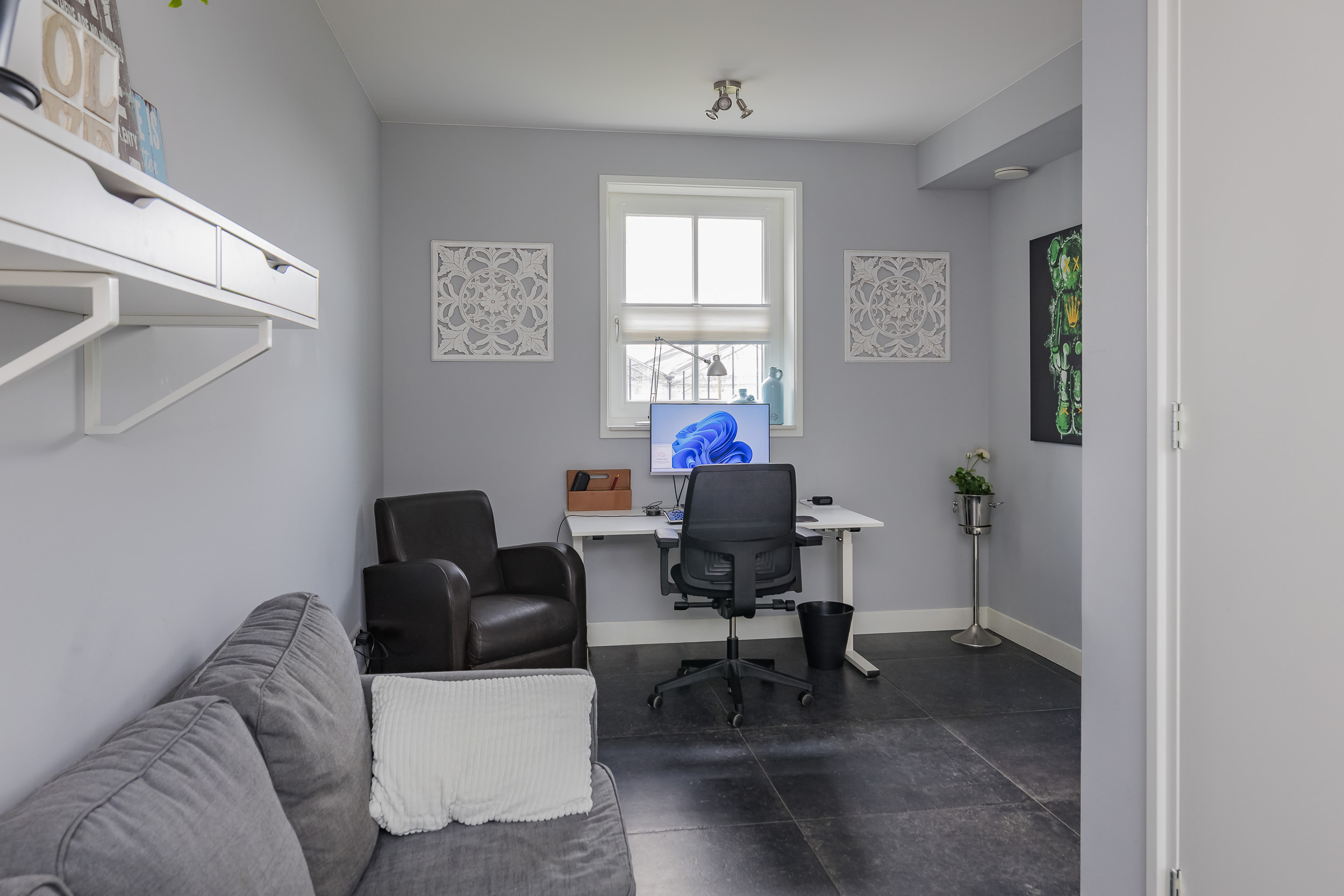 Via schuifdeuren bereik je de prachtige woonkeuken met kookeiland. Aansluitend vind je de bijkeuken met opstelling voor wasapparatuur en een deur naar de kantoorruimte op de begane grond: ideaal voor werken aan huis.