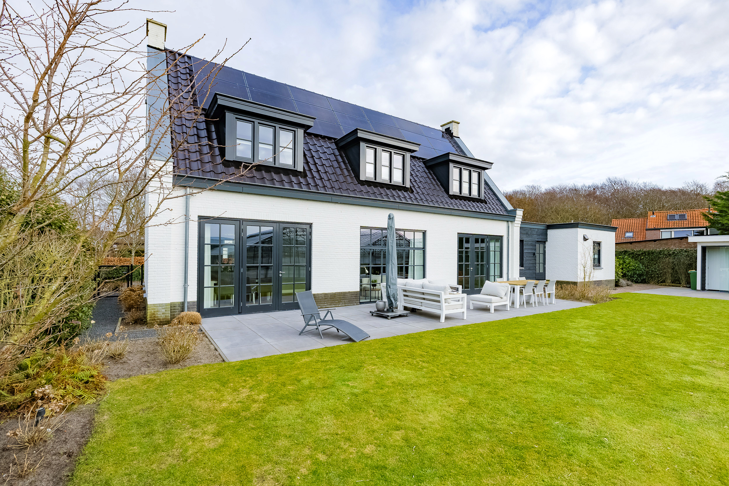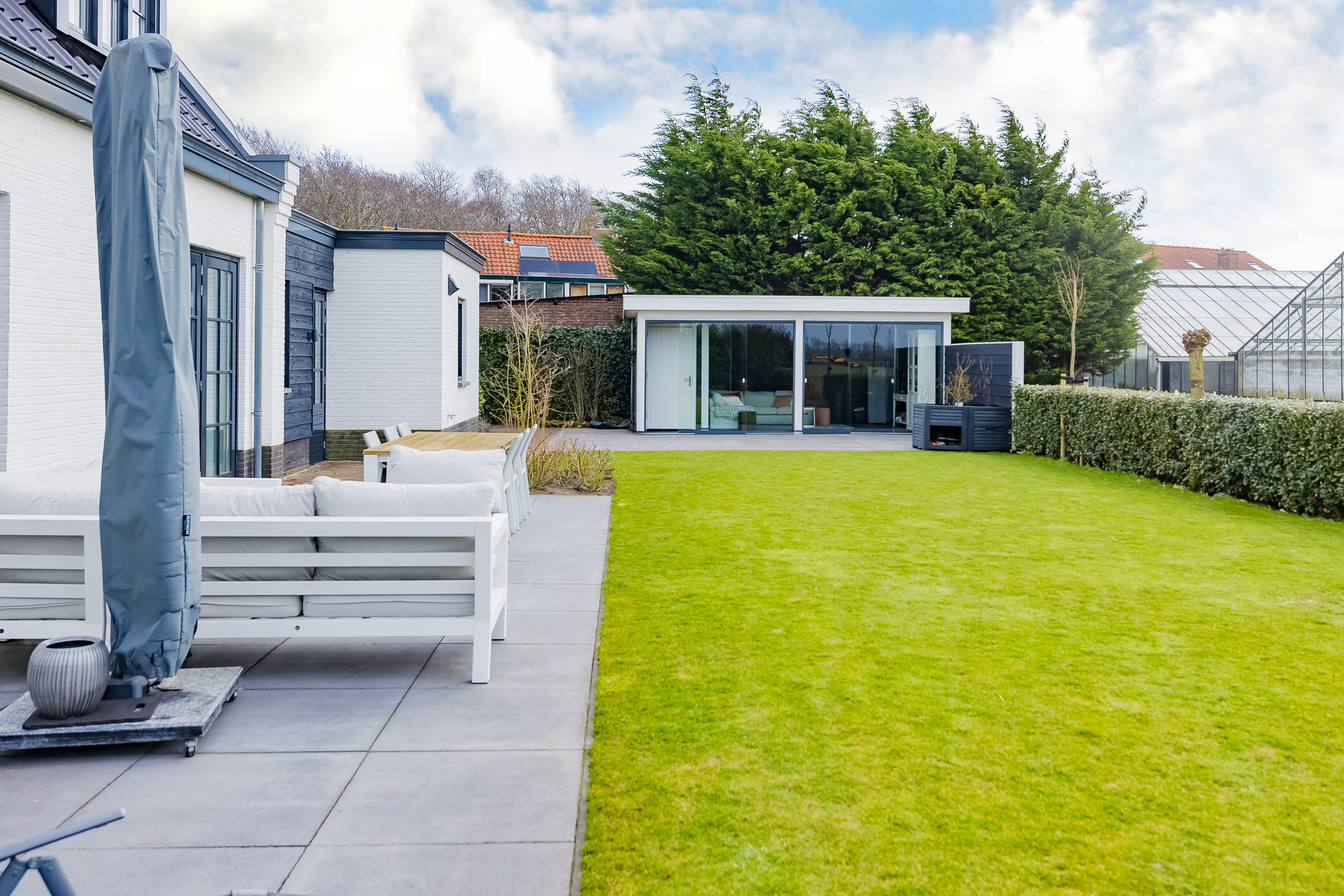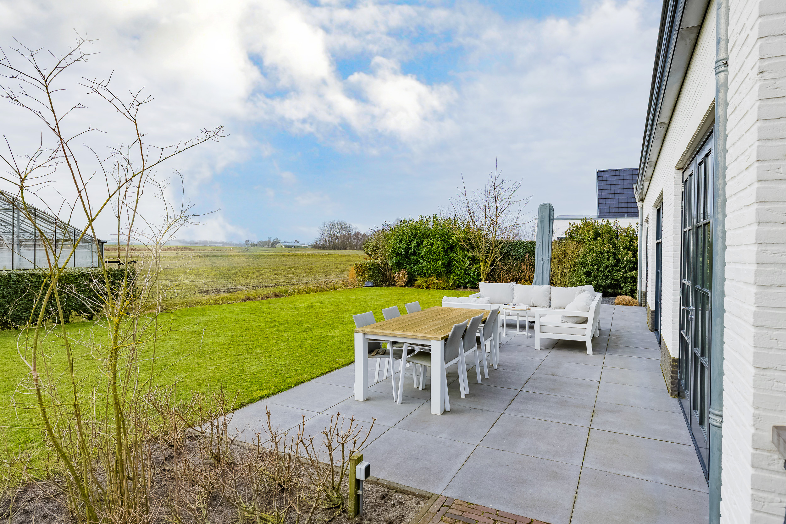 De tuin ligt rondom de woning en biedt altijd wel een zonnig plekje. Achter de woonkamer ligt een groot betegeld terras met een fenomenaal vrij uitzicht over de bollenvelden – hier geniet je elk seizoen van het landschap.