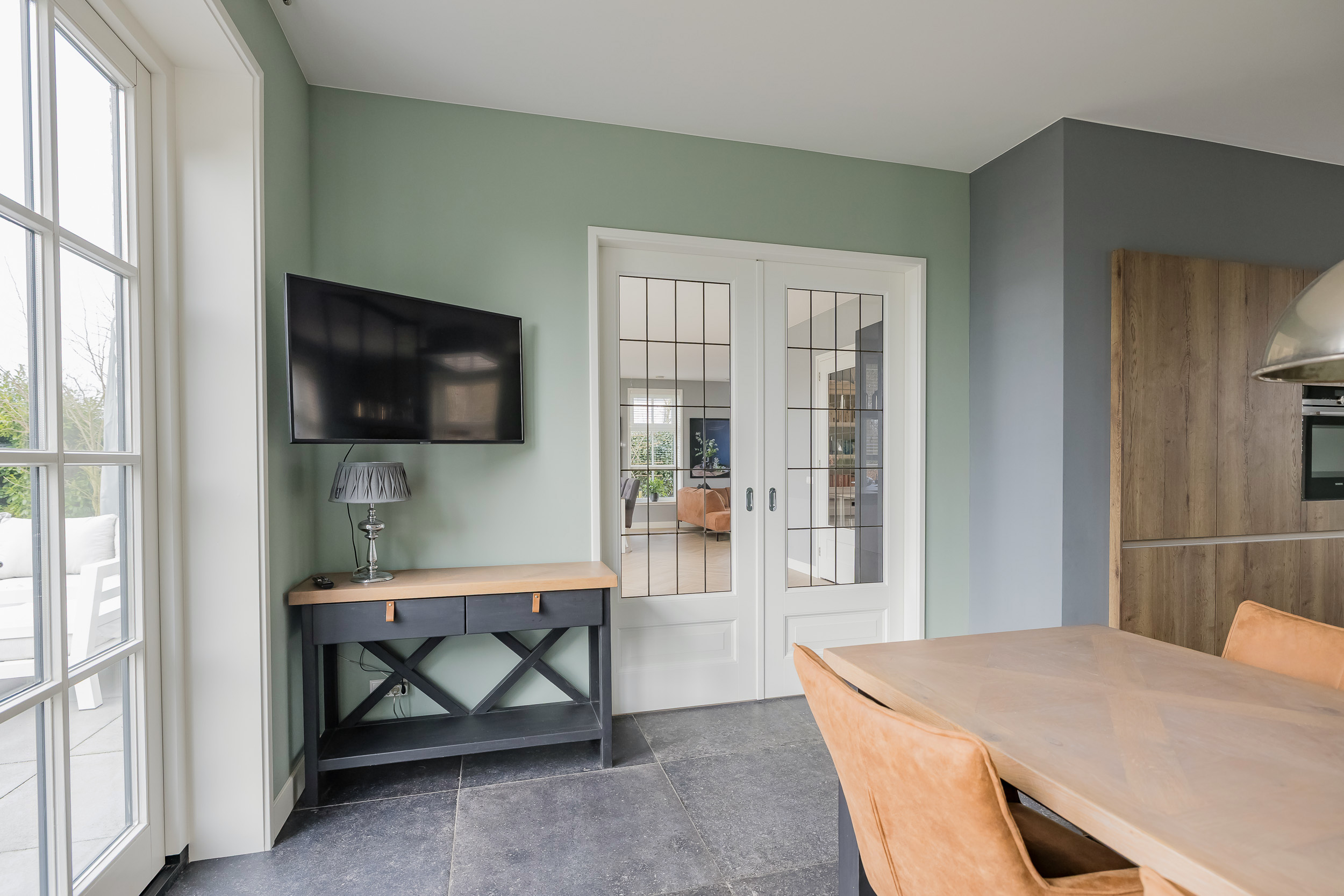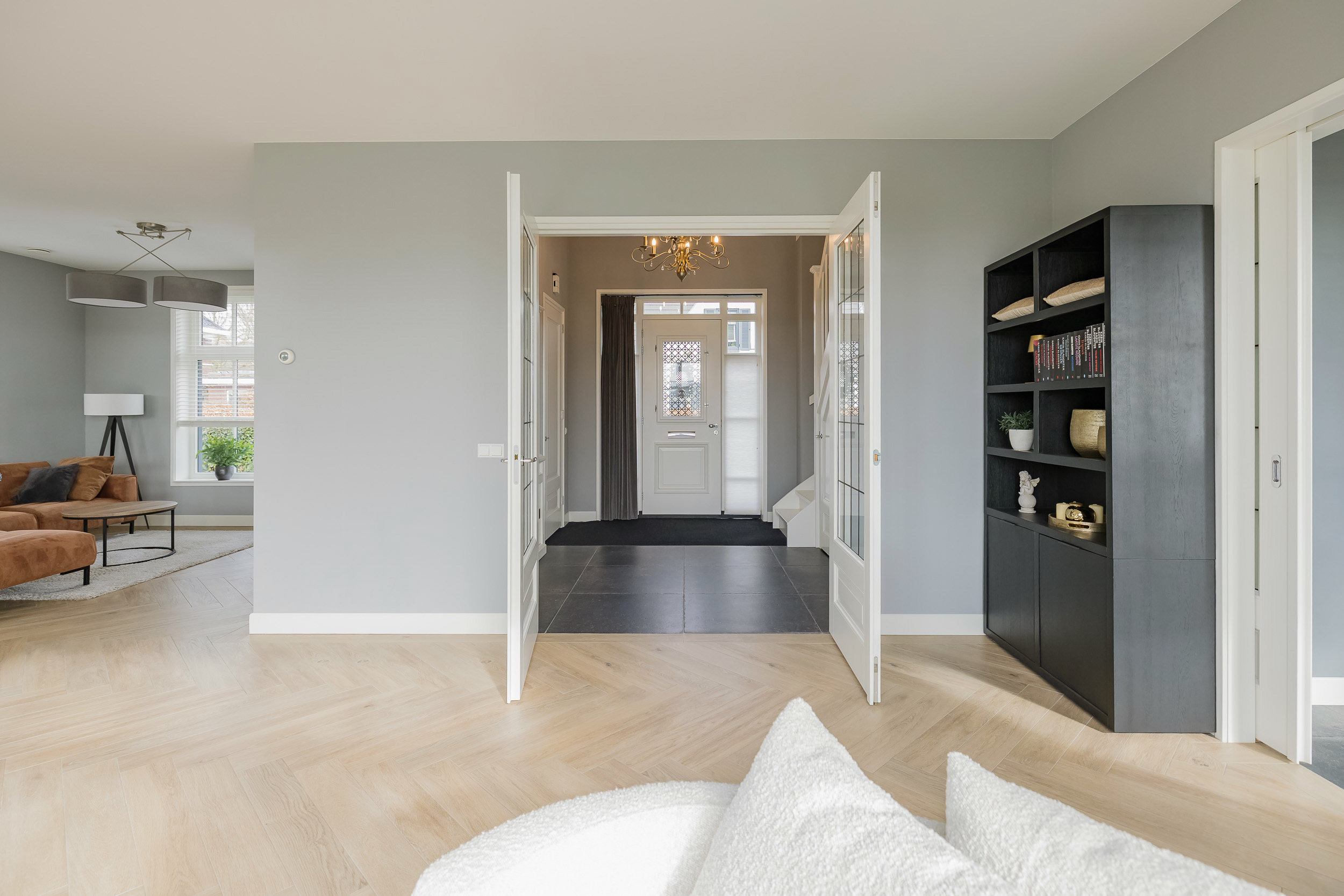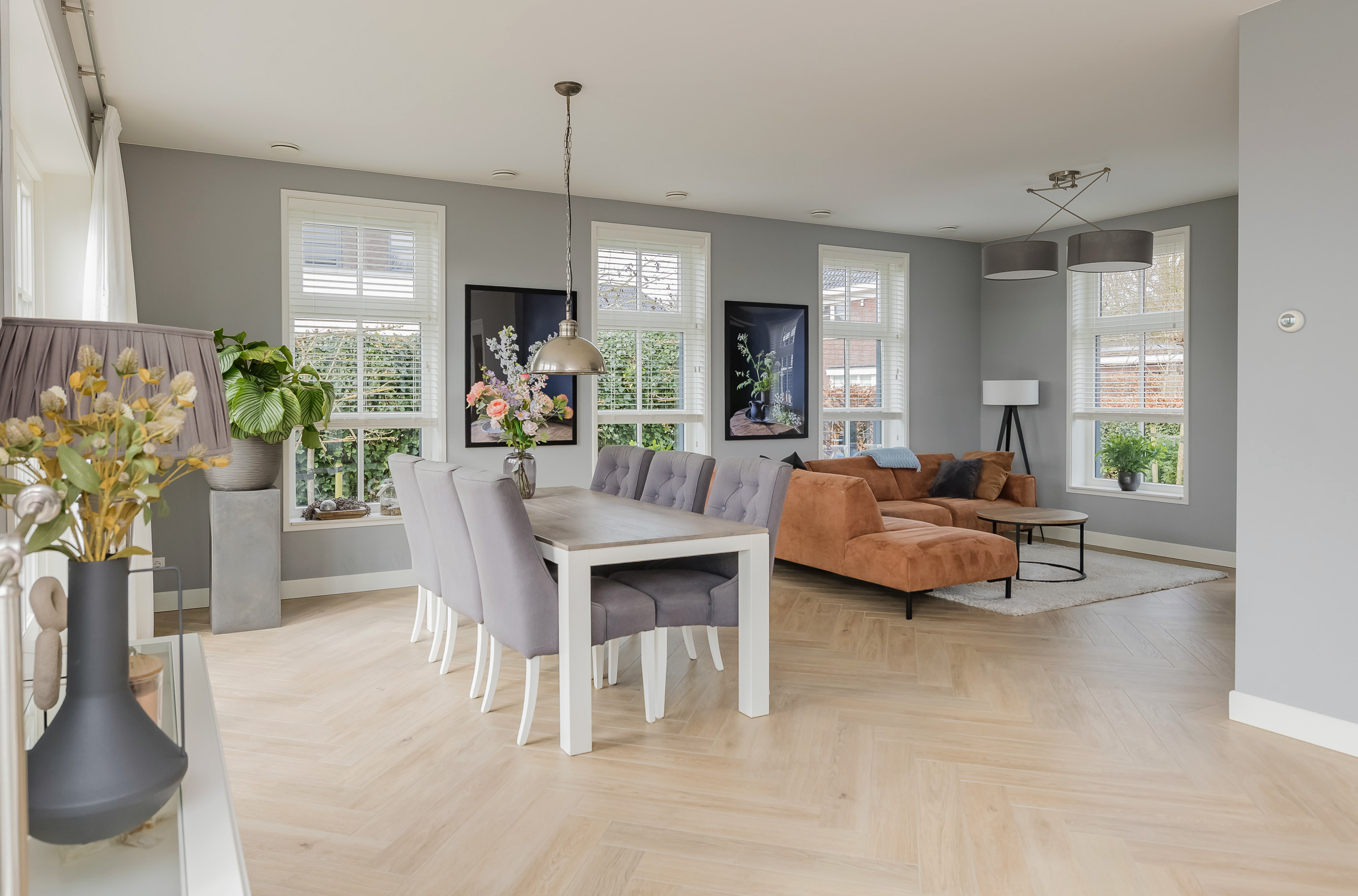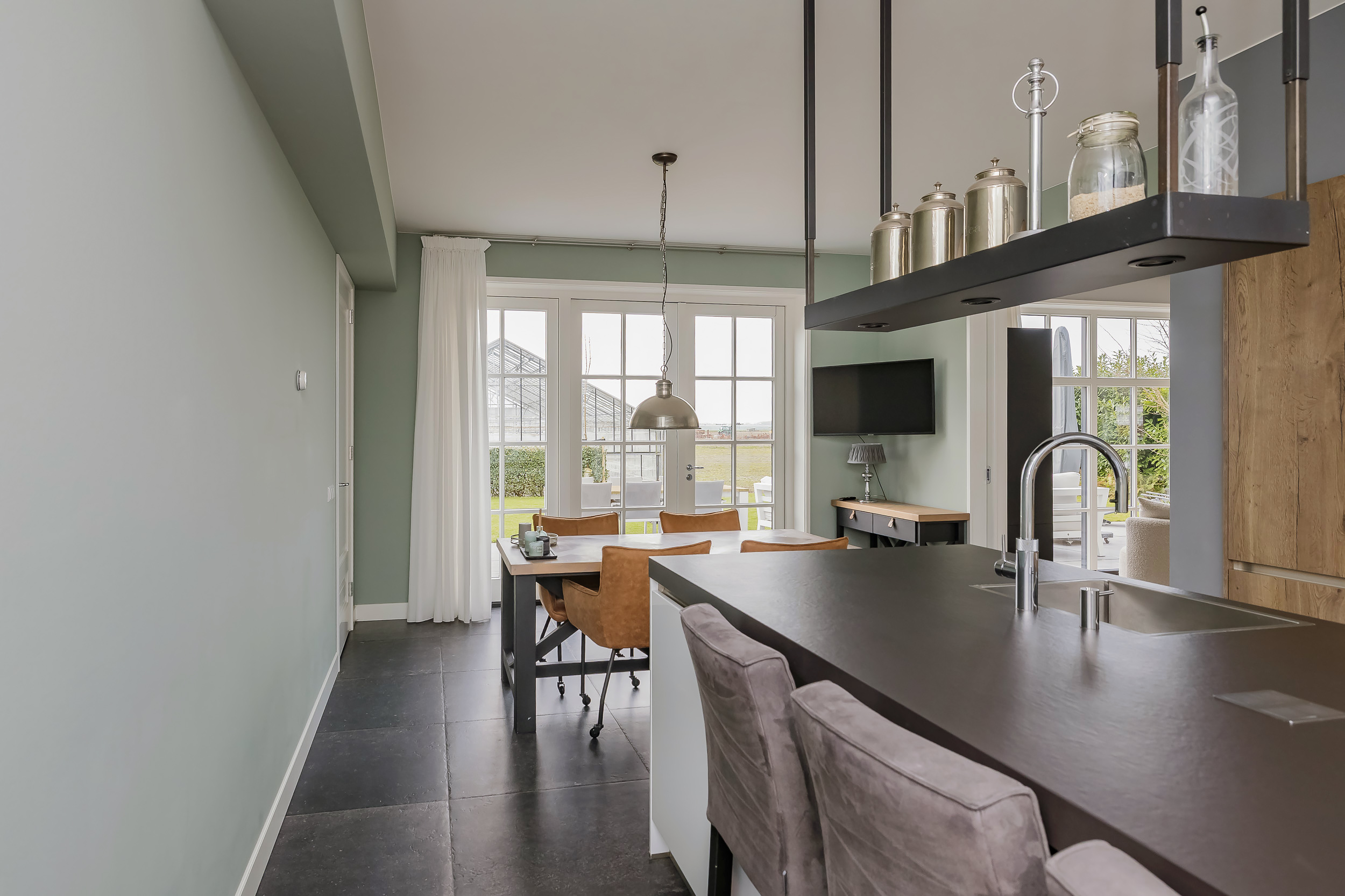 De woonkamer is ruim en licht dankzij de grote ramen met witte roedeverdeling en openslaande deuren naar het terras en de tuin rondom. Op de grond ligt een stijlvolle lichte tegelvloer. Aan de achterzijde geniet je van een fantastisch vrij uitzicht over de bollenvelden.