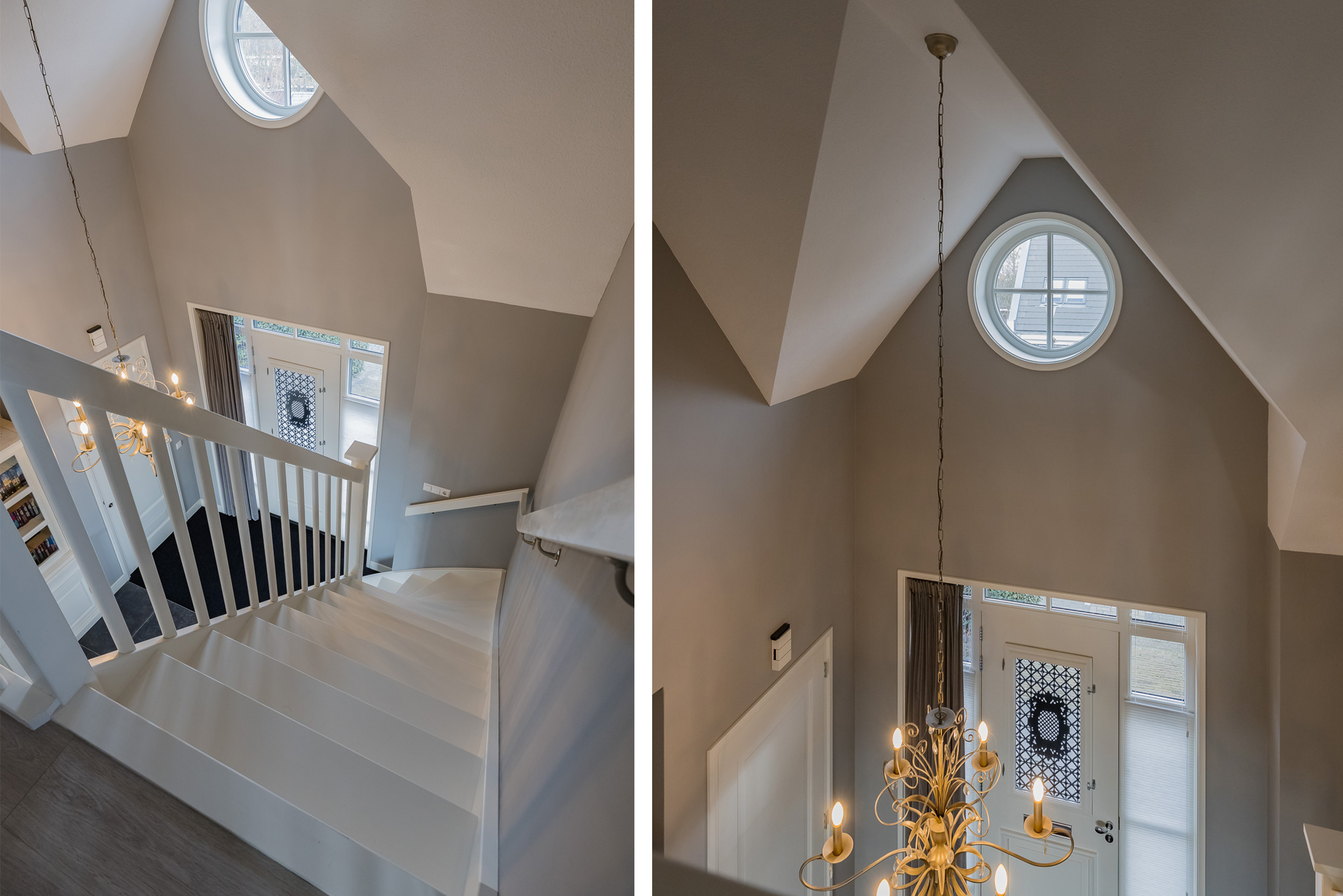 Zodra je binnenkomt, ervaar je de rust en het hoogwaardige afwerkingsniveau. De imposante hal met vide geeft toegang tot de royale woonkamer. Overal zie je de strakke ton-sur-ton afwerking in grijstinten gecombineerd met veel wit, wat zorgt voor een lichte en moderne uitstraling.