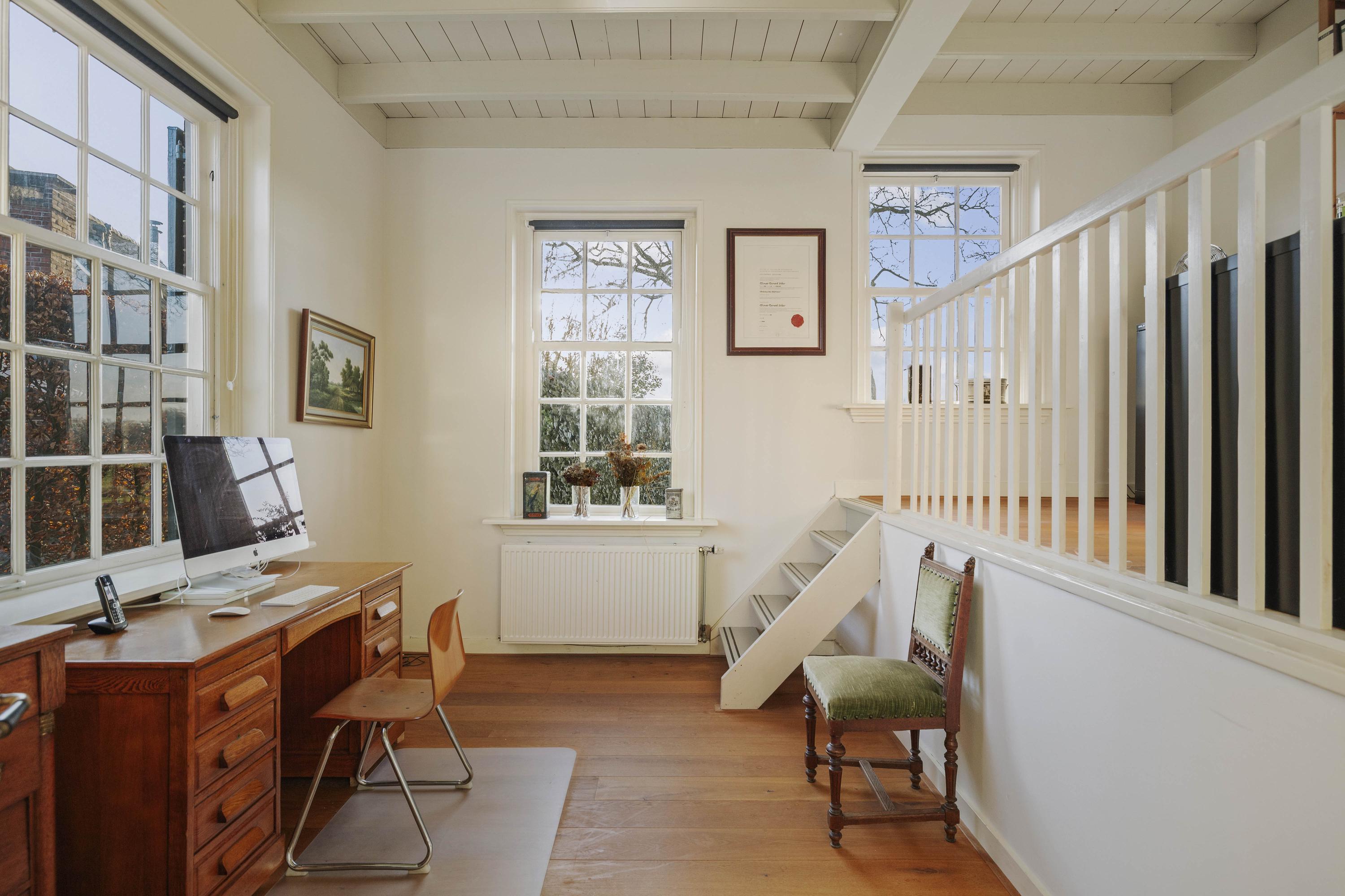 De met grind verharde oprit brengt ons bij de deel. In de Achterhoek is het een goed gebruik om ‘achterom’ binnen te komen en aan de achterzijde van het huis, met de indrukwekkende vergezichten over de belenende landerijen, bevindt zich de entree. In het programma is de klassieke indeling bewaard gebleven, want ook aan de voorzijde bevindt zich de traditionele voordeur. De hal, met de hoge plafonds, is zonnig en royaal, en op de vloer liggen de traditionele estrikken, die zo typerend zijn voor deze streek. De formele hal is voorzien van een Esscher plavuizen vloer en het geheel wordt fraai gecontrasteerd door de friswitte wanden en het roomkleurige houtwerk. In de hal is er toegang tot de WC en de badkamer op de begane grond, de eetkamer, de kelder en de opkamer die nu in gebruik is als kantoor met pantry, maar die ook perfect dienstdoet als gastenkamer.