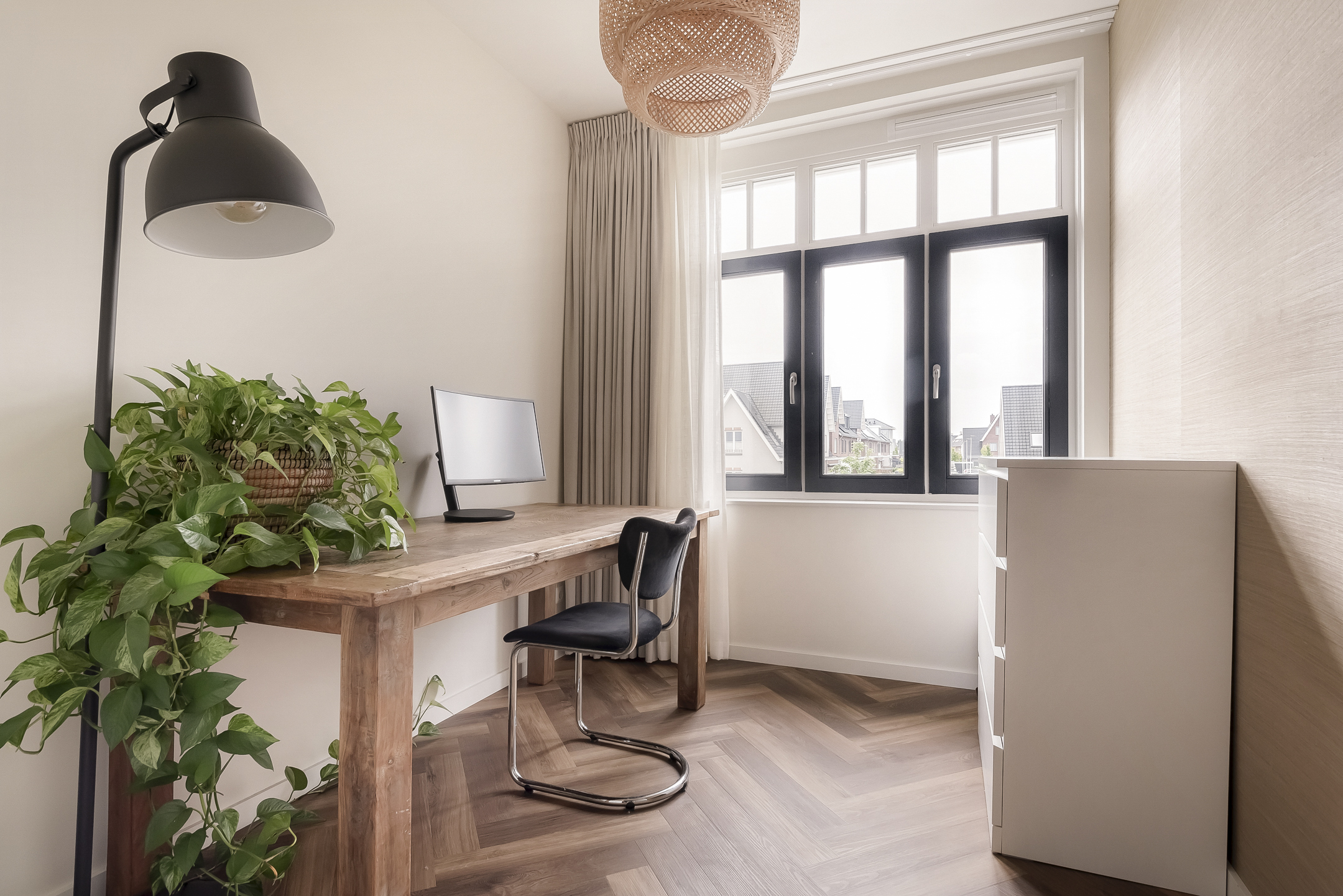 Op de eerste verdieping bevinden zich vier slaapkamers en een ruime badkamer. De kamer aan de voorzijde heeft een walk-in closet. Een tweede grote slaapkamer bevindt zich boven de berging en is voorzien van een Velux dakraam met zonwering en een zijraam met roedeverdeling. De twee slaapkamers aan de achterzijde zijn ideaal voor kinderen, gasten of een kantoor aan huis.