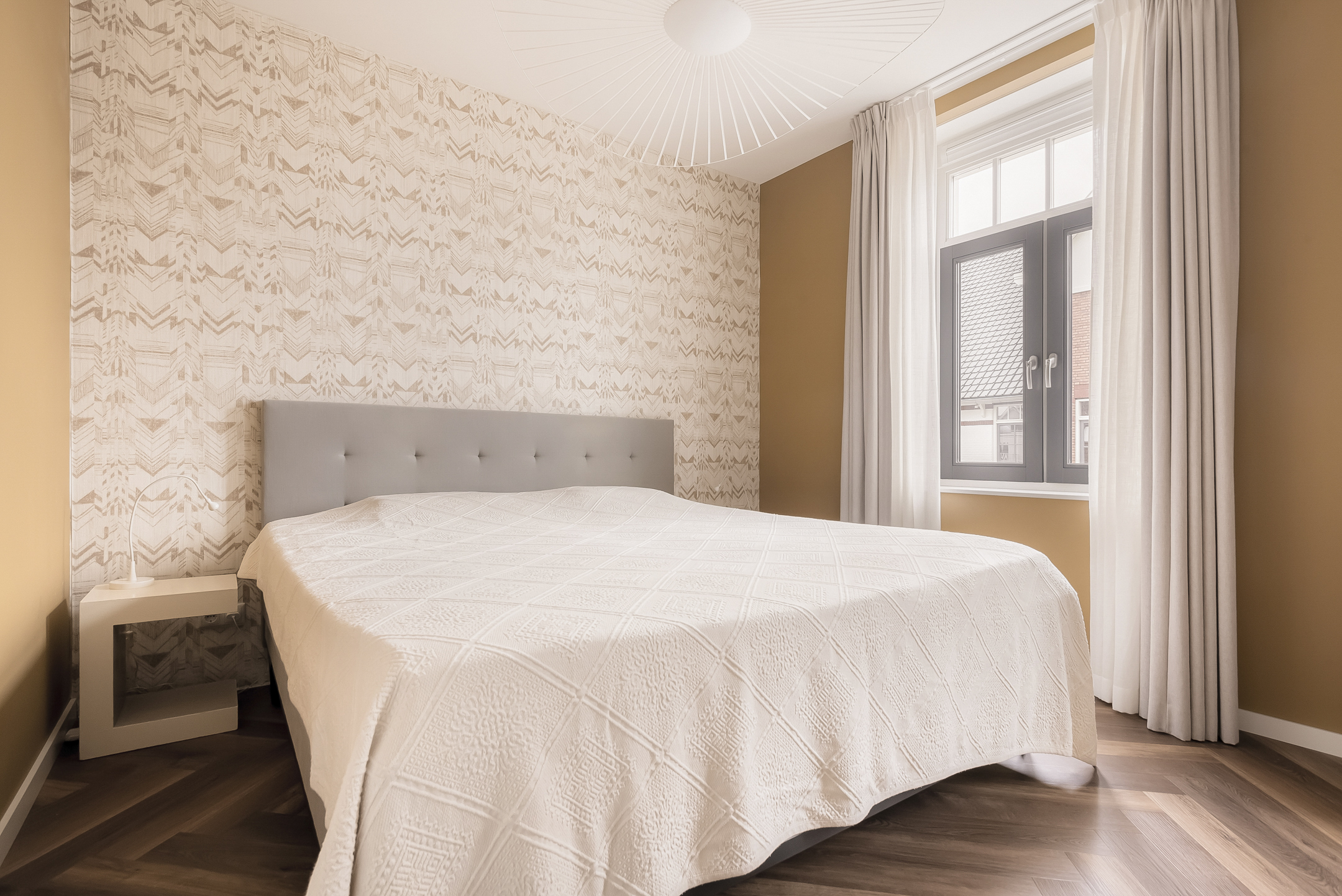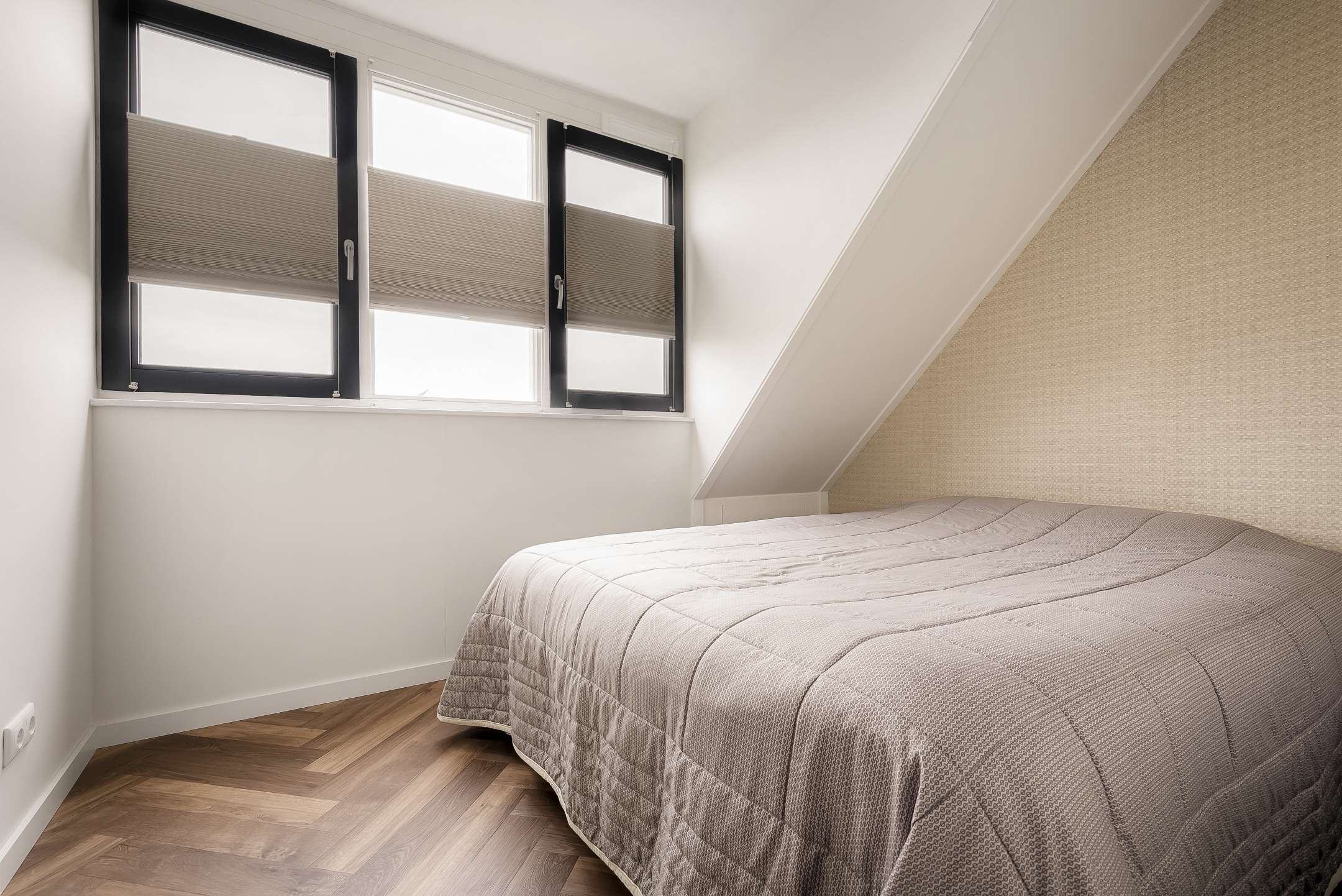 De slaapkamer aan de voorzijde is bijzonder dankzij het indrukwekkende plafond van maar liefst 4,5 meter hoog, wat deze kamer een ruimtelijk en uniek karakter geeft. Aan de achterzijde bevindt zich een tweede slaapkamer, gelegen naast de badkamer.