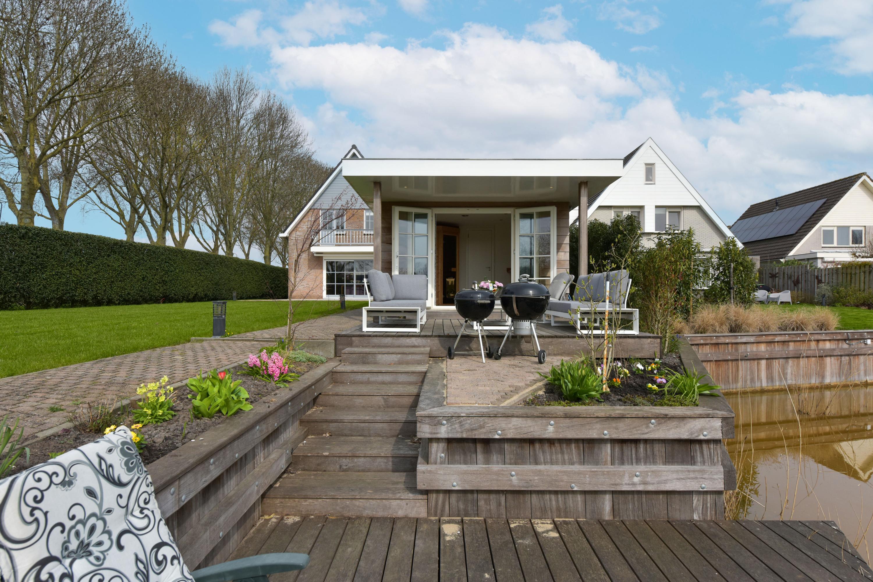 De tuin rondom de woning is met zorg aangelegd en perfect onderhouden. Dankzij een geavanceerd sproei- en druppelsysteem, gevoed door een pomp vanuit de sloot, blijft het groen in optimale conditie. Het ruime terras op het zuiden, voorzien van grote keramische tegels die naadloos aansluiten bij de vloer binnen, vormt een heerlijke plek om te genieten van zonnige dagen. Het elektrische zonnescherm is eenvoudig via een app te bedienen.