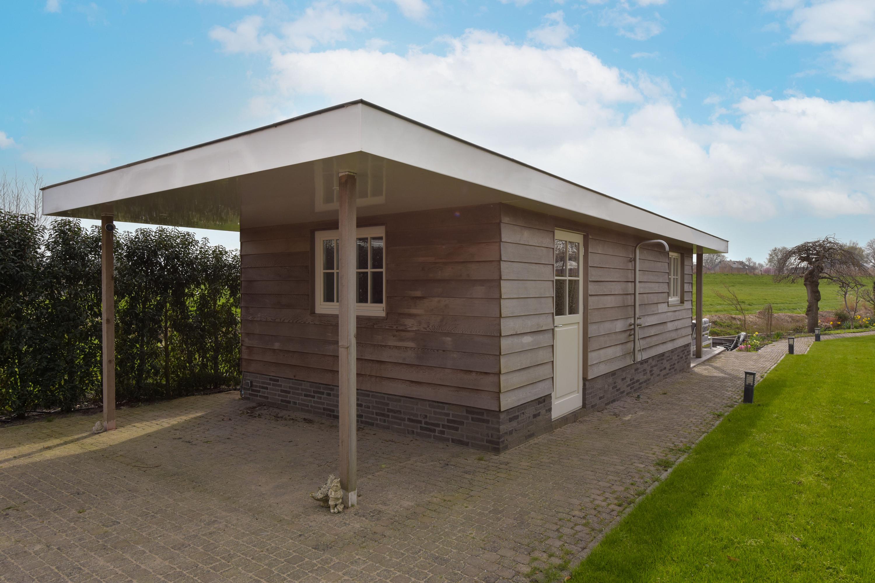 Het bijgebouw biedt bijzonder veel bergruimte en is zelfs voorzien van vloerverwarming. Aan de voorzijde een praktische berging waar ook de omvormer hangt van de PV installatie. Aan de achterzijde bevindt zich een luxe relaxruimte met sauna met een biokachel zodat er gekozen kan worden tussen een Finse sauna, een stoom sauna, kruidensauna en een geurensauna, regendouche, toilet en een houten keukenblok met twee horeca koelkasten, een plek waar ontspanning centraal staat. Het lager gelegen, aangrenzende terras biedt een prachtig uitzicht over het water en het omliggende groen en nodigt uit tot lange, ontspannen avonden. Achterin de tuin vind je diverse fruitbomen, waaronder een pruimenboom en een walnotenboom, en een volledig uitgeruste moestuin met water en elektriciteit. Door de gehele tuin is sfeervolle verlichting aangebracht en via een praktische achterom is de tuin ook buitenom bereikbaar. Een fantastische tuin waarin je kunt relaxen, kinderen eventueel een plek kunnen vinden om uitgebreid te spelen, waar je een enorm gevoel van ruimte en vrijheid in ervaart, een unieke plek! Vrijwel de gehele woning is bovendien voorzien van plissé horren, wat bijdraagt aan het comfort in de warmere maanden.