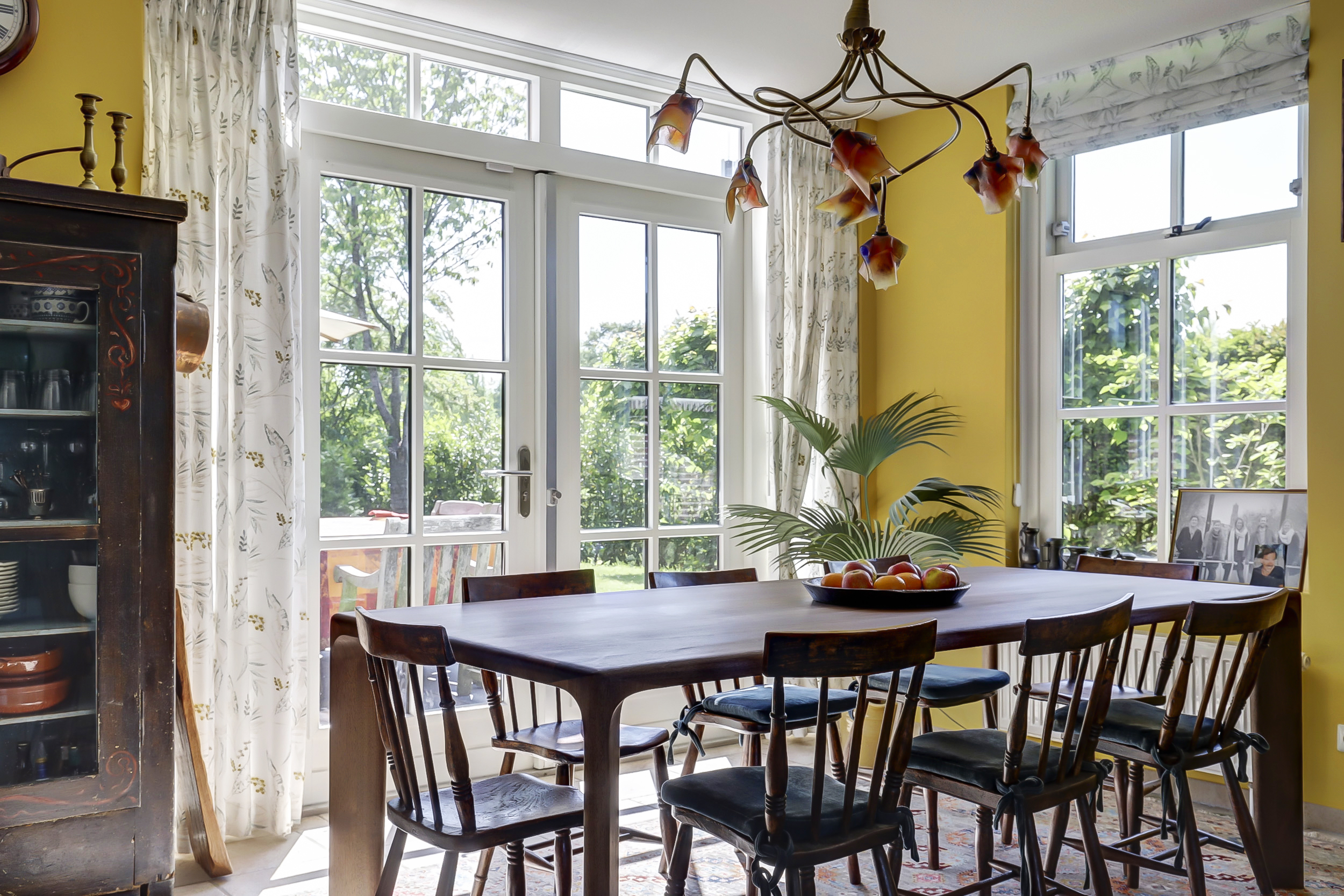 Het huis beschikt over een royale, lichte living met een erker en een sfeervolle open haard. De woonkamer is lekker licht door de grote raampartijen en de openslaande tuindeuren. De living staat in een open verbinding met de ruime eetkeuken, die plaats genoeg heeft voor een grote eettafel. Ook hier zijn openslaande tuindeuren die openen naar het zonnige terras met veranda.