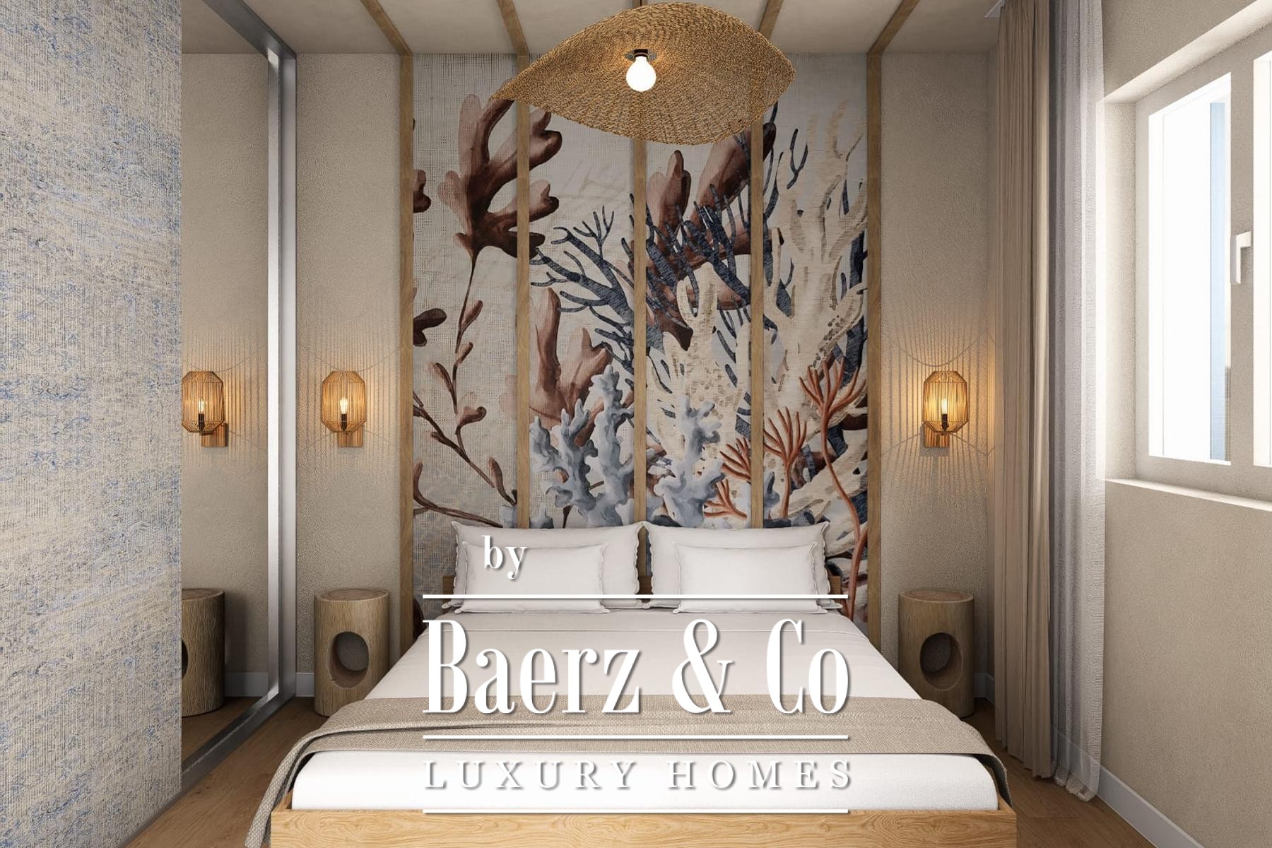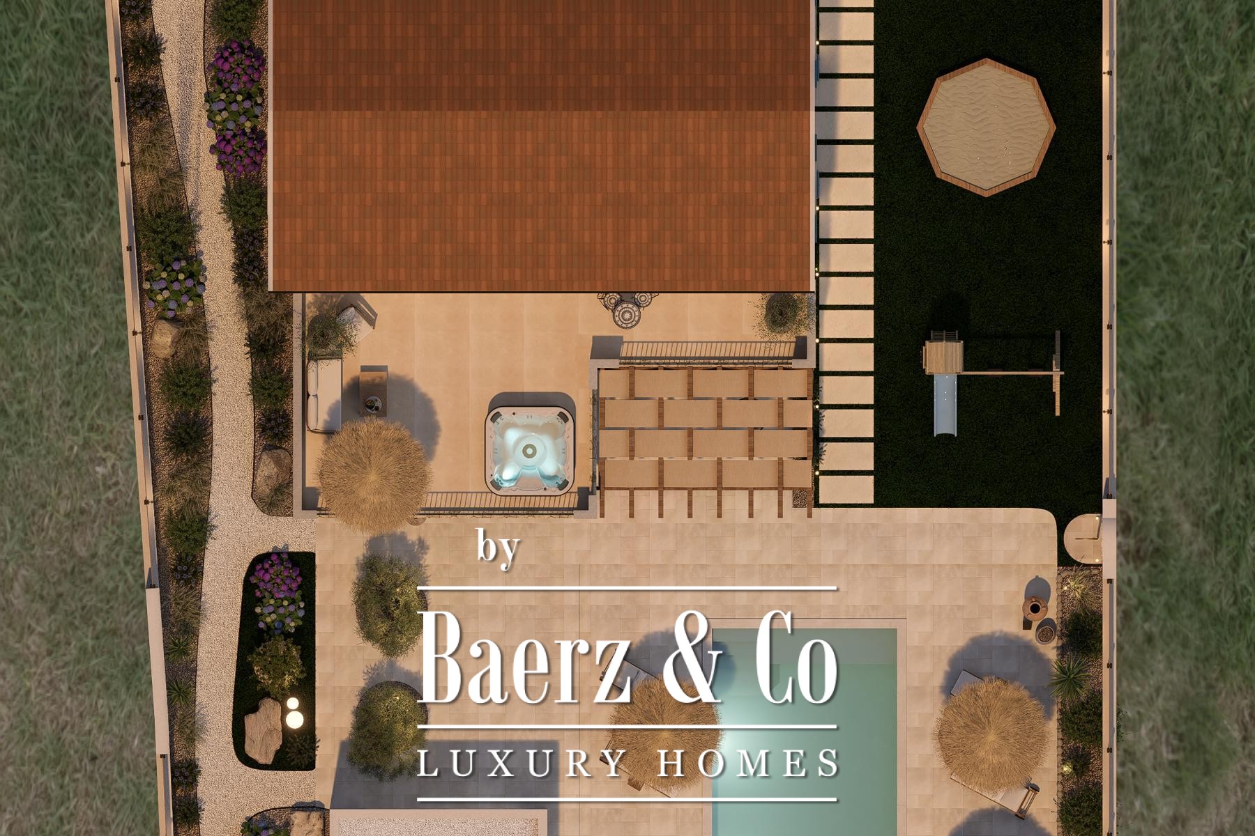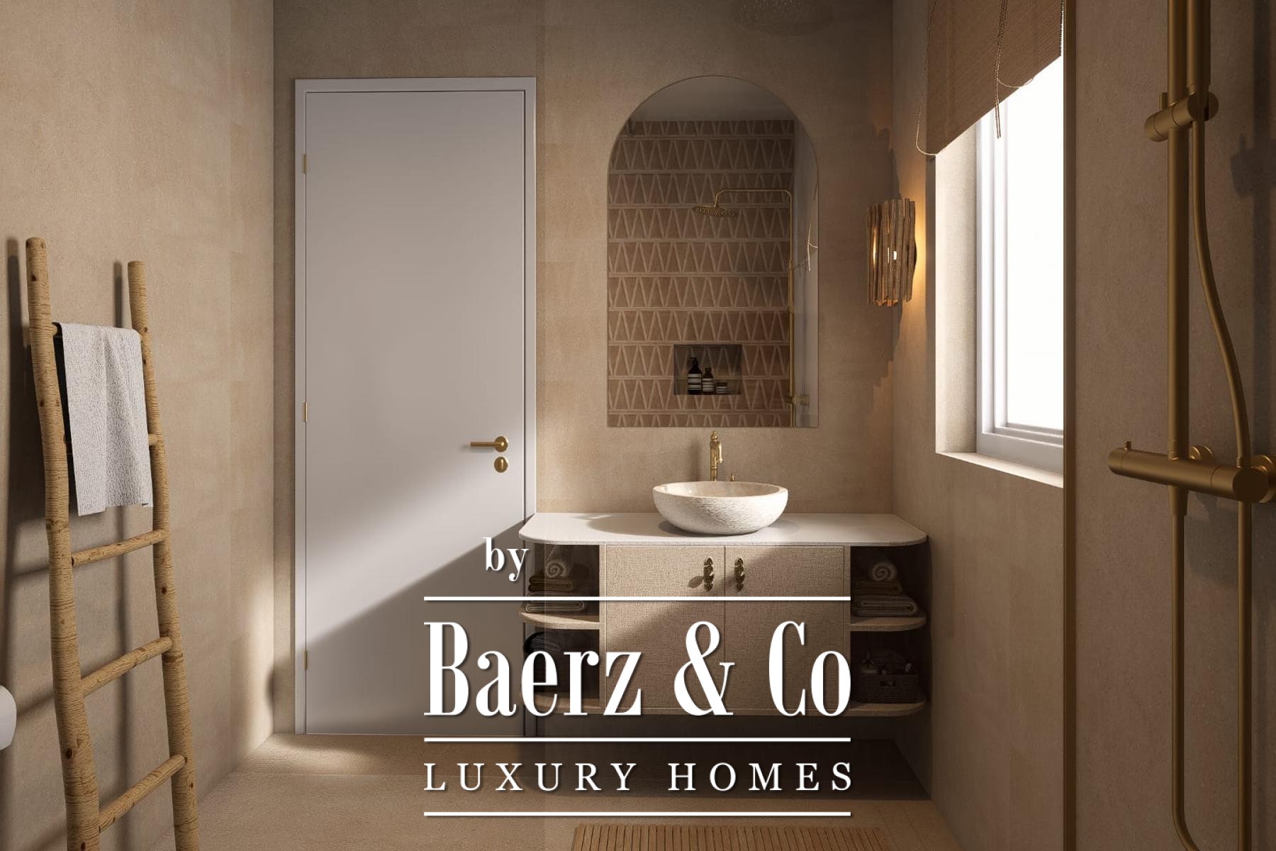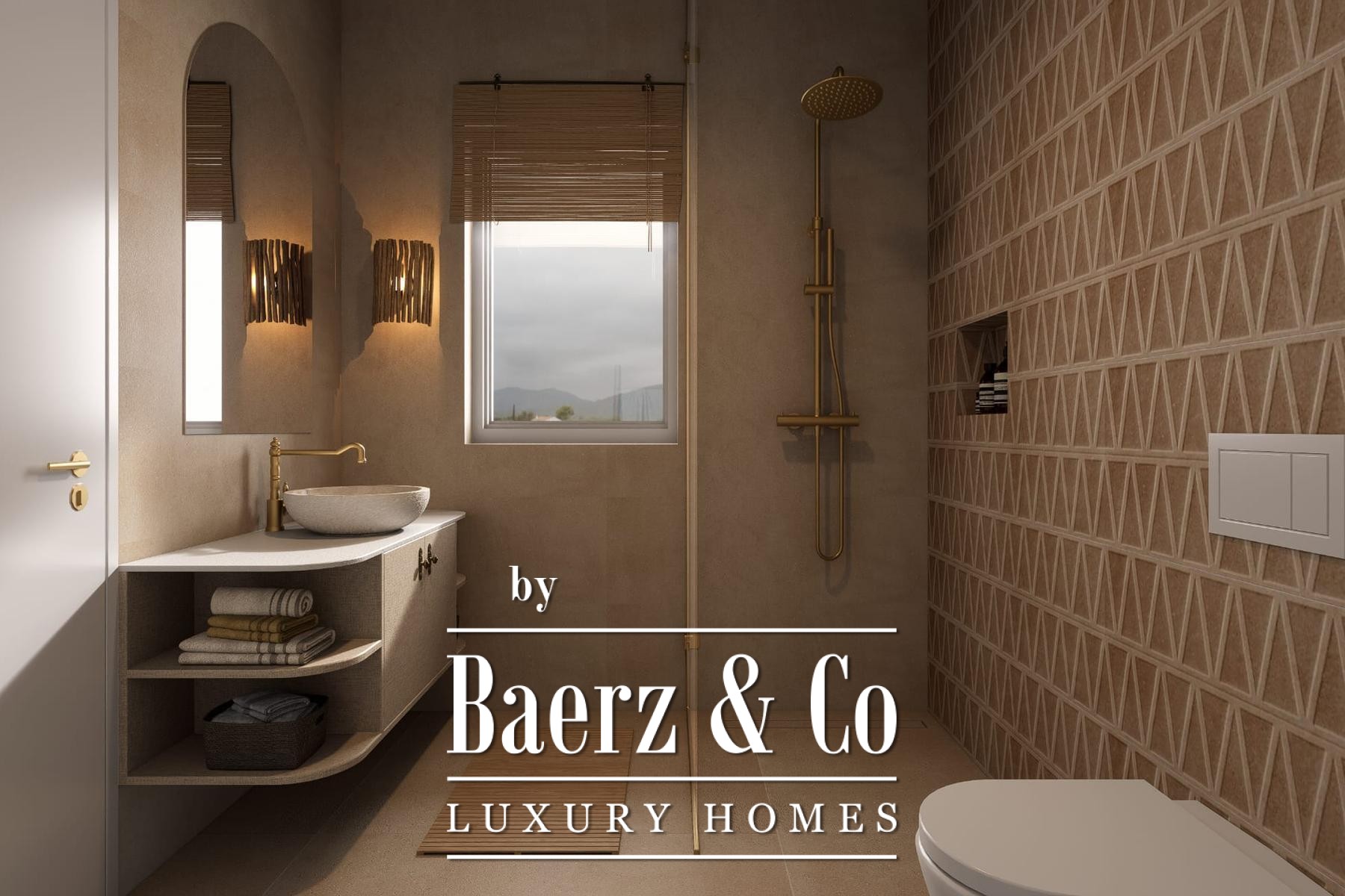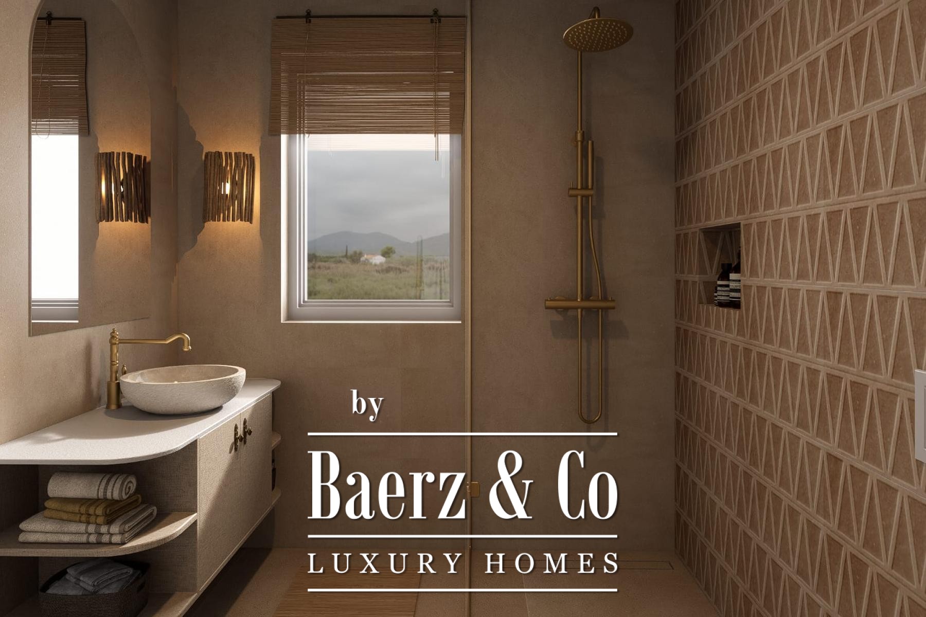 Op de bovenverdieping bevinden zich drie slaapkamers en twee badkamers, die uitkomen op een overdekt terras en zorgen voor een natuurlijke lichtinval en frisse lucht. Zorgvuldig gekozen materialen – natuursteen, hout en hoogwaardige afwerking – verankeren de villa in ingetogen luxe en bieden een warme uitstraling.