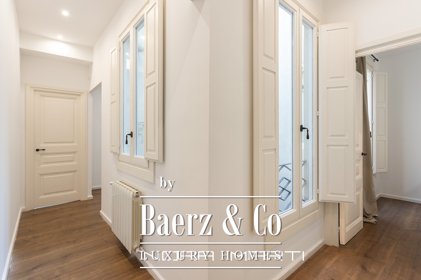 Площадь апартаментов составляет 152 м²; они подверглись комплексной реновации, объединившей современные решения с историческими элементами. Внутри изысканная современная мебель создает гармонию и цельность, определяя атмосферу сдержанной городской жизни. Планировка включает три спальни — одну двухместную и две одноместные — и две ванные комнаты, что обеспечивает баланс между приватными и общественными пространствами. Высокие окна в гостиной, характерные для эпохи постройки, наполняют помещения естественным светом, дополненным выгодной ориентацией и теплом паркетных полов. Полностью оборудованная кухня с зоной для завтраков вносит дополнительный комфорт в повседневную рутину.