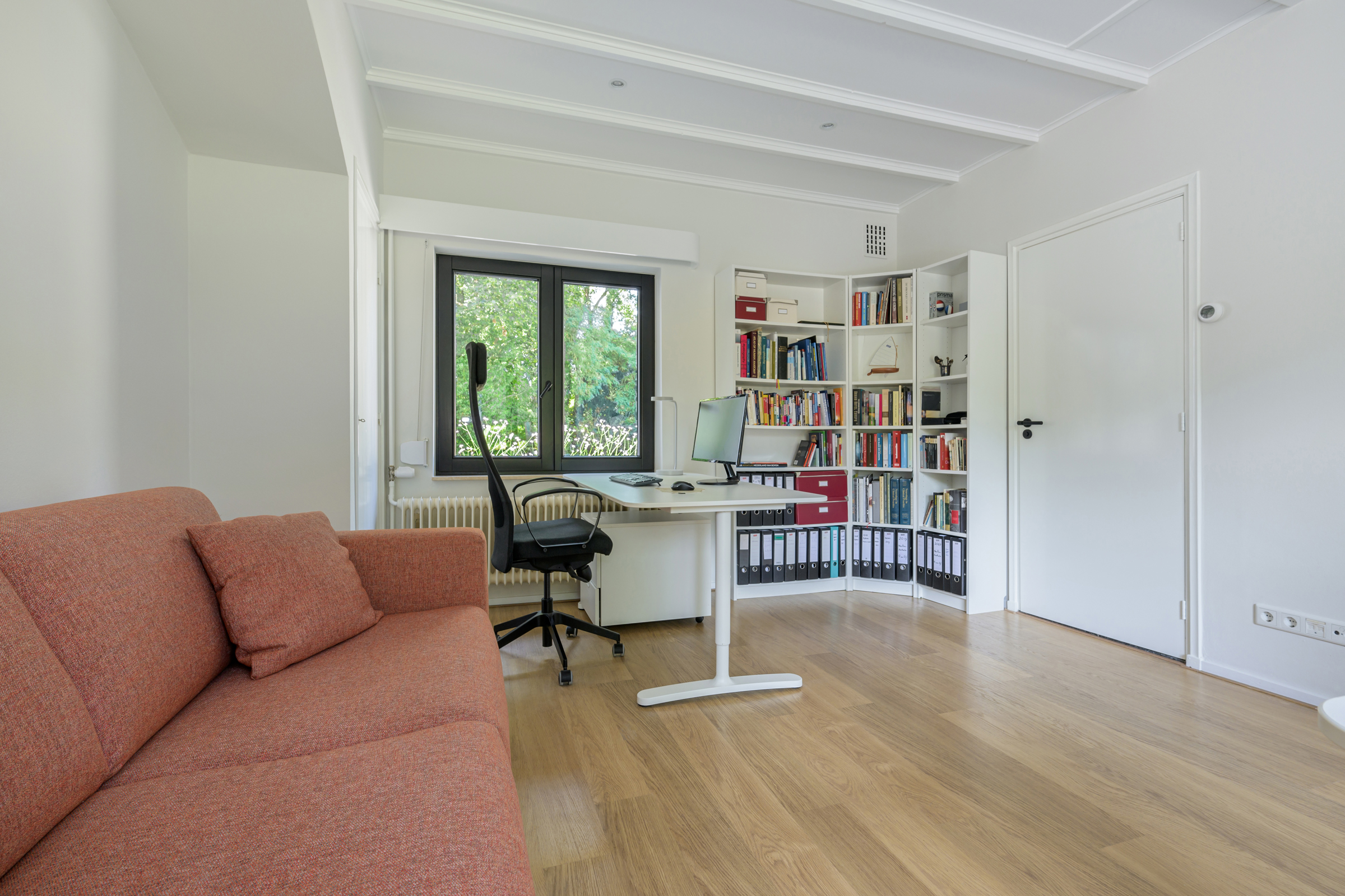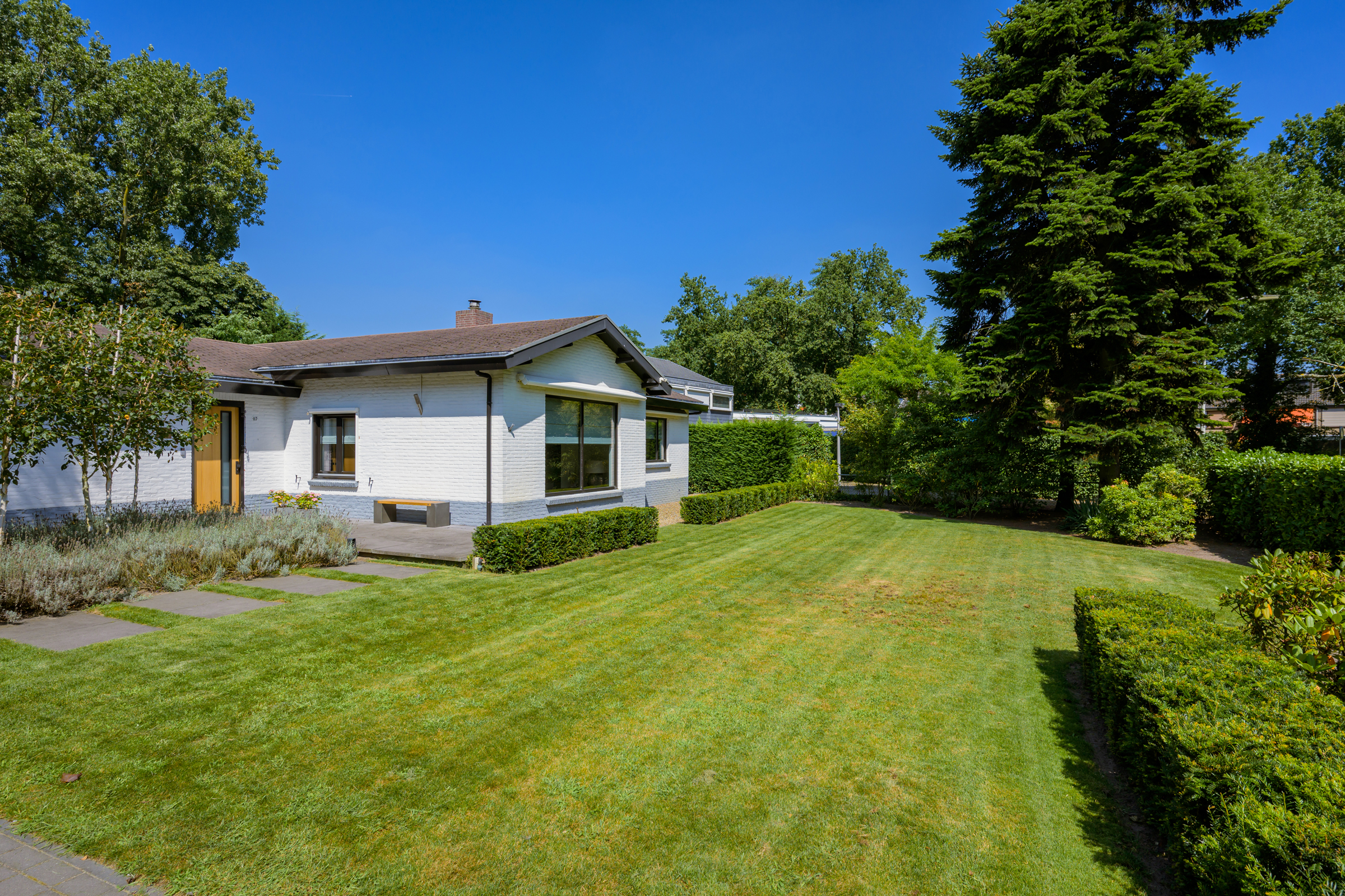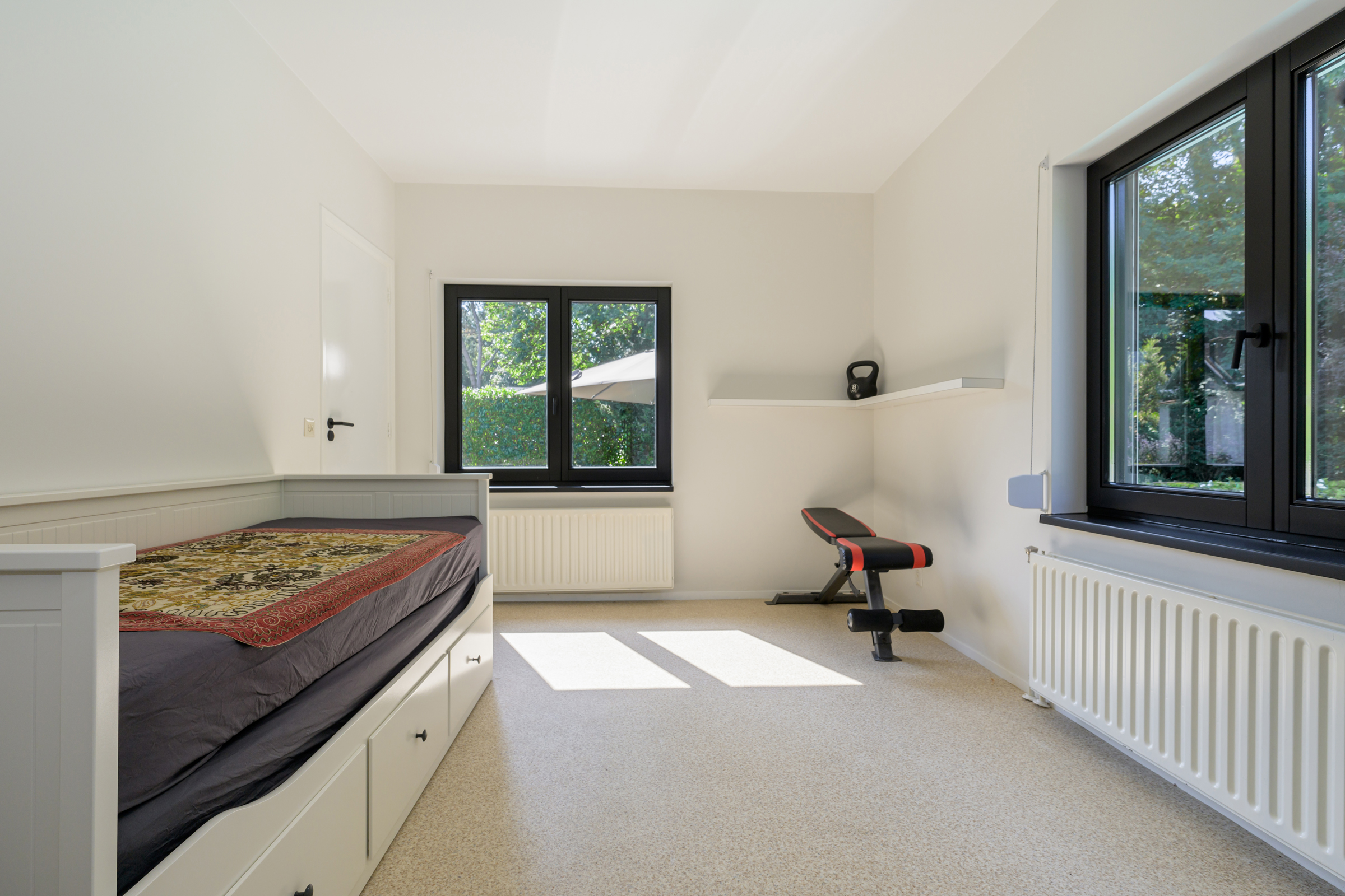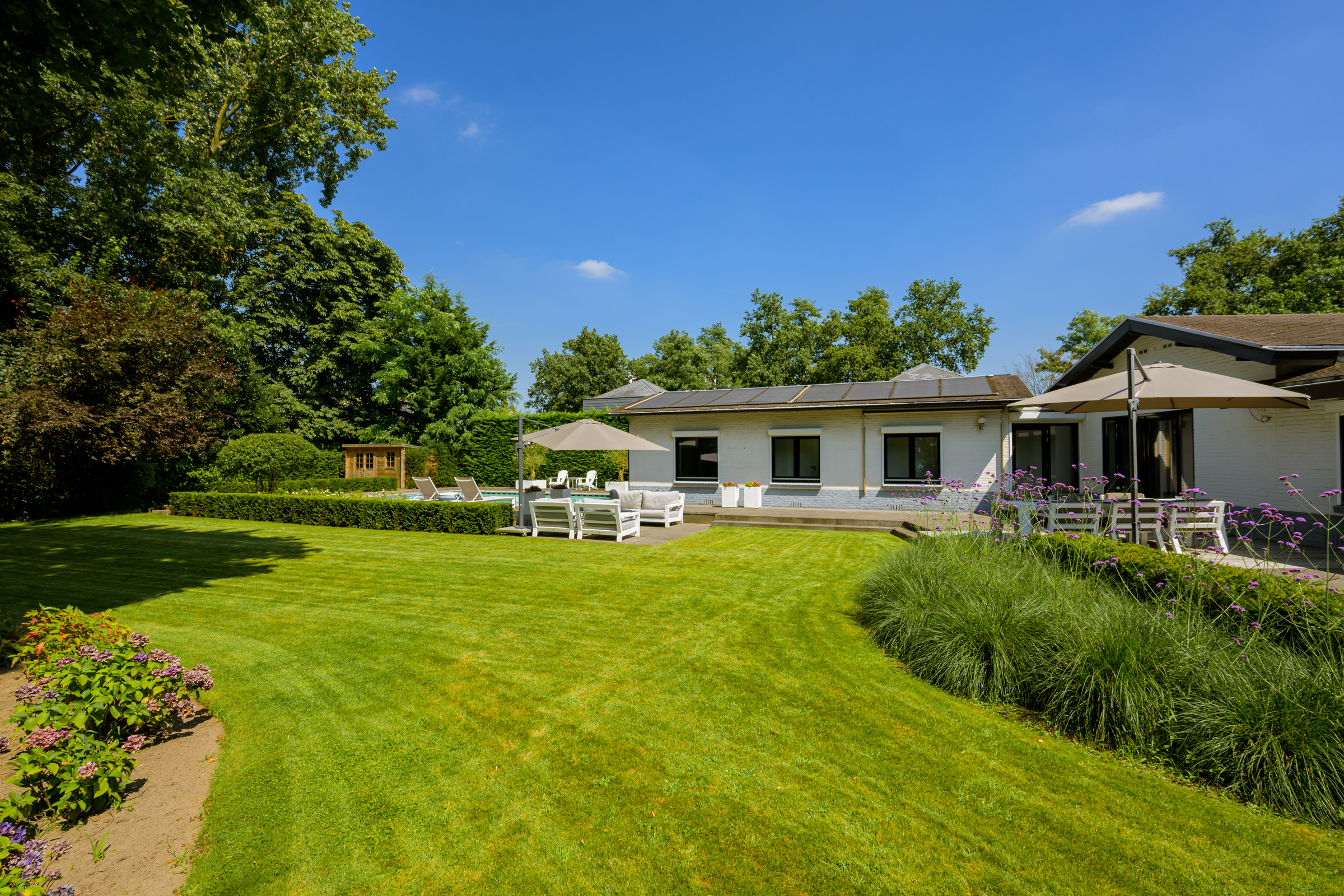 В доме реализованы современные устойчивые технологии — утепление пола и потолка, стеклопакеты HR++, 18 солнечных панелей и современное отопление — всё для создания эффективной и спокойной атмосферы. Крупноформатный сланцевый кафель, паркет и массивные деревянные полы подчеркивают сдержанный характер, а потолочные балки и встроенное освещение создают ритмичное ощущение пространства. Зона гостиной с камином через стеклянные двери плавно перетекает в сад и соединяется с отдельной столовой и полностью оборудованной кухней с подсобным помещением.