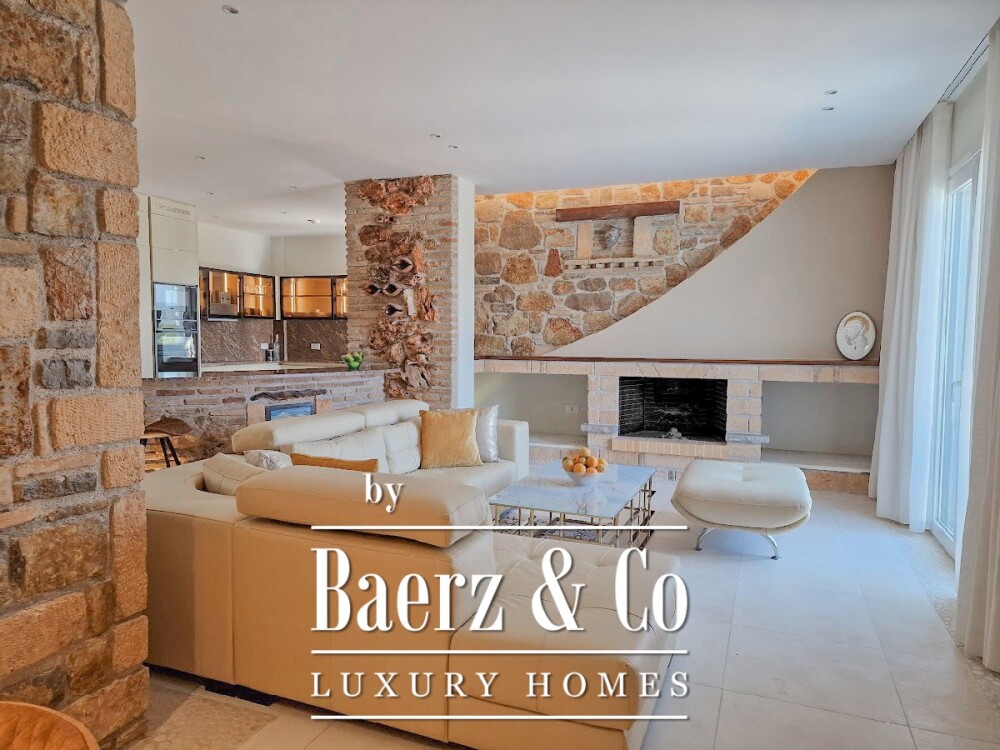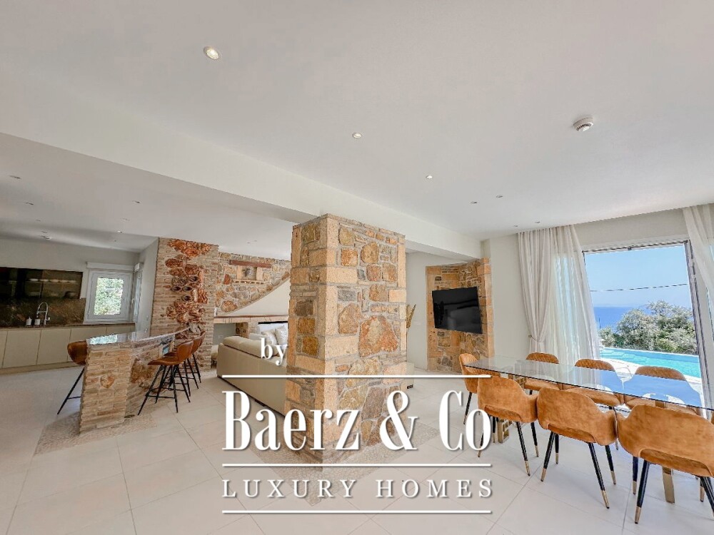 Верхний этаж отведен под впечатляющий мастер-сьют с джакузи и 50 м² террас с панорамными видами на море и горы, наполняя пространство естественным светом. На участке высокий каменный забор обеспечивает приватность, а тщательно благоустроенный сад и зона бассейна открывают вид на горизонт, обрамляя живописные панорамы.
