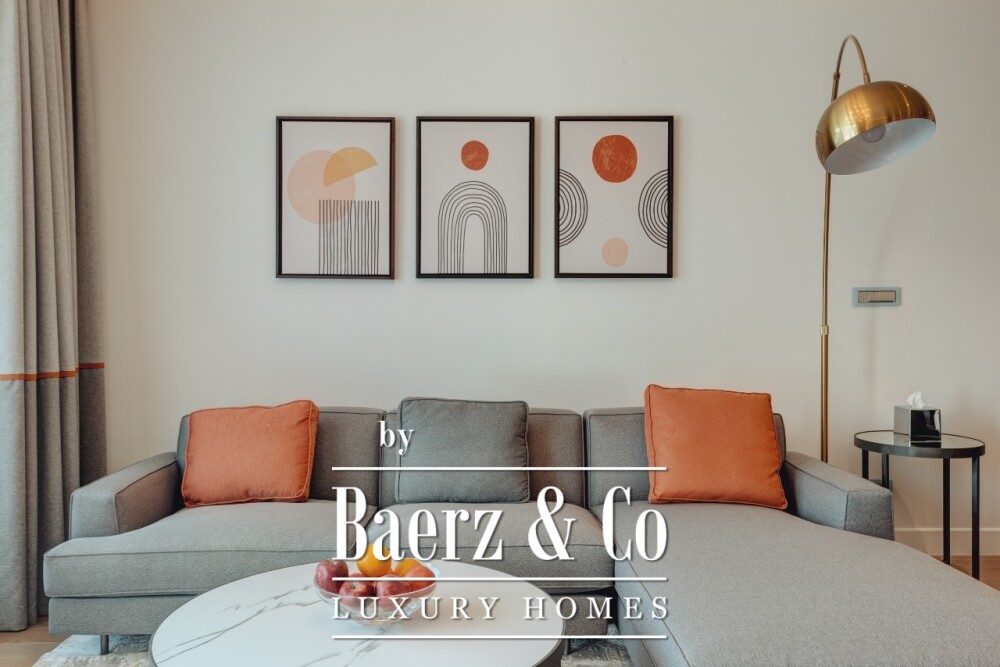 Внутреннее пространство организовано так, что из прихожей осуществляется переход в гостиную с объединённой кухней и столовой, затем – в отдельную спальню, полноценную ванную комнату и дополнительный гостевой санузел. Квартира полностью меблирована с вниманием к деталям и готова к заселению, обеспечивая утончённый уровень комфорта и доступ к бассейнам, пляжам и спортивным площадкам в пределах комплекса. Услуги по обслуживанию также предоставляются, что делает образ жизни максимально комфортным.