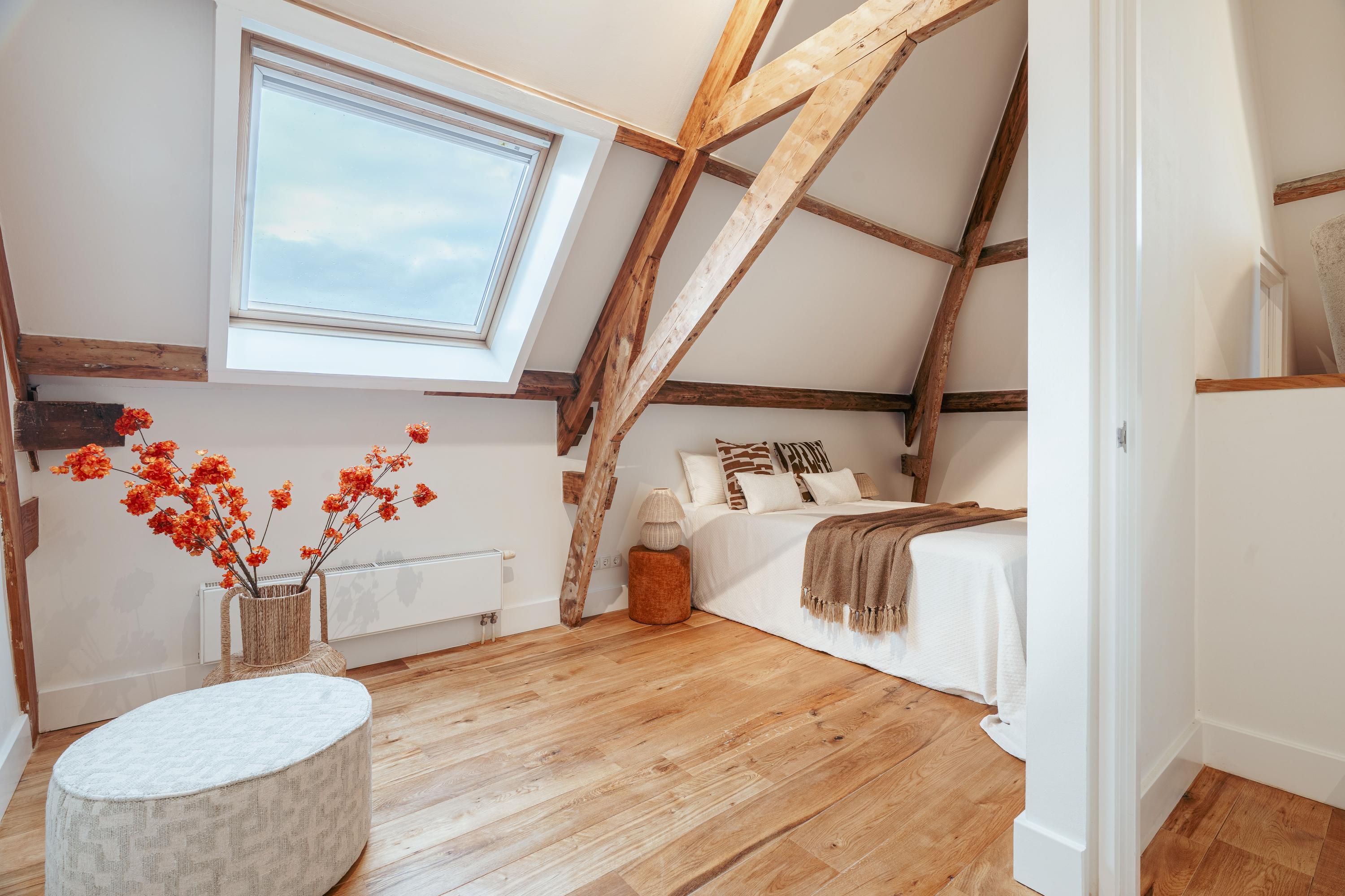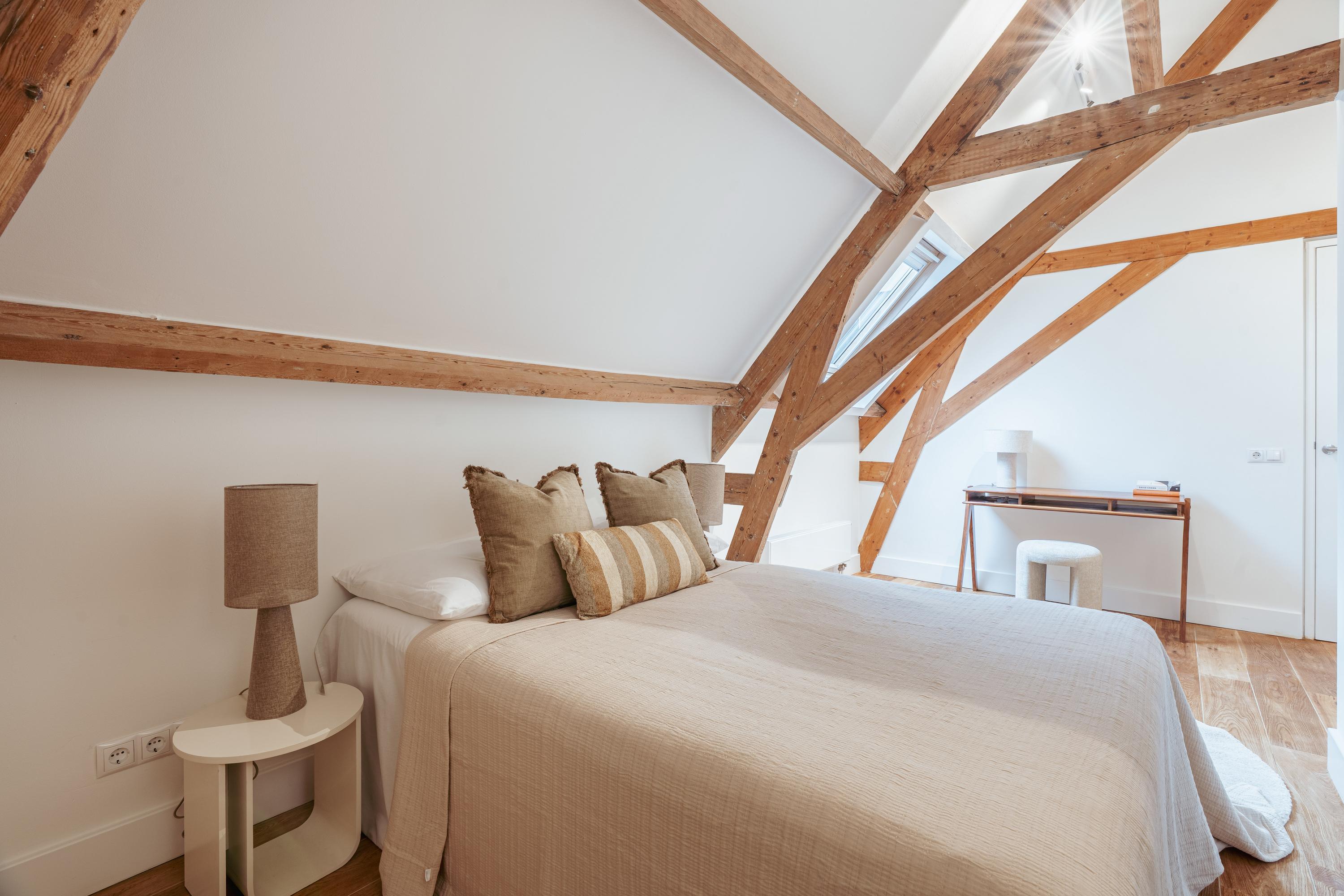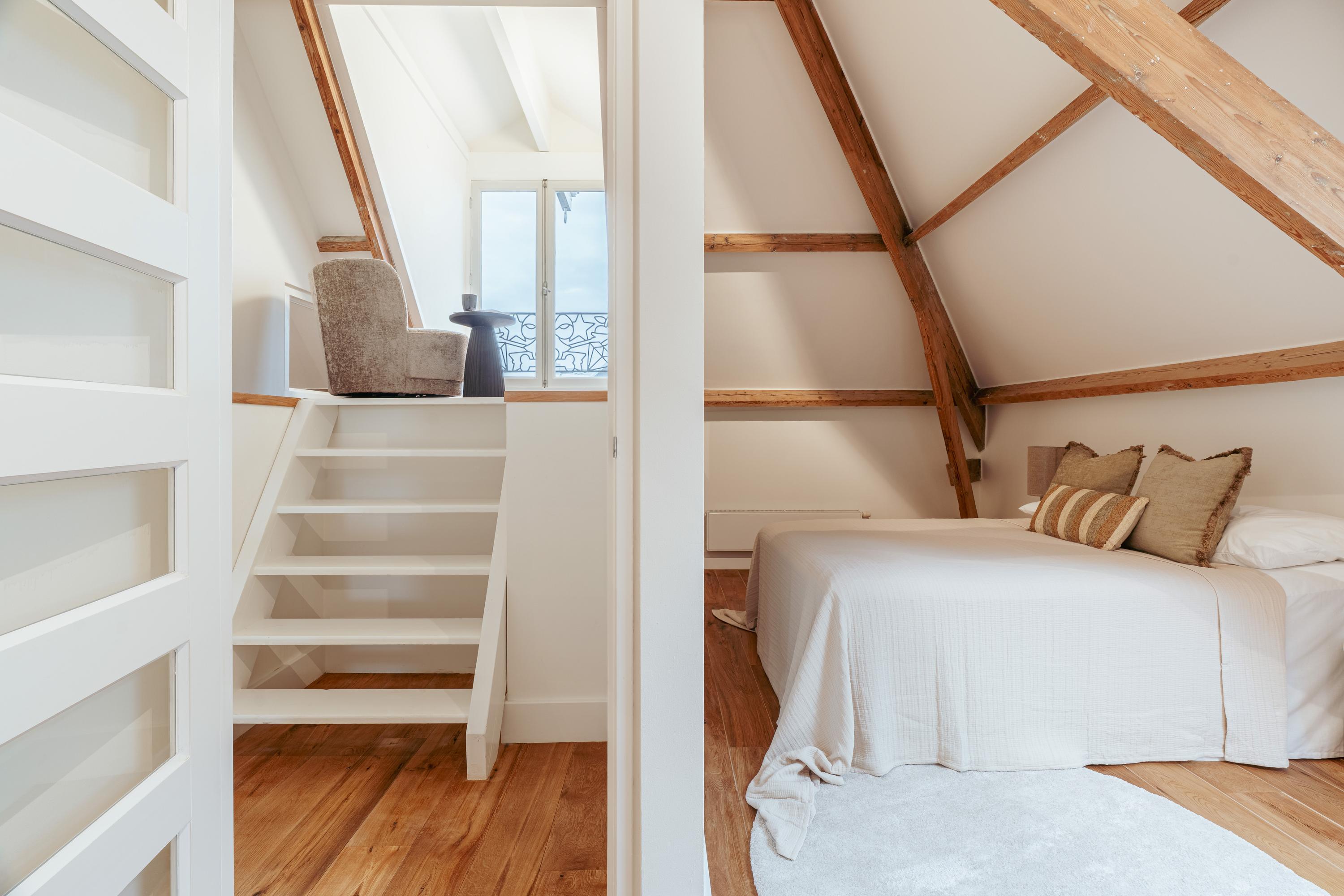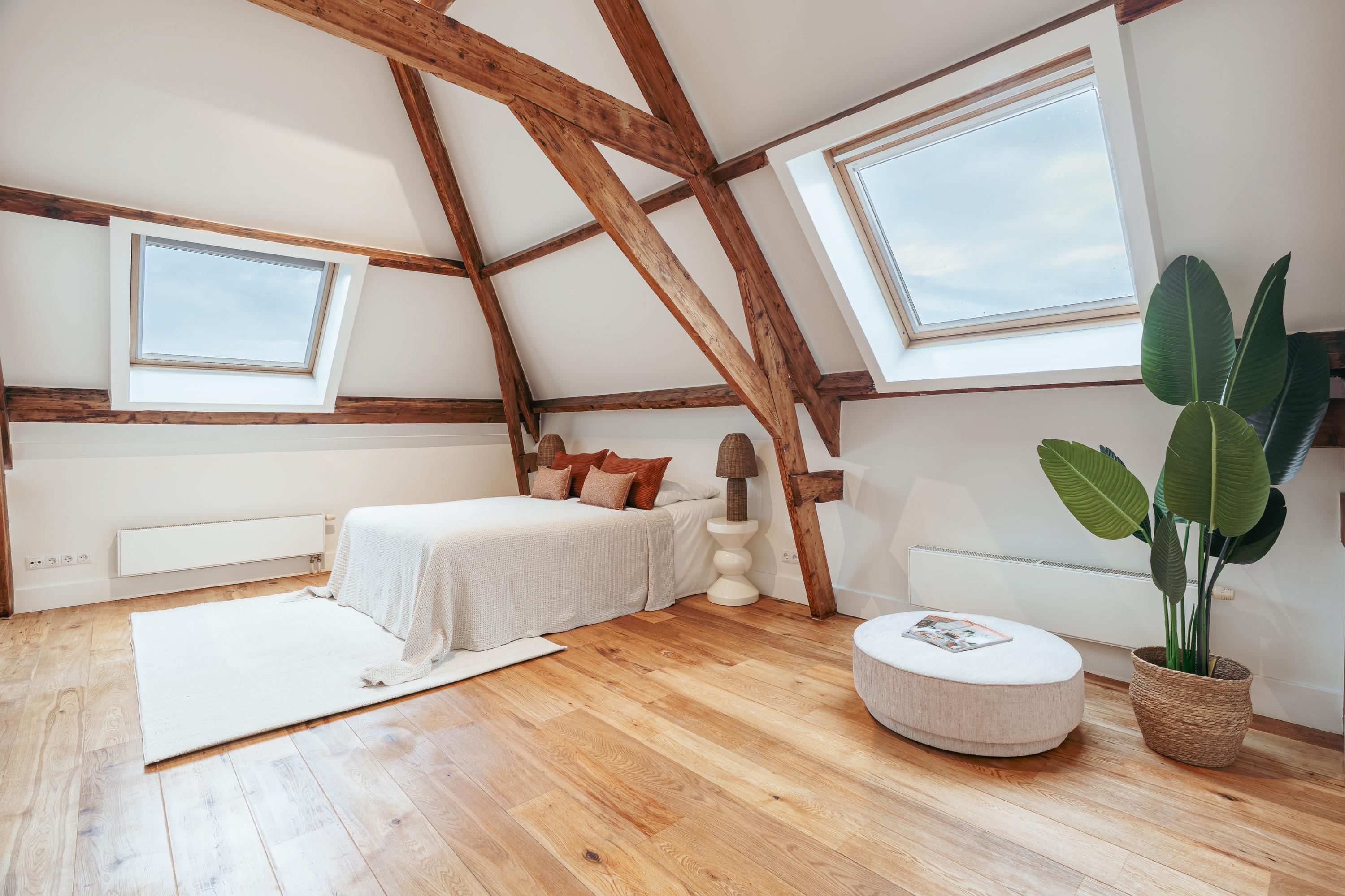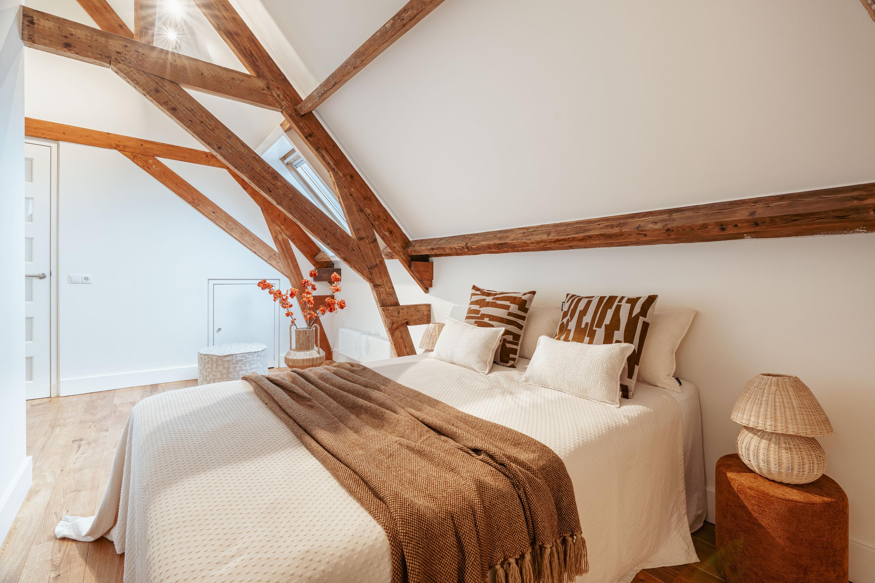 楼上卧室兼顾私密与多功能性,主卧设有带浴缸和淋浴的套间浴室,另一间浴室可由过道进入。房间之间的错层空间为阅读或沉思营造温馨角落,整体收纳解决方案实现空间最大化。所有房间均有裸梁和经典装饰细节。