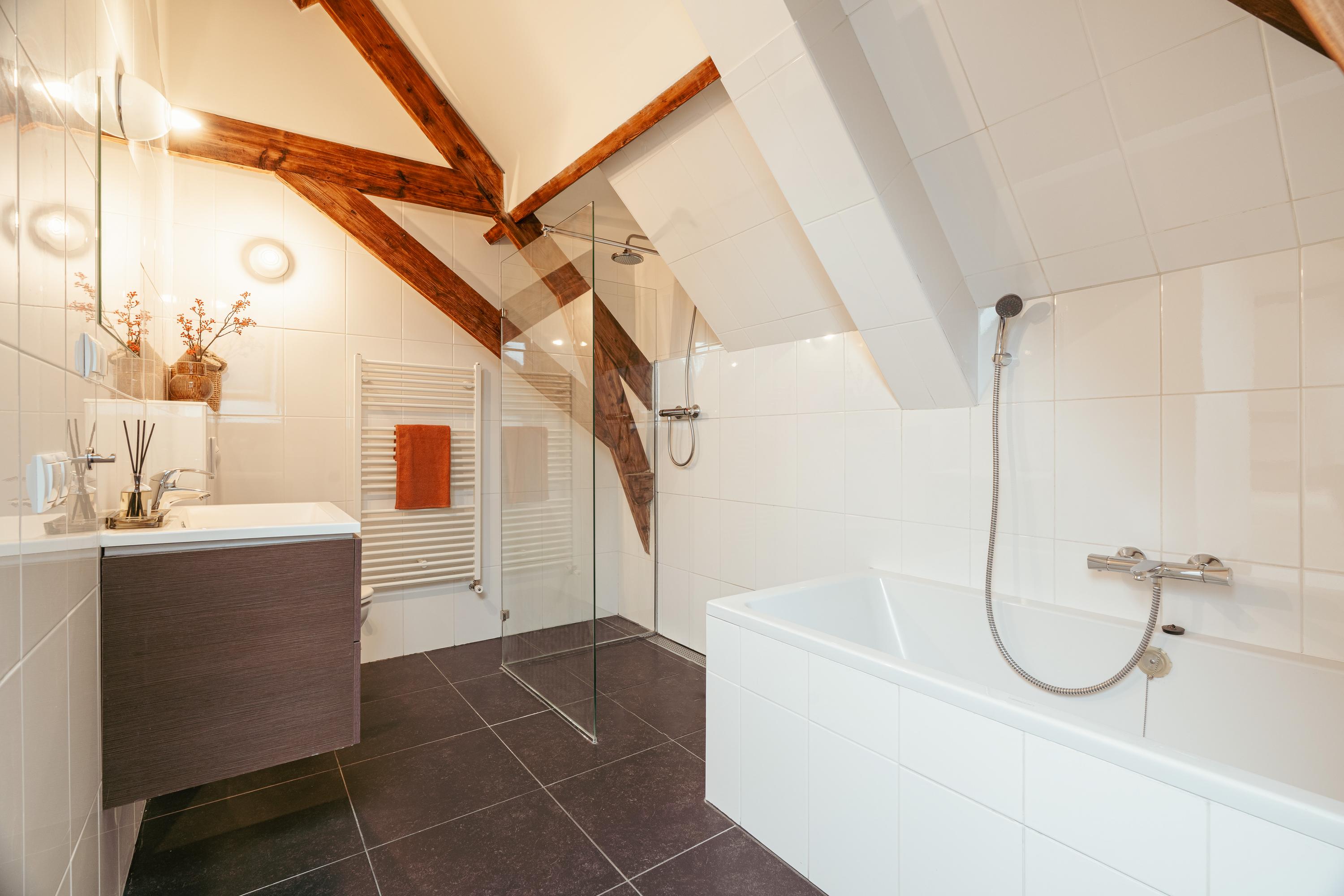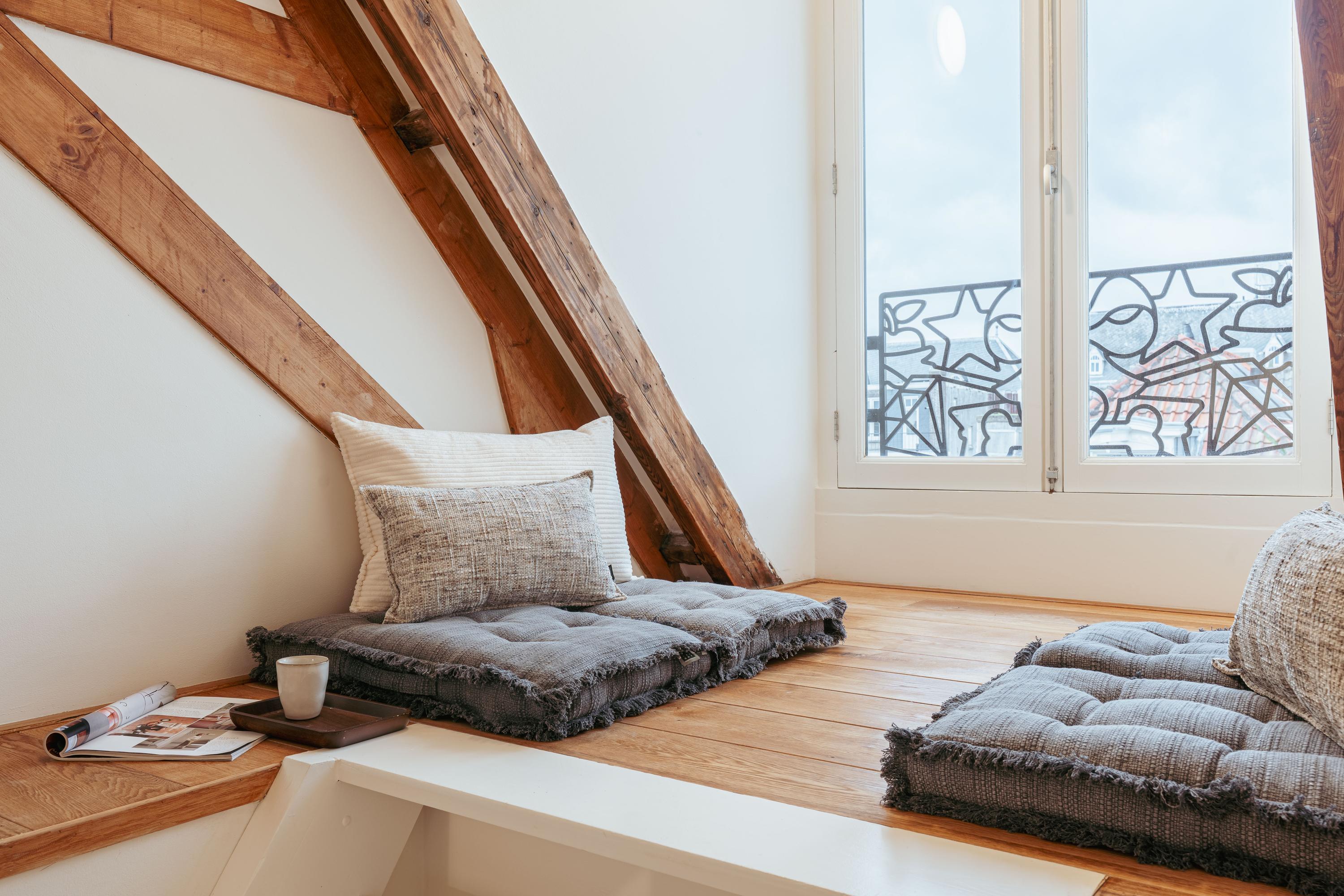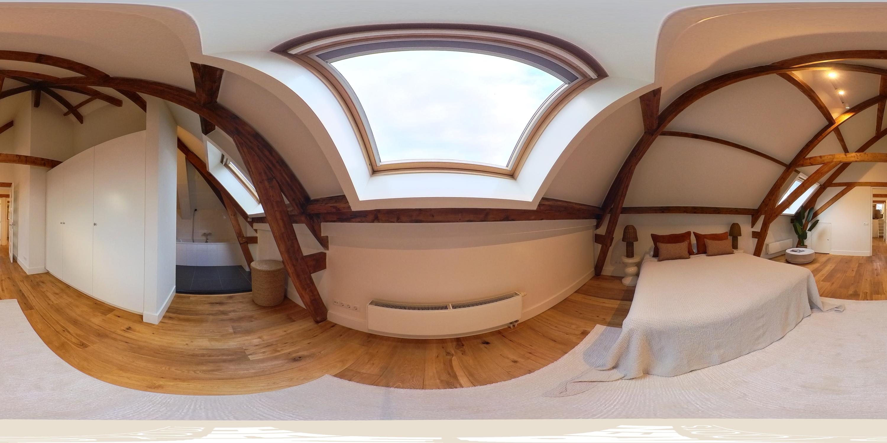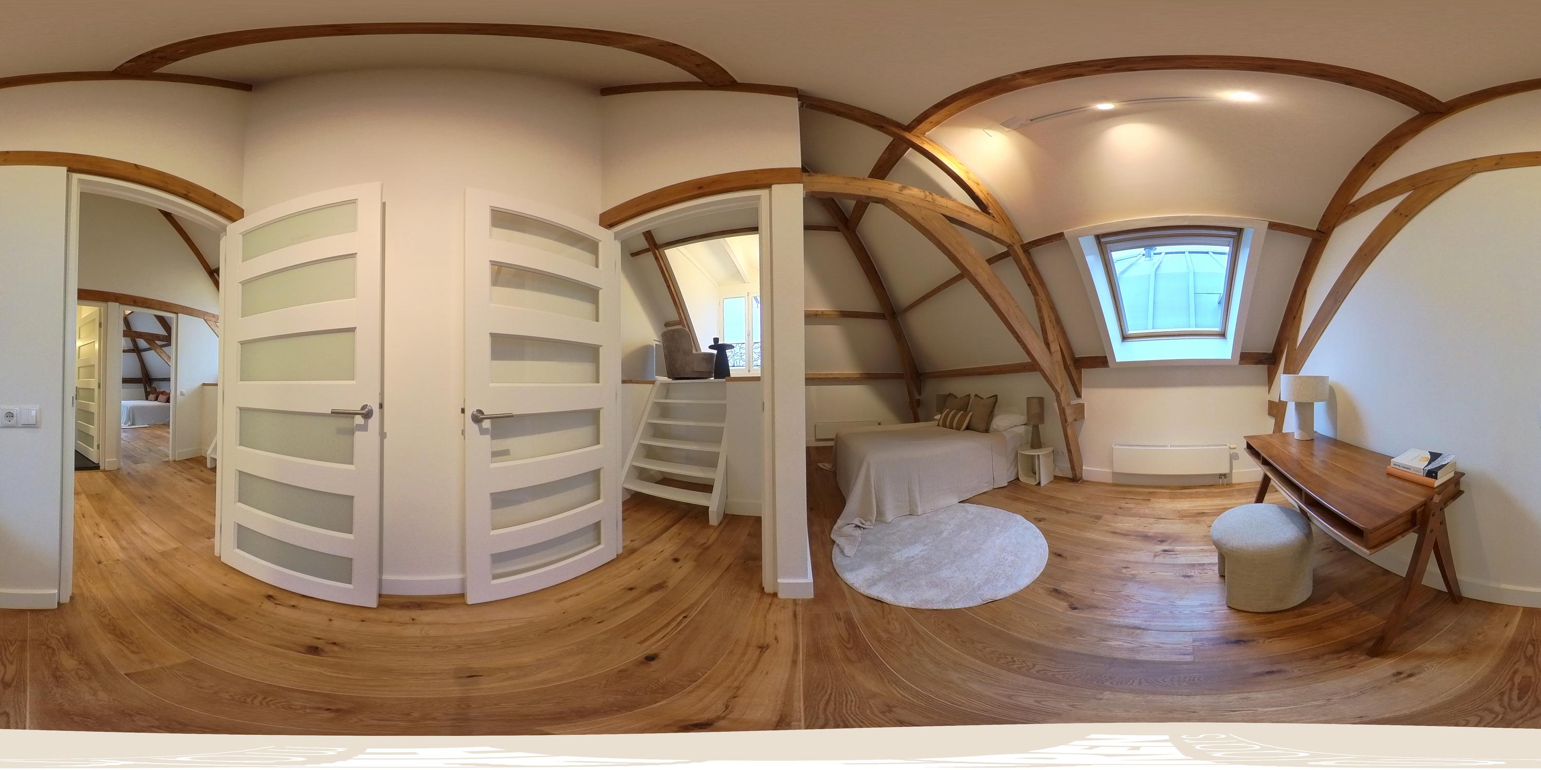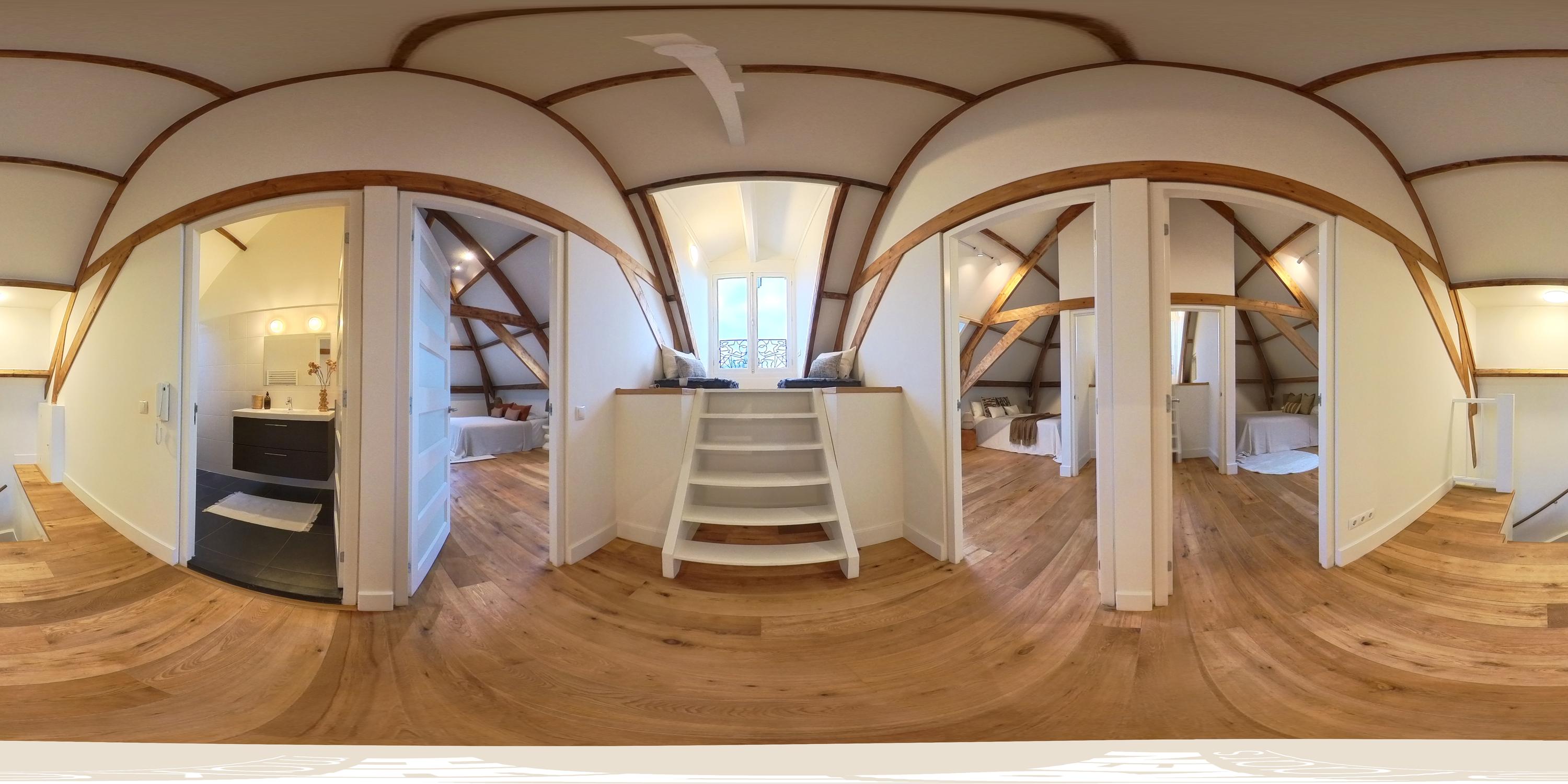 楼上卧室兼顾私密与多功能性,主卧设有带浴缸和淋浴的套间浴室,另一间浴室可由过道进入。房间之间的错层空间为阅读或沉思营造温馨角落,整体收纳解决方案实现空间最大化。所有房间均有裸梁和经典装饰细节。