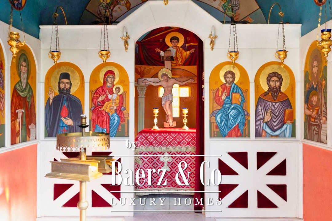 户外,12米x7米的泳池环抱于石砌园林与花园之间,并有高耸的铁质凉棚遮荫。庄园果园由私人水井灌溉,种植着橙树、柠檬、无花果、橄榄与葡萄,覆盖一英亩土地。中央是一座22平方米的小教堂,装饰有大理石圣像屏与湿壁画。双层玻璃窗、燃油供暖、空调、安全门、警报系统和消防系统,为您的安全与舒适保驾护航。这栋待售的Kechries奢华别墅,是一处稀有的静谧居所,兼顾私密与希腊自然风光的联结。